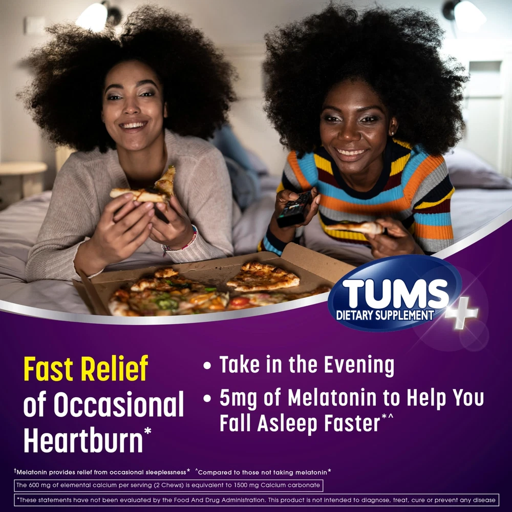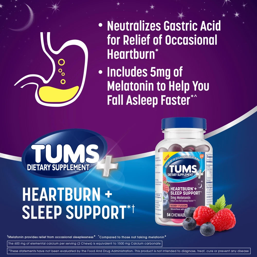 Heartburn Plus Sleep Support Dietary Supplement Chewable Tablets offer fast relief of occasional heartburn and includes 5mg of melatonin to help you fall asleep faster (1,2,3). For occasional sleeplessness, chew and swallow two tablets at bedtime (2,3). Including melatonin 5mg in a two tablet serving, these Heartburn and Sleep Support Tablets relieve occasional heartburn plus help you fall asleep faster (1,2,3). Each serving delivers fast relief of occasional heartburn and comes in a berry fusion flavor (1,3). Heartburn Plus Sleep Support Chewable Tablets are packaged in a compact, resealable bottle that’s easy to stow. Choose Heartburn Plus Sleep Support at home. (1) 600 mg of elemental calcium per serving (2 chews) is equivalent to 1500 mg calcium carbonate (2) Sleep support: Includes 5mg of Melatonin to provide relief from occasional sleeplessness when you have heartburn. Helps you fall asleep faster: Compared to those not taking melatonin (3). (3) These statements have not been evaluated by the Food and Drug Administration. This product is not intended to diagnose, treat, cure or prevent any disease. Contents: 54 Heartburn Plus Sleep Support Chewable Dietary Supplement Tablets for occasional heartburn relief and sleep support, with a Berry Fusion flavor (1,2,3) Relief: This heartburn and sleep support dietary supplement provides fast relief of occasional heartburn and also helps you fall asleep faster (1,2,3) Helps You Sleep: This occasional heartburn and sleep support dietary supplement includes 5 mg melatonin (1,2,3) No.1: is the Number 1 recommended adult antacid brand by doctors, pharmacists and OBGYNs Trusted Brand: has been providing trusted heartburn relief for 90 years Do not consume if pregnant or nursing HSA and FSA eligible product