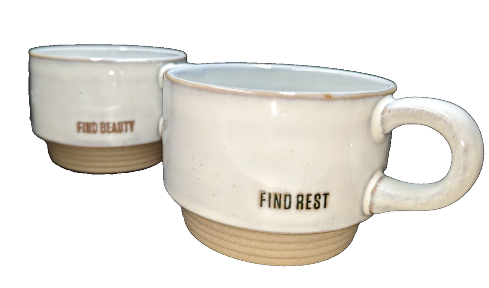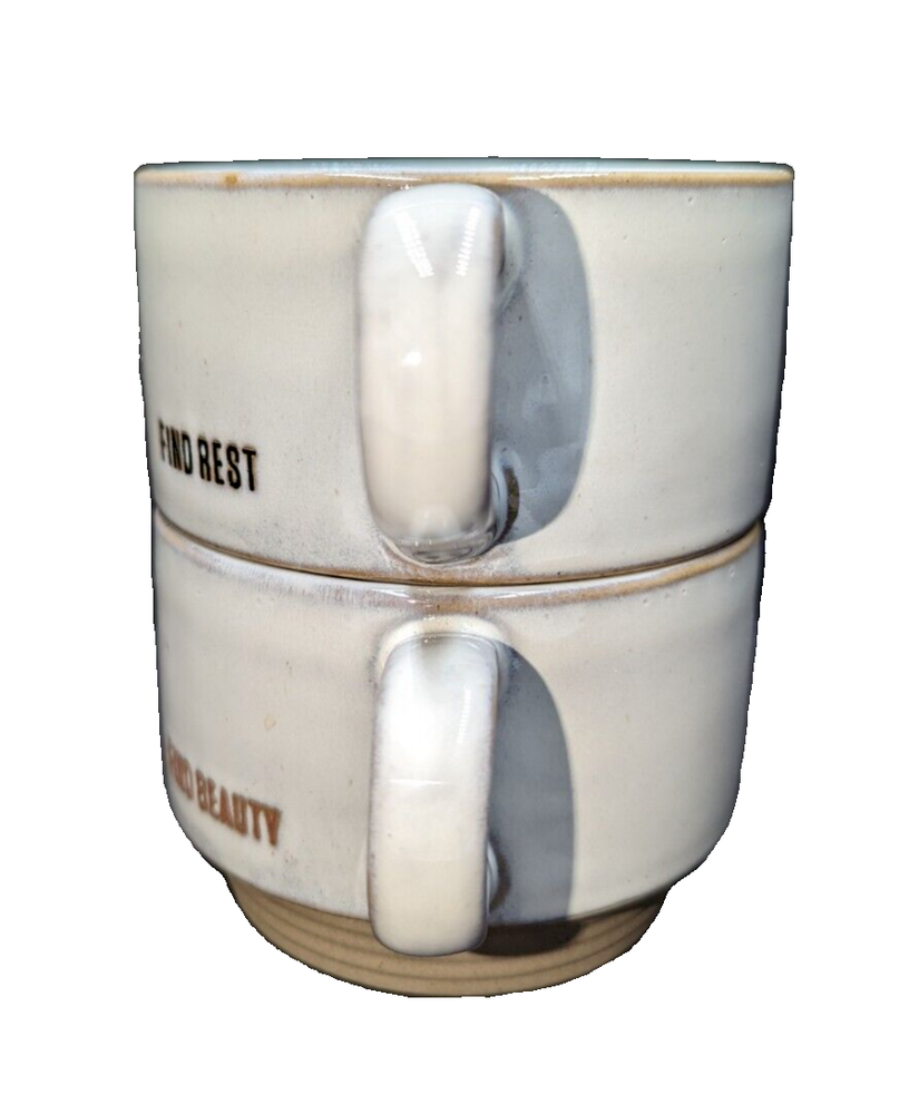 Hearth & Hand Magnolia Find Beauty & Find Rest 10 oz Stackable Stoneware Mug Set. Very nice pre-owned condition. No chips, cracks or breaks, almost no signs of prior use. Please see the photos for reference. All of my items are carefully packed for shipping, no matter their value - $5 items are wrapped with the same care as a $200 item. My goal is to have your purchase arrive safely. Large, heavy and fragile items are harder to use combined shipping with but just ask if you would like to purchase more than one item and I am more than happy to do so if feasible. Measurements are approximate or as close as I can get. Also, the color you see many not be the exact color depending on your computer or phone settings. Unpaid items will result in the buyer being blocked from further purchases. Please remit payment right away so we can get your item shipped out quickly.