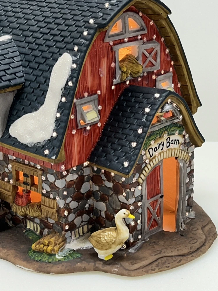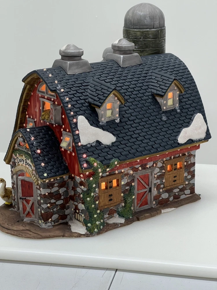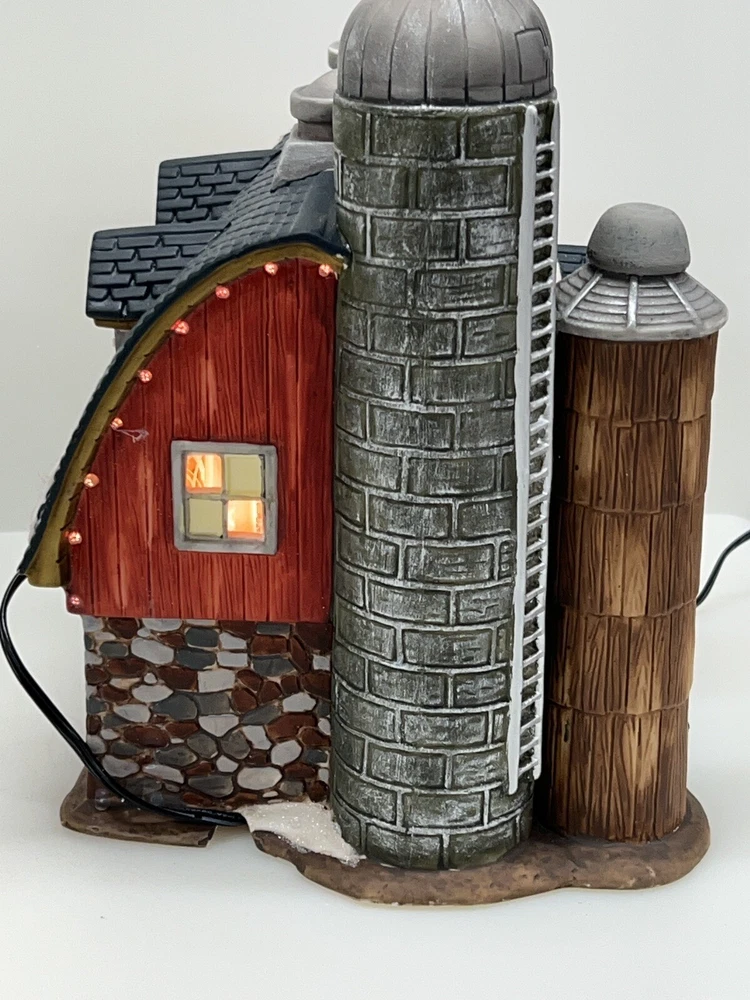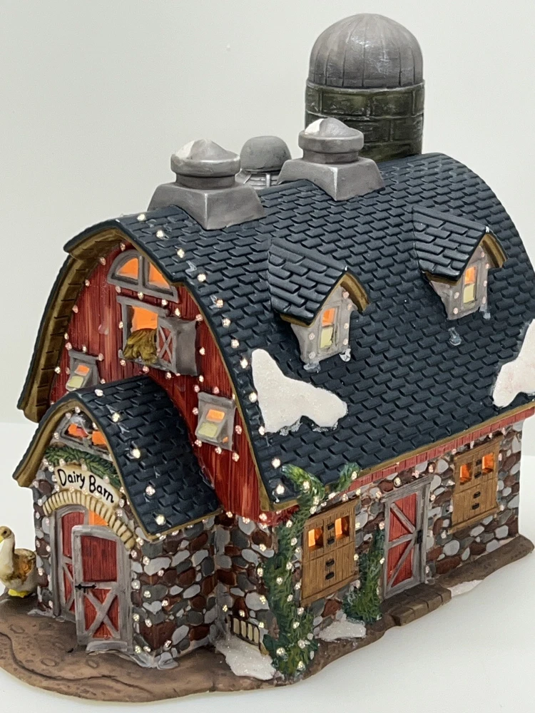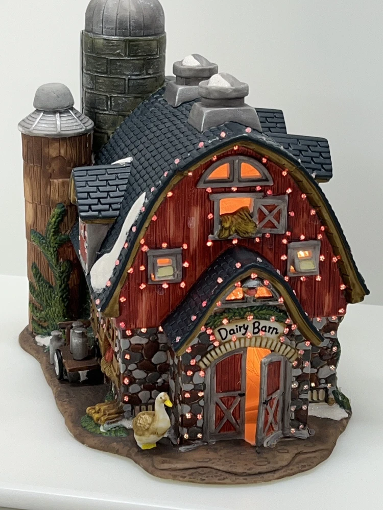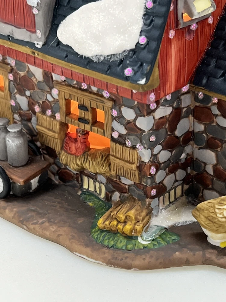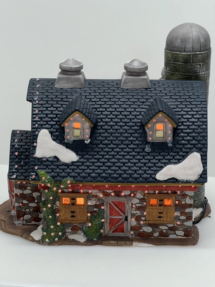 The Heartland Valley Fibre Optic Barn O'Well 2005 is a medium-sized, hand-painted porcelain Christmas village Barn featuring a whimsical red barn design. It is illuminated with color-changing lights, creating a 3D effect. Suitable for seasonal display in any room, this American-style piece from the Heartland Valley Christmas Village collection is a retired item. It includes a charger cord and is ideal for adults who enjoy collecting lighted houses and Barns . Excellent condition! No original box , comes with cord & light .