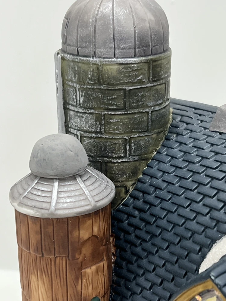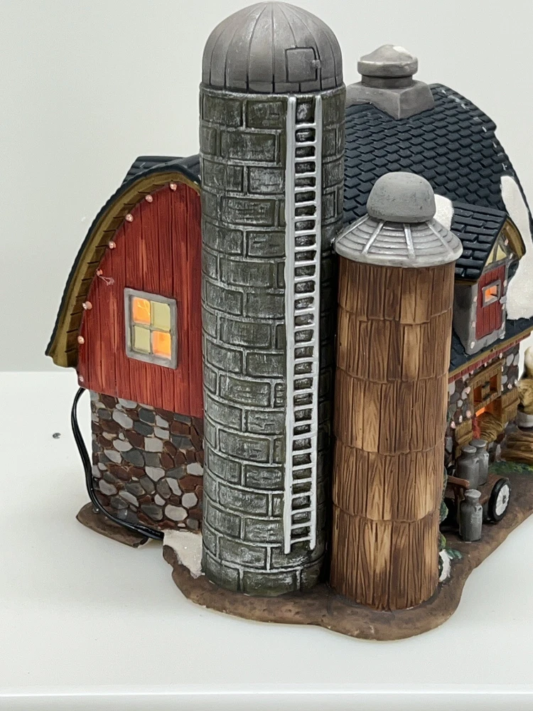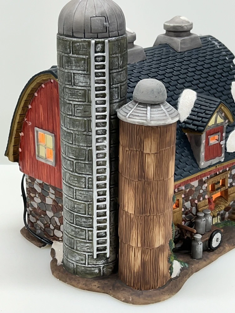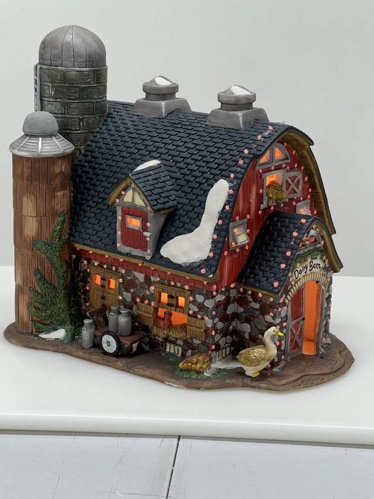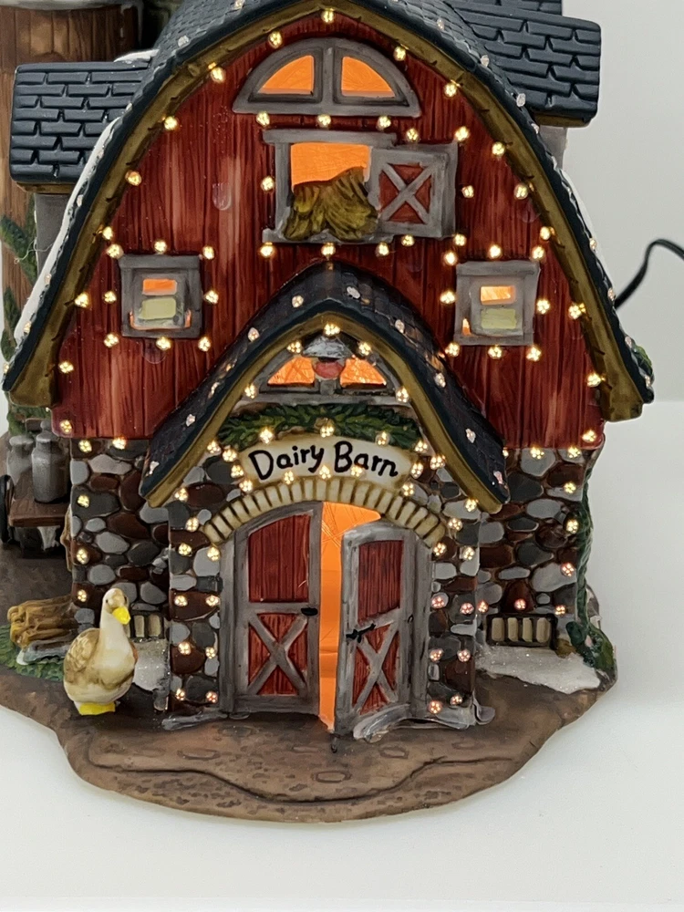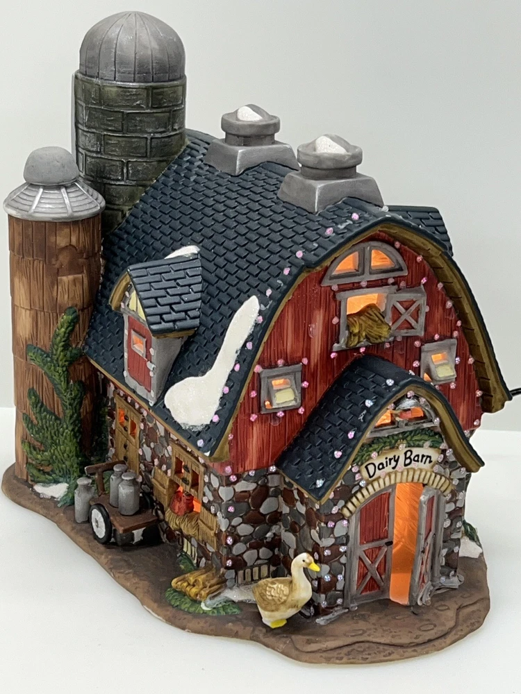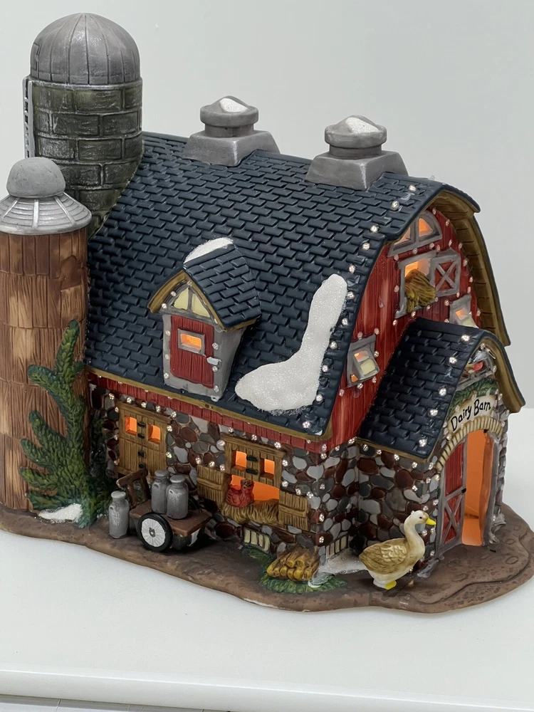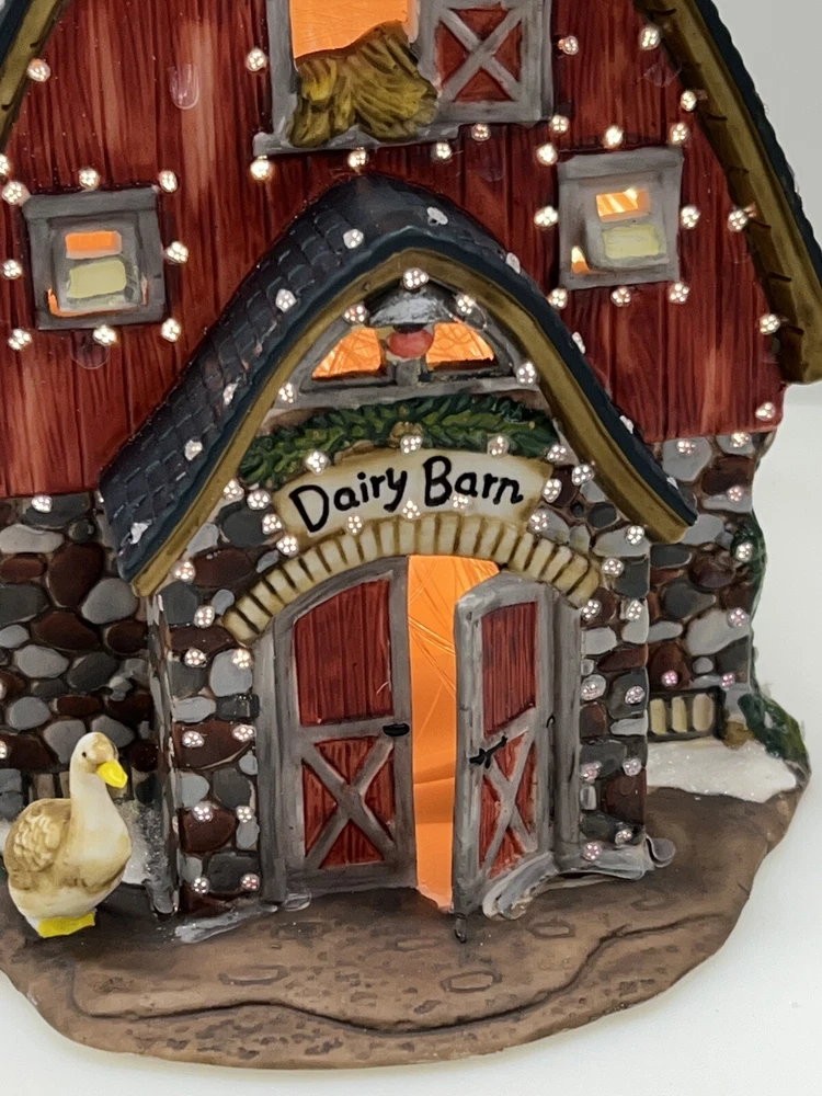 The Heartland Valley Fibre Optic Barn O'Well 2005 is a medium-sized, hand-painted porcelain Christmas village Barn featuring a whimsical red barn design. It is illuminated with color-changing lights, creating a 3D effect. Suitable for seasonal display in any room, this American-style piece from the Heartland Valley Christmas Village collection is a retired item. It includes a charger cord and is ideal for adults who enjoy collecting lighted houses and Barns . Excellent condition! No original box , comes with cord & light .