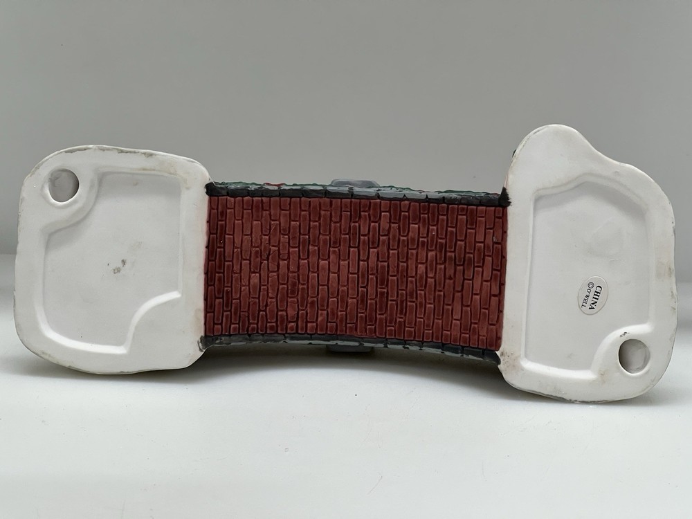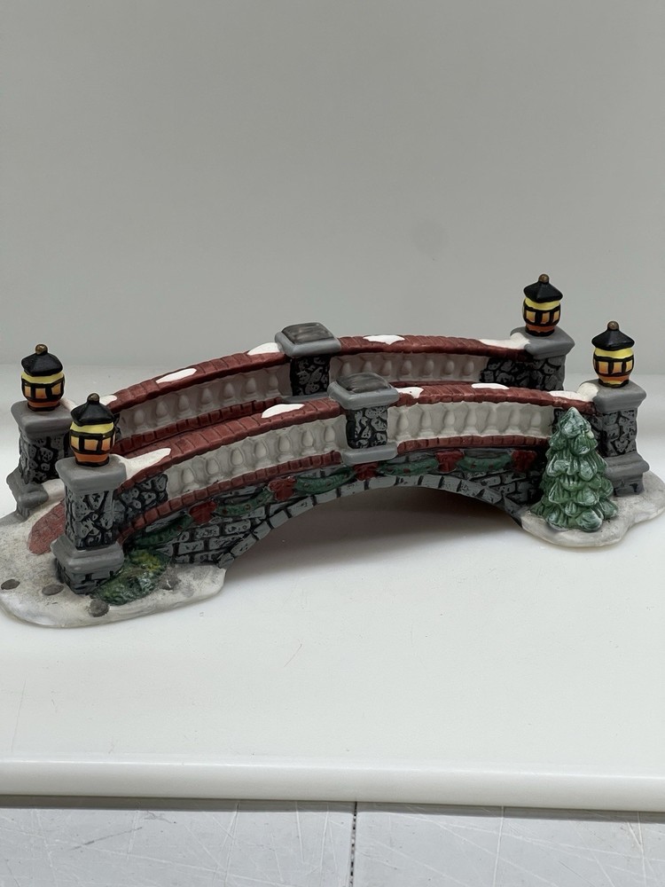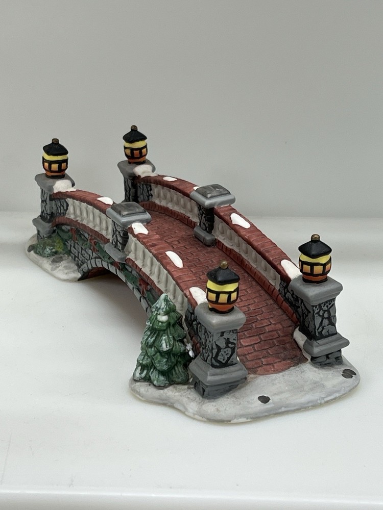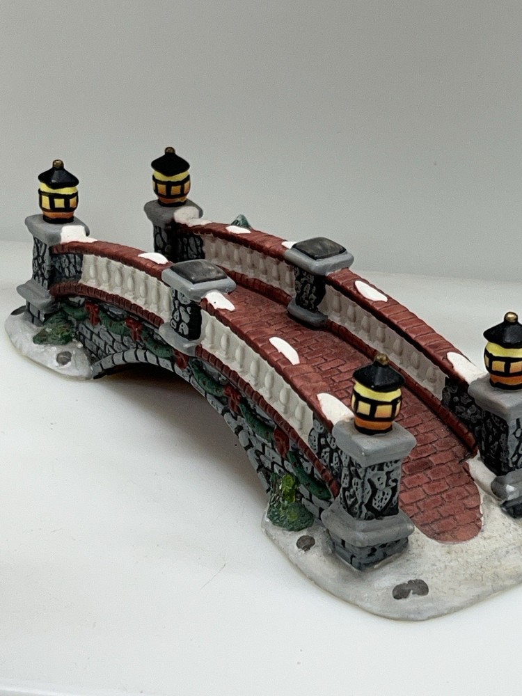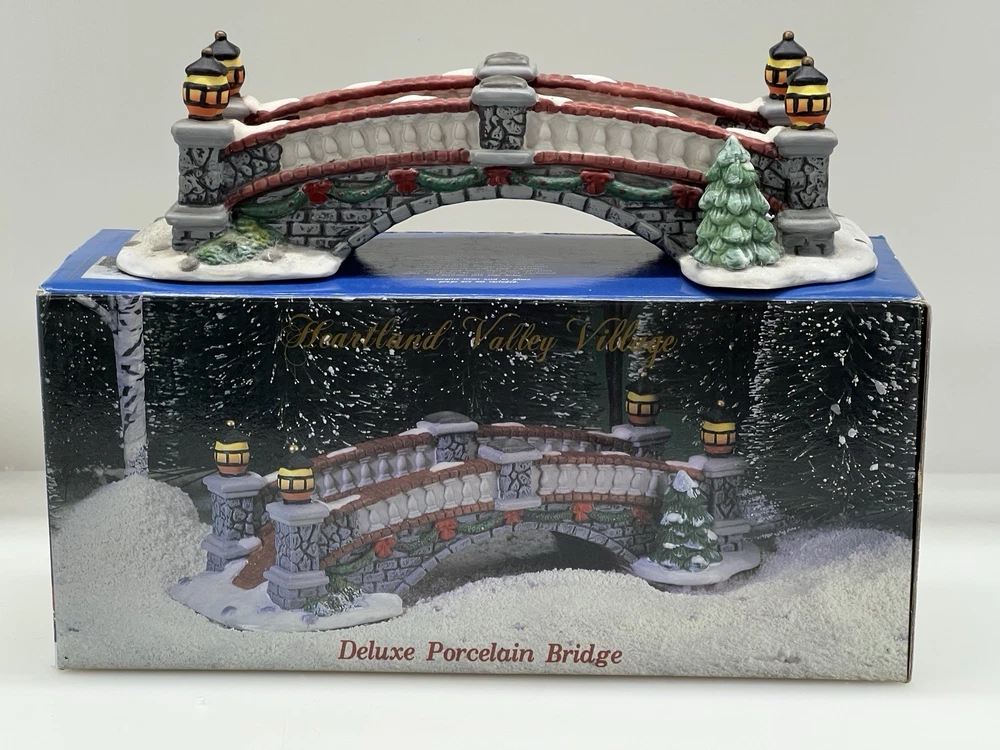 The product is a Heartland Valley Village Deluxe Porcelain Bridge that comes in its original box with Styrofoam. It is a Christmas Village item that is 3 inches in height, 9-1/2 inches in length, and 3 inches in width. The bridge is made of porcelain and is shaped like a bridge. It is an original piece in excellent condition!