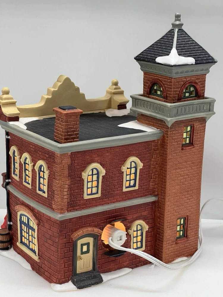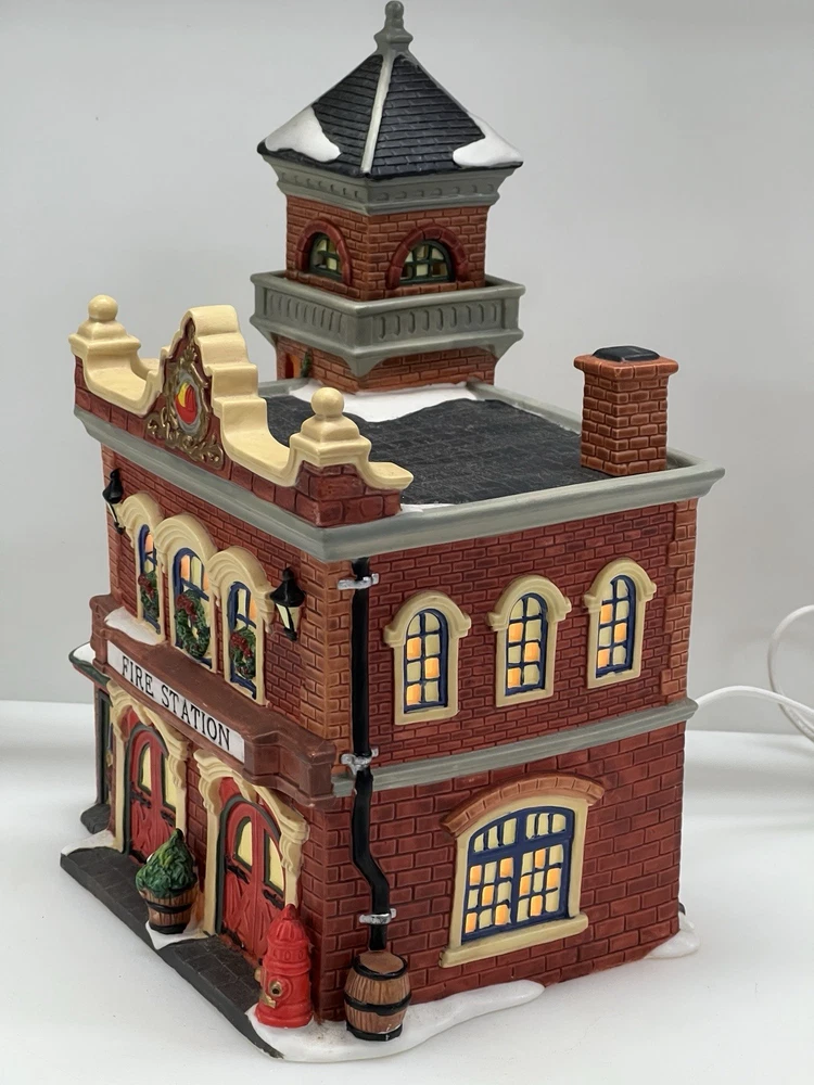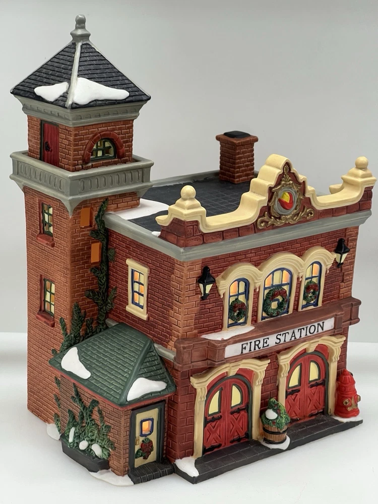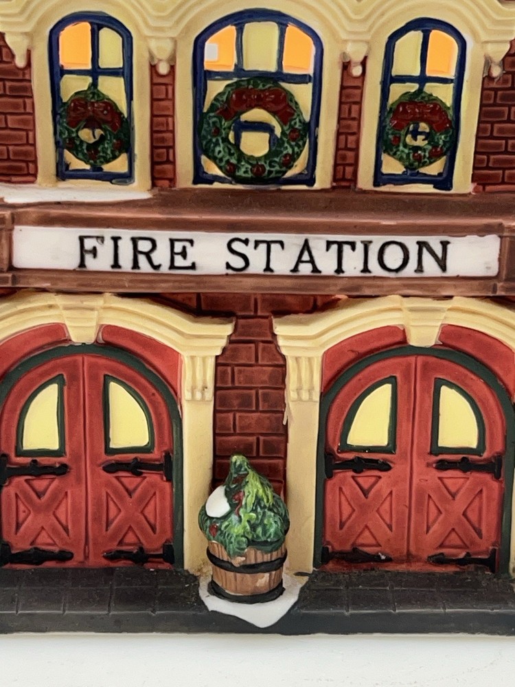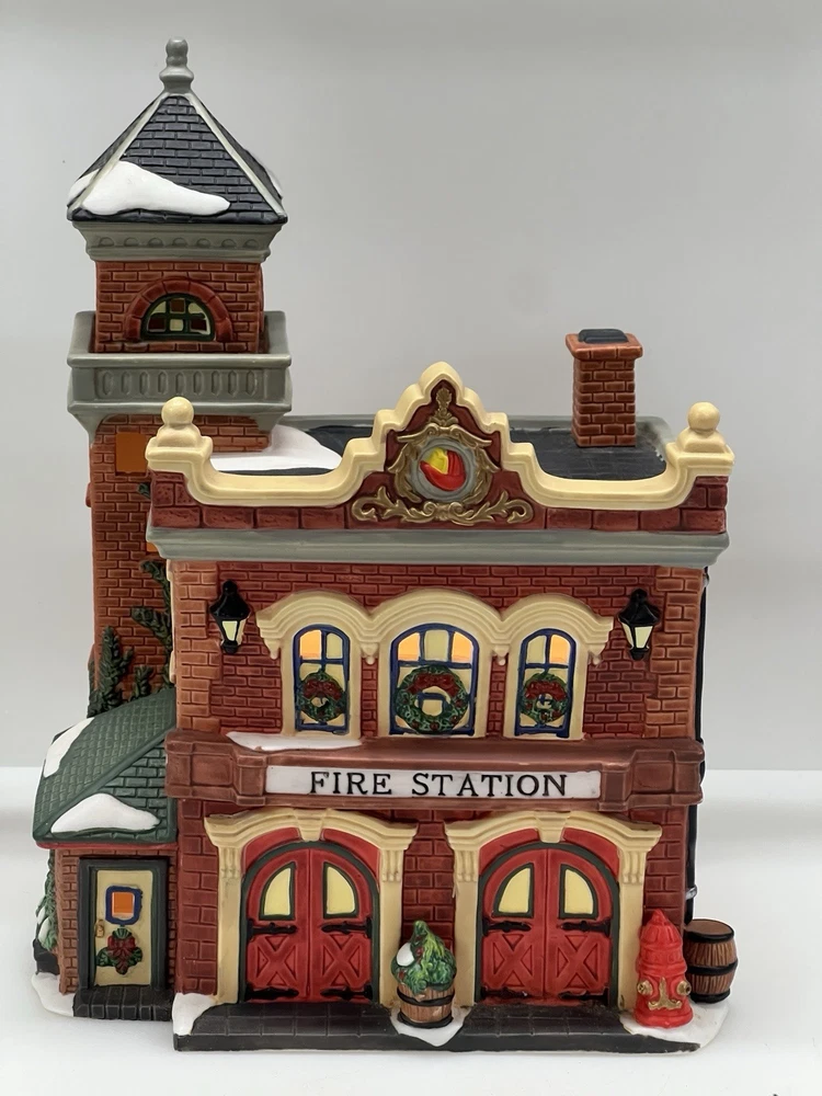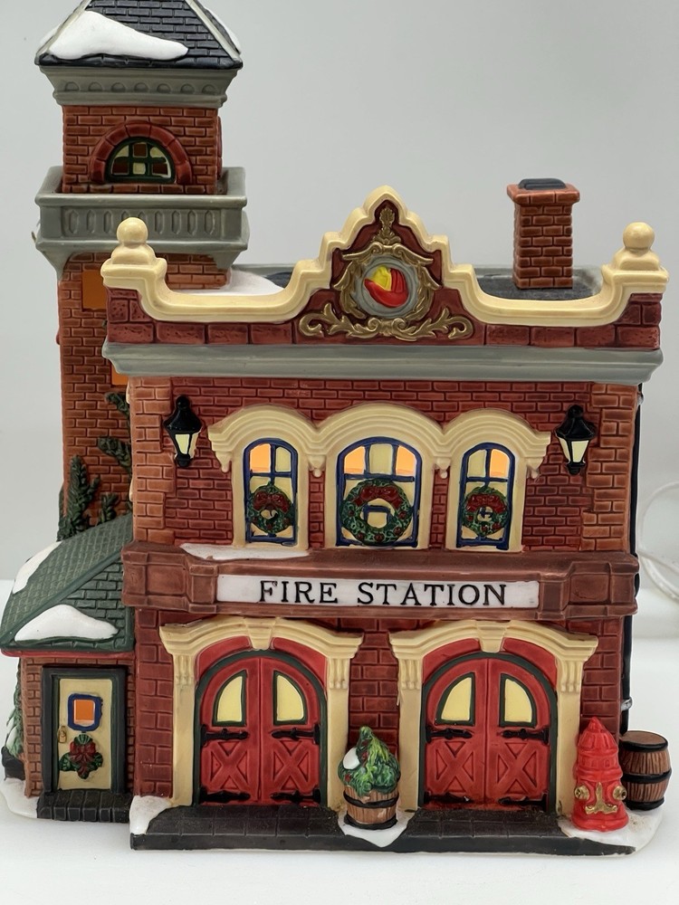 The Heartland Valley Village Fire Station 1999 O'Well Deluxe Lighted is a medium-sized porcelain Christmas village house from the late 20th century. It features a traditional style with a whimsical pattern, depicting a fire station with multicolor illumination. This collectible item, part of the Heartland Valley Village collection, is suitable for decoration in any room during the festive season. The hand-painted and boxed piece adds a charming touch to holiday decor with its asymmetrical shape and fire-themed design. Excellent condition! Comes with all original packaging including cord & light . Outer packaging sleeve has been taped