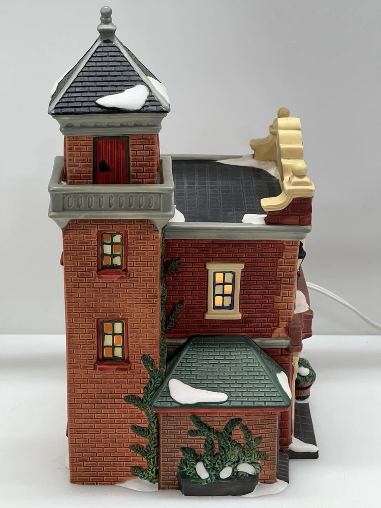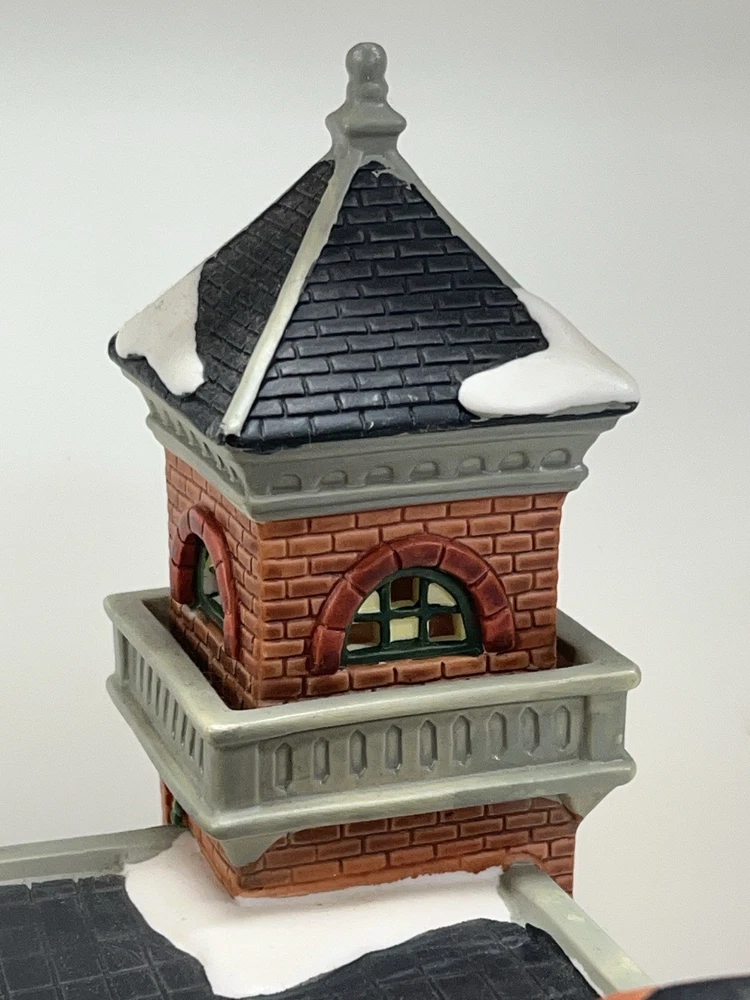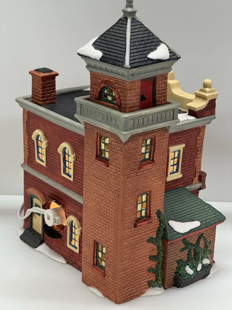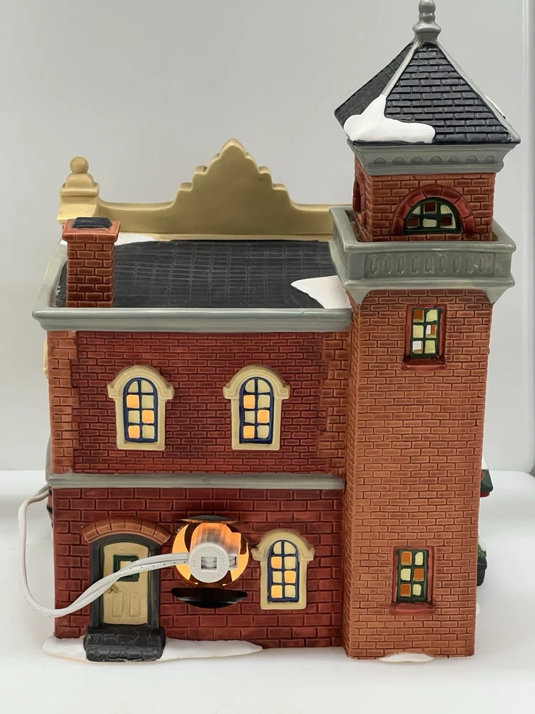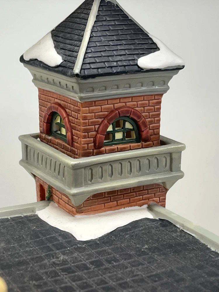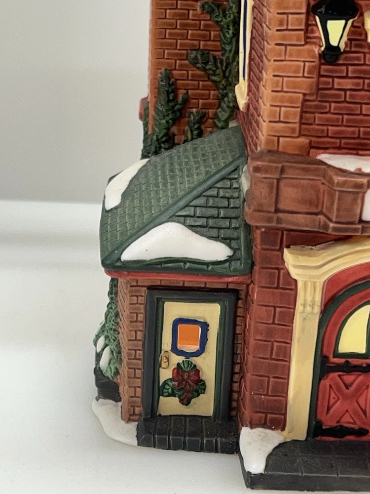 The Heartland Valley Village Fire Station 1999 O'Well Deluxe Lighted is a medium-sized porcelain Christmas village house from the late 20th century. It features a traditional style with a whimsical pattern, depicting a fire station with multicolor illumination. This collectible item, part of the Heartland Valley Village collection, is suitable for decoration in any room during the festive season. The hand-painted and boxed piece adds a charming touch to holiday decor with its asymmetrical shape and fire-themed design. Excellent condition! Comes with all original packaging including cord & light . Outer packaging sleeve has been taped
