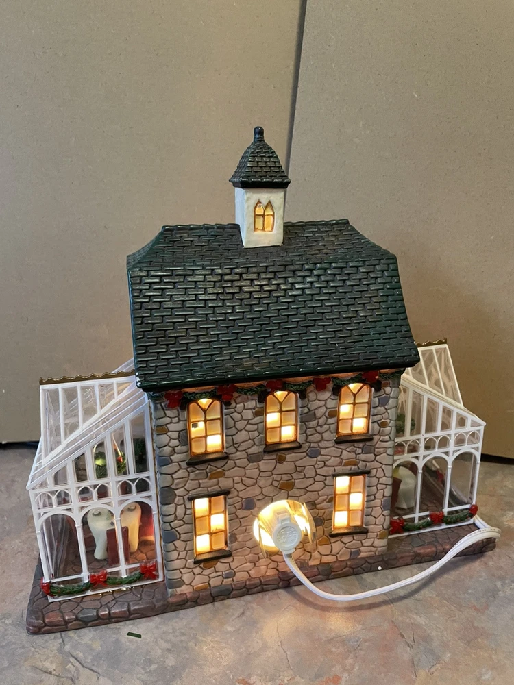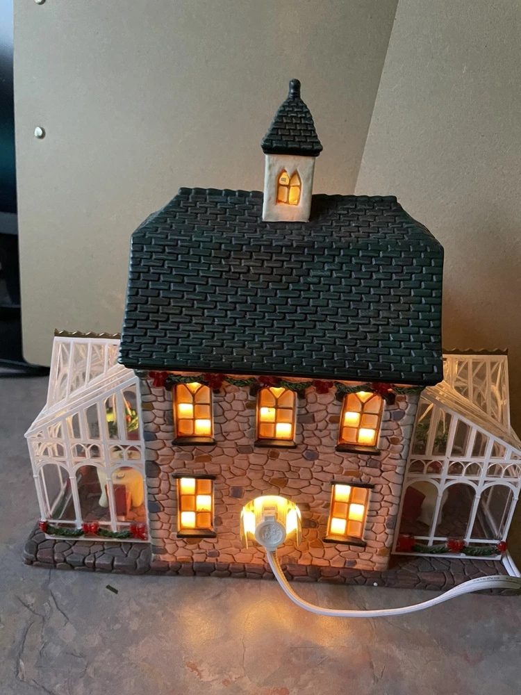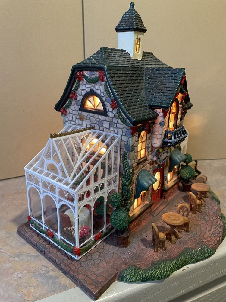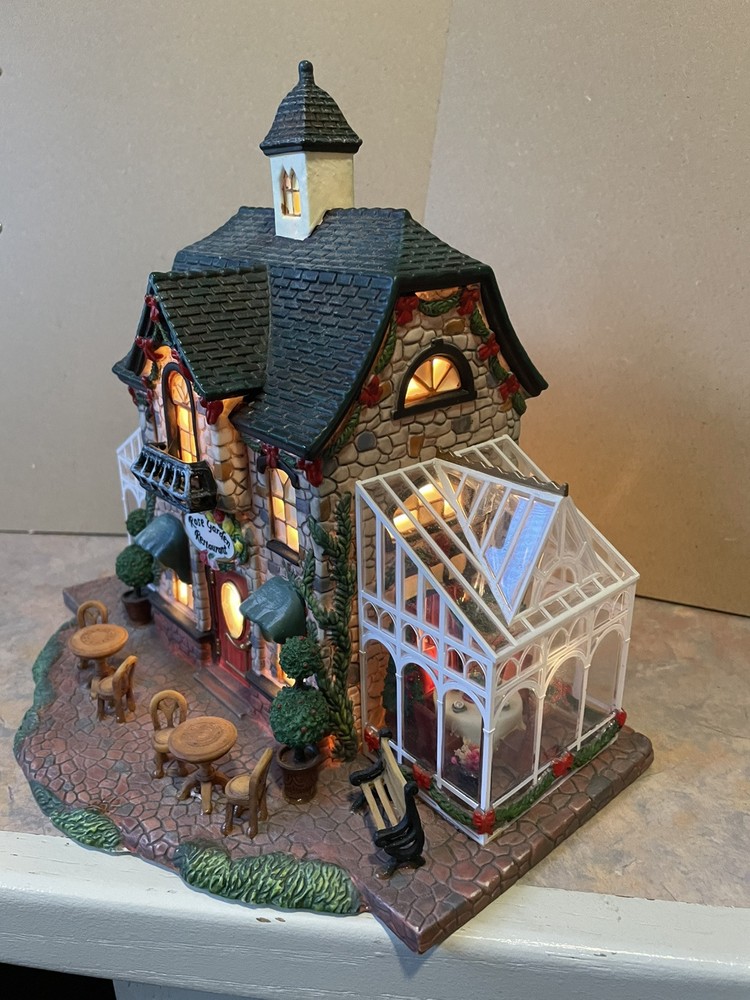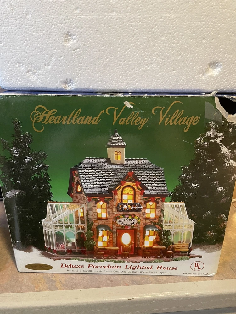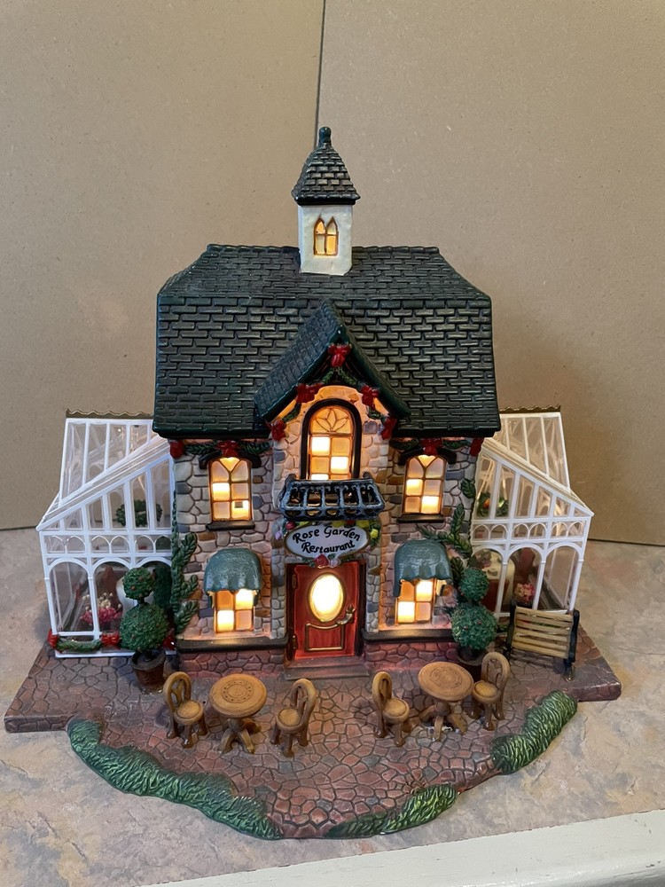 Heartland Valley Village ROSE GARDEN RESTAURANT is a limited edition 2004 O'Well Christmas lighted house. This house is in excellent condition to add to your collection! The Rose Garden Restaurant features a cobblestone building decorated with pine boughs and red ribbon with glass sunrooms on both ends with hanging wreaths and tables and chairs. Handmade and boxed, it measures 10" in length, 8 3/4" in height, and 6 1/2" in width. Perfect for Christmas decor, it is suitable for any room and weighs over 4 lbs. Please note that the styrofoam packing is in good condition but the box is torn and taped.