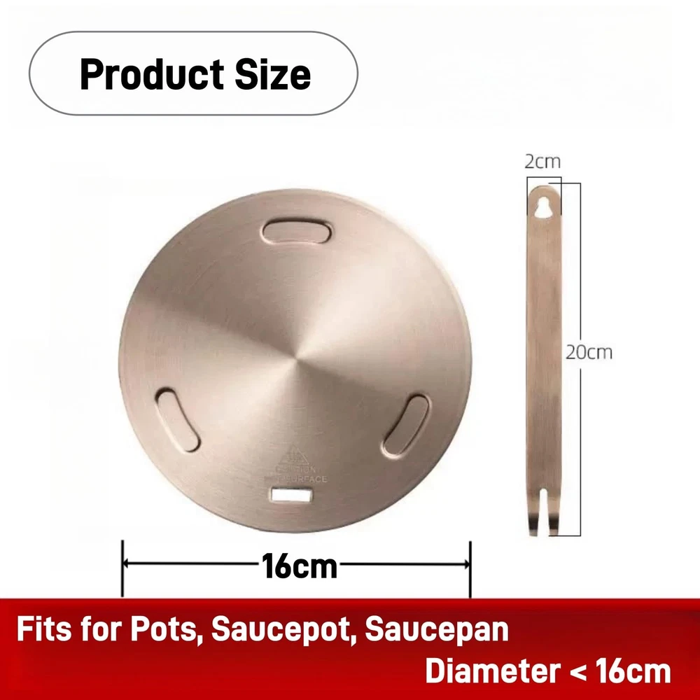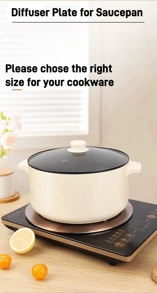 NOTE: 1. Please make sure to measure your pan/pot before purchase diffuser plate. 2.The heat-conducting plate is only for open flame stoves. Avoid excessive heat conduction, and do not burn the heat-conducting plate alone! 3.After the heat transfer plate stops heating, there is still residual heat, do not touch it directly! 4. Heat transfer sound and yellowing of disk can occur for this product from normal usage 5. Please keep the child away from plate when use it. Sturdy Material: Diffuser plate is made of solid metal that also allows you to use many different kinds of pots and pans with an induction gas stove that you normally would not be able to use Great Addition: Heat diffuser helps the heat from the gas flame distribute more evenly and completely along the bottom of the pan heat up faster and cook food with a different taste Attractive Design: This gold induction cooktop adapter looks good while fitting securely on the burner.helps save the bottom of your pan from those scorched spots Detachable Handle: The handle is convenient, super easy to put on and remove for storage, and it barely takes up any space, you can also take it comping with you, it packs anyway flat Important: Pay attention to the engraved via embossed sides make sure the converter disk is completely touching the induction surface and flat connection