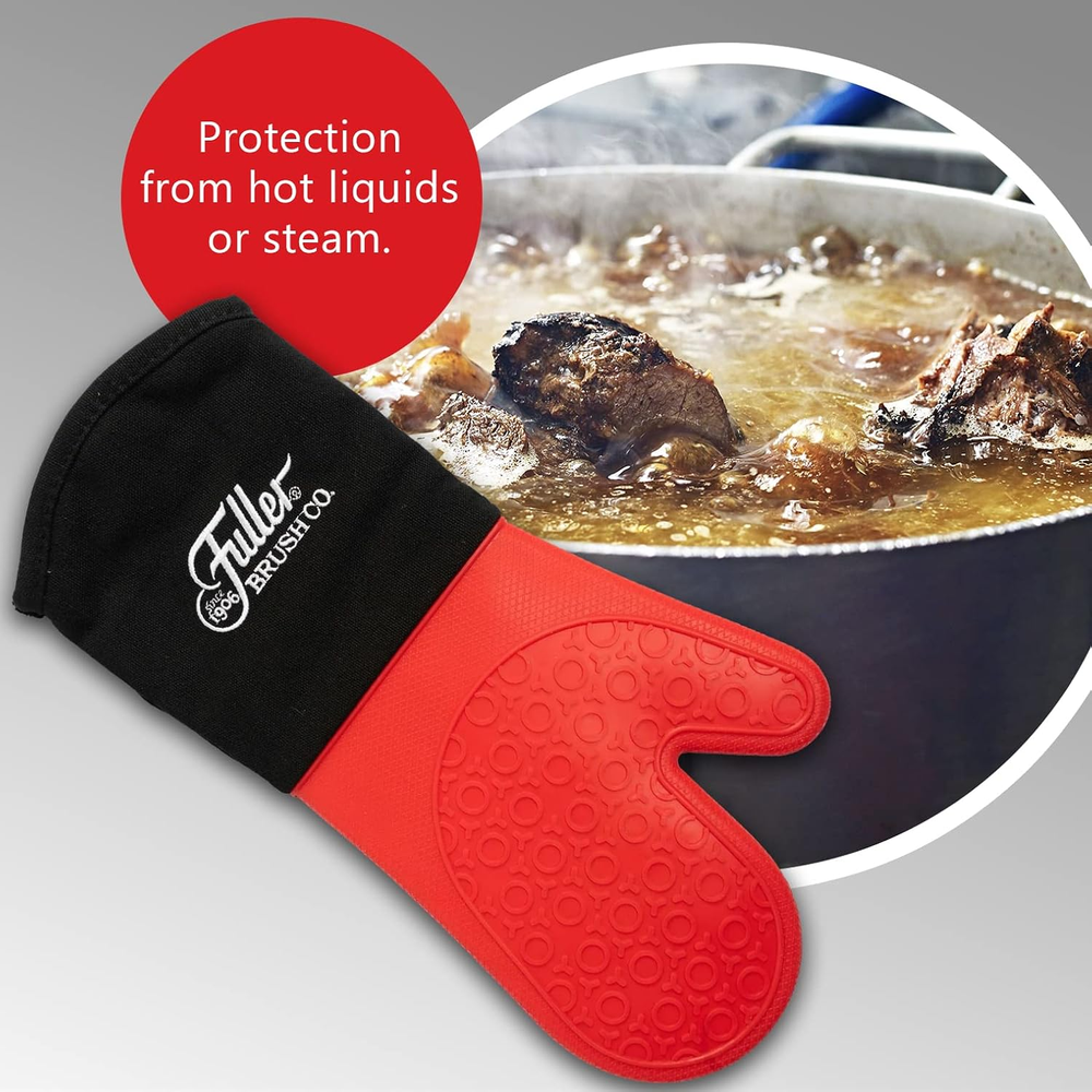 Silicone Oven Glove PROTECTION WHEN YOU NEED IT: Fuller Brush Silicone Oven Glove protects your hands and forearm from the hottest plates, pans, dishes, oven grates and more. The non-slip textured red silicone exterior provides a sturdy grip and heat resistance to 500 degrees. BEST DESIGN EXTRA LONG SLEEVE: The extra-long black sleeve extends additional distance up your arm for better protection on your wrist and forearm area. Glove measures over 14 inches in total length. EXTRA COMFORT: Fuller Brush Silicone Oven Glove is designed with an insulated quilted soft interior for added comfort and lined with polyester for extra durability. Glove can be used with right or left hand for convenience. MULTIPLE USES: In addition to protecting your hands and forearm around the oven, toaster and stovetop, this Silicone Oven Glove provides stylish protection while grilling with a barbecue or cooking with an outdoor smoker or pizza oven. TRUSTED BRAND: Since 1906, Fuller Brush has provided high quality, American-made products and unique imported products following Fuller’s strict quality specifications, which are designed to work and built to last. Whether you’re looking for cleaning tips or the specific cleaning products to do the job, Fuller Brush has you covered! Product Description Your Cleaning Supply Experts. Fuller Brush is focused on providing modern remedies for today's cleaning needs. With more than 115 years of cleaning experience, we have the know-how and expertise to provide you with cleaning supplies to make home cleaning much faster, better and easier. Using high-quality materials and expert construction, Fuller Brush offers a complete line of distinct, top-quality cleaning products. No matter what your cleaning needs are – whether you're looking for cleaning tips or the specific cleaning products to do the job – Fuller Brush has you covered! Protection From Heat Tired of wondering if a hot pad or short silicone glove will protect your hand and forearm? Many silicone mitts or gloves barely cover your hand to the wrist, which make it difficult to carry large plates or dishes with confidence. Fuller’s Silicone Oven Glove makes it easy to protect your hand and forearm from the hottest plates, pans, dishes, oven grates and more. The one-piece red silicone area protects your hand on both sides with heat resistance to 500 degrees. And, the extra-long Glove at 14.5 inches in total length helps protect your forearm when reaching into the oven or carrying large hot items. Quality Construction With Comfort Tired of losing your grip on a very hot pan or heavy casserole dish? The non-slip textured silicone exterior provides a secure and sturdy grip. The insulated quilted soft interior provides comfort and extra protection from the fingertips all the way up the forearm black cuff area, while the polyester lining provides extra durability. The Glove can be used with right or left hand for convenience. Fuller Brush Silicone Oven Glove Better Protection Every cook needs the protection offered by the Fuller Brush Silicone Oven Glove. Removing hot dishes and pans from the oven can be risky when using square potholders. Your hand can slip and contact the hot pan and your forearm is exposed to hot oven racks. Hot liquids and steam can cause burns when passing through or around fabric hot pads. The Glove’s one piece red silicone area covers your entire hand and will not allow hot liquids or steam to reach your hand, and the black cuff area covers your forearm to provide protection from steam while draining boiled pasta, potatoes or vegetables. Barbecue With Style Looking for heat protection while grilling with the barbecue, smoking meats or cooking with the pizza oven? This stylish Fuller Brush Silicone Oven Glove will protect your hand and forearm from the heat and flare-ups while flipping your favorite barbecue food on the grill or removing pizza from your outdoor oven. Conveniently hang this Oven Glove with the built-in hang-up loop. Over 115 Years Of Excellence Since 1906, Fuller Brush has provided high-quality products that are designed to work. Each product is made with the highest quality workmanship under strict quality standards. Whether you're looking for household or cleaning products, hairbrushes or personal care lotions, Fuller Brush has you covered. Item model number 55053-FB Item Package Quantity 1 Color Red Shape Hand Item Weight 5.9 ounces Outer Material Polyester, Silicone Fill Material Polyester Number of Pieces 1 Product Dimensions 14.5"L x 14.5"W Product Care Instructions Machine Washable. Avoid high heat settings. Air dry. 14.5 "w x 14.5 "w. Weight: 5.9 oz Shipping from the USA All of our products are shipped from the USA, ensuring quick delivery to your destination. Payment We offer the following payment methods: PayPal, credit card, bank transfer, and eBay's secure payment system. Free Shipping & Free Returns Shipping within the USA is FREE. Additionally, any return is absolutely free for you. Risk-Free Purchase You have the option to return an item within 30 days without any justification. We cover the return shipping costs! Fast Shipping We ship immediately upon receipt of payment. Generally, the package is delivered within 2-3 days in the USA. If it takes longer, we will contact you. Quality and Costs Made in Europe, USA, China No customs fees or additional charges Total satisfaction guarantee Invoice with declared VAT available upon request in .pdf format Feedback Your feedback is very important to us. After you pay for your purchase, you will automatically receive positive feedback from us.