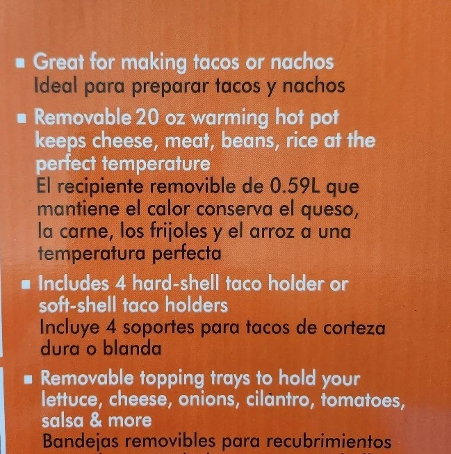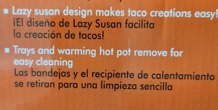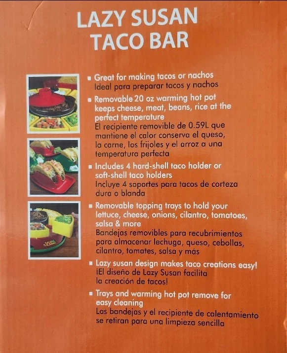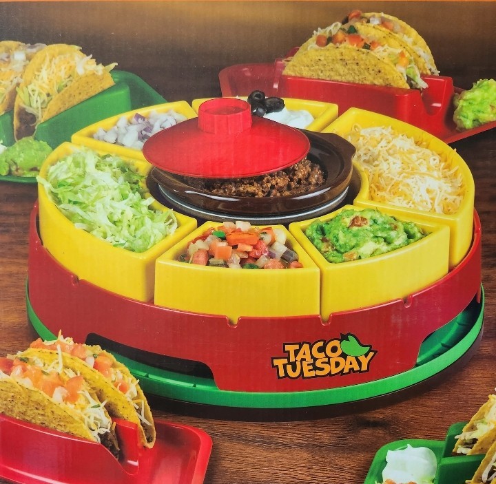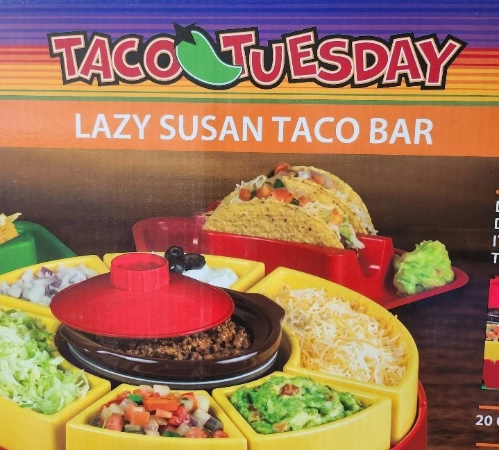 This is a new Lazy Susan Taco Bar Serving Set that comes with four tortilla holders and six topping trays. The set includes a melting pot and has a 20-oz size. It features a solid pattern and a round shape. The set is perfect for hosting parties and serving snacks. The color is multicolor and the material is plastic. Brand new item in an unopened , sealed box.