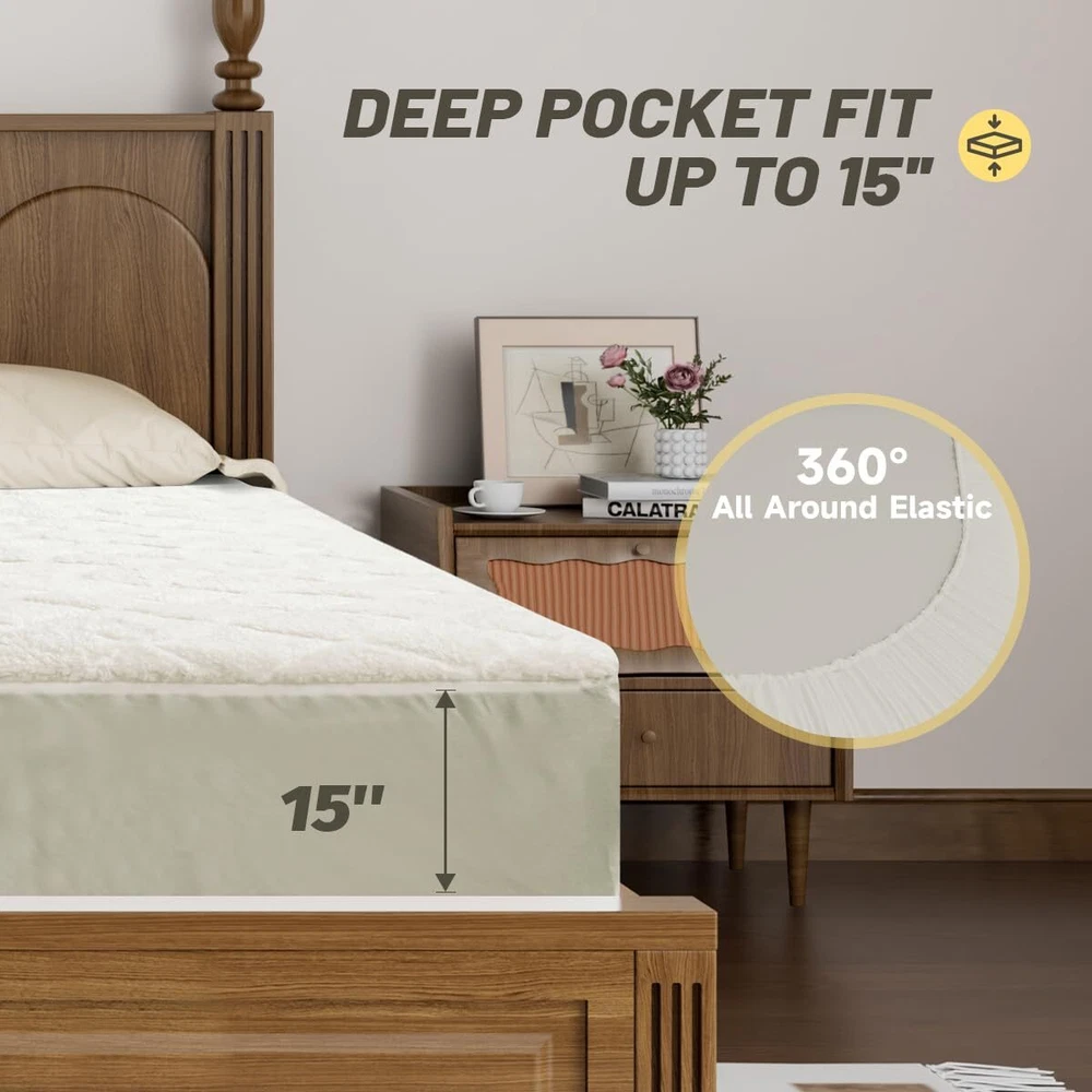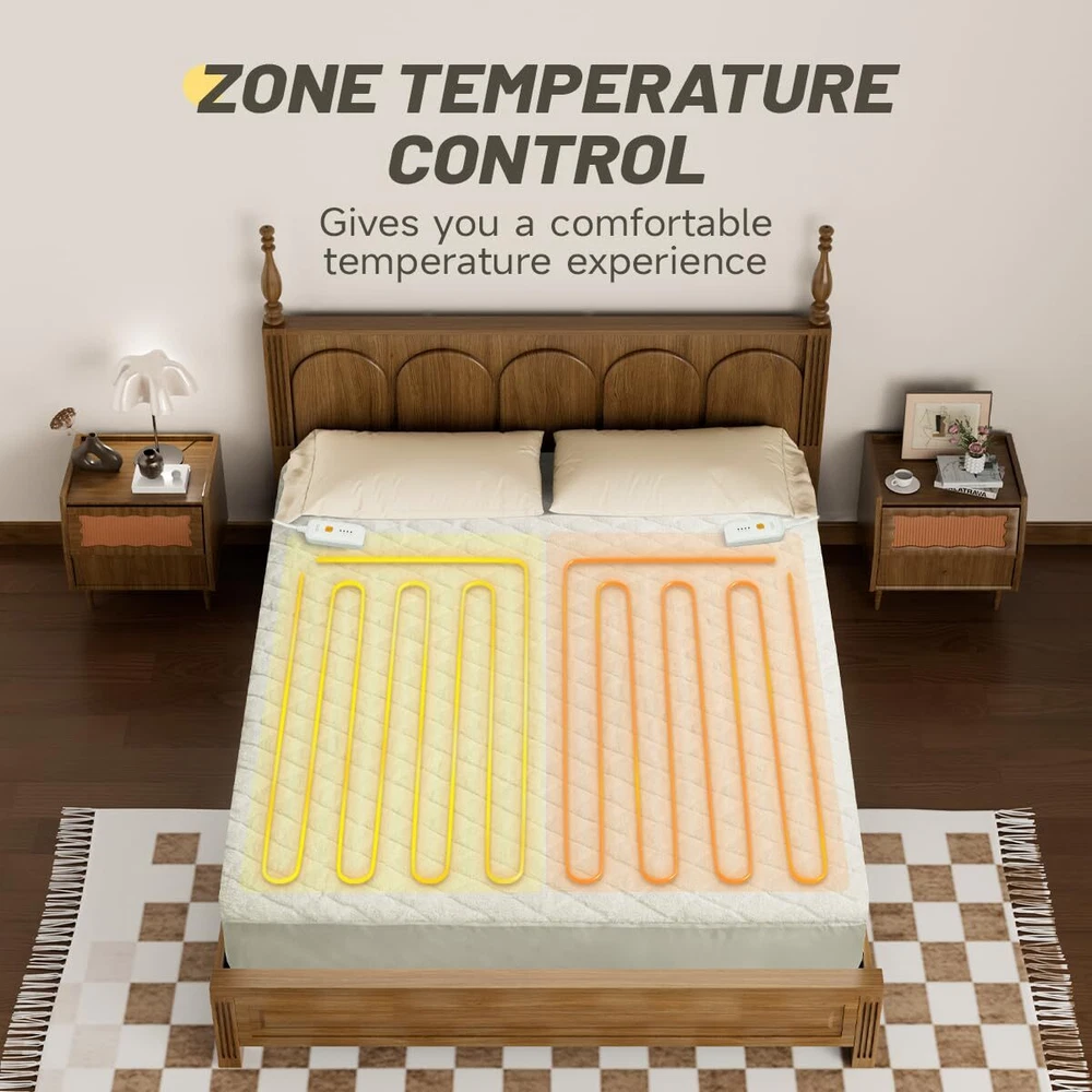 SOFT MATERIAL: The heated mattress pad fabric is made of micro plush,delicate and soft, skin-friendly and non-irritating, and the warm and comfortable queen mattress pad can be used personally, giving you a comfortable sleep in the cold winter 4 HEATING SETTINGS&10H AUTO-OFF:The matress pad queen size is equipped with dual temperature and dual controller,left and right control,each needs, the mattress pad has 4 heating settings adjustment and 10-hour automatic shutdown function to prevent forgetting to shut down,The queen heated mattress pad can avoid you waking up in the middle of the night in the cold winter, to ensure that you have a comfortable and stable sleep experience Deep pocket design: Our heated mattress has a deep pocket design, the side of the pocket is easy to stretch to ensure that the 15-inch mattress fit, and our mattress pad also has a non-slip design, so that if you fall asleep and turn all night, you don't have to worry about the heated mattress pad will slide and affect the comfort OVERHEATING PROTECTION&SAFETY ASSURANCE:The mattress pad has the function of overheating protection. When a high temperature is detected, the heated mattress pad will automatically power off.heated mattress pad has an ETL certification,Ensure your safety during use EASY MACHINE WASH:Our heated mattress pad is machine washable.Separate the controller from the matress pad,the whole heated mattress pad can be put into the washing machine.It is easy to keep the body of the heating mattress pad clean and the surface of the heating mattress pad soft and durable