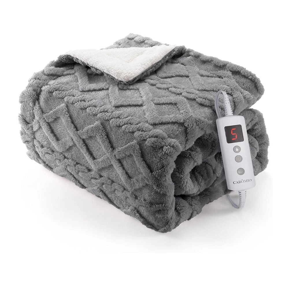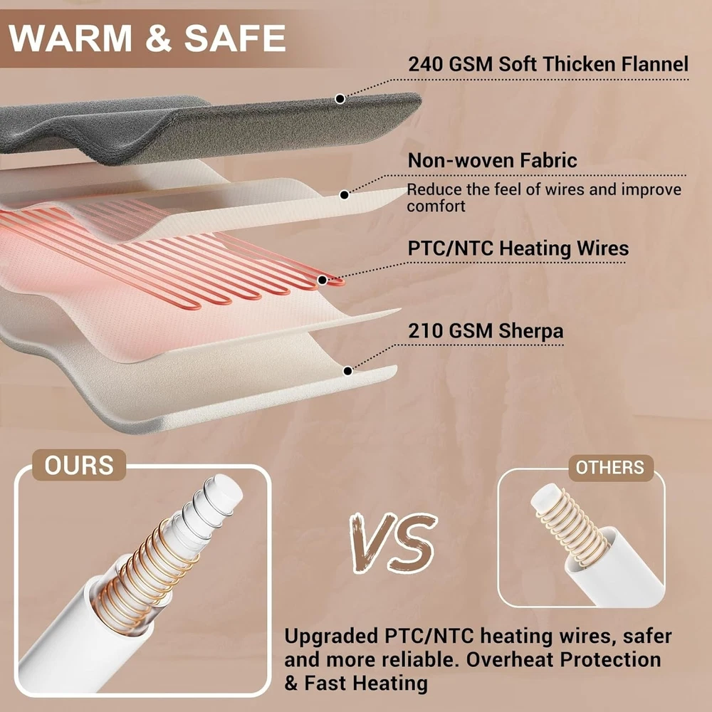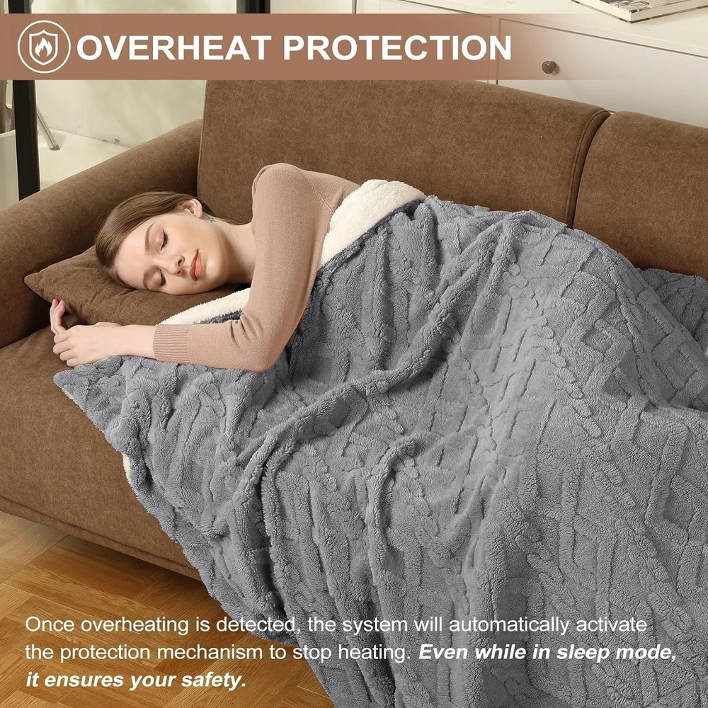 DescriptionReport Item / Suspicious Activity\n Premium and Stylish Elevate your comfort and style with our sherpa heated throw blanket. Featuring a tufted cable pattern, it adds a touch of elegance to your home. Crafted with thickened 240GSM jacquard long plush sherpa on one side and 220GSM sherpa on the other, it offers exceptional softness and comfort for a truly cozy experience.\n Enhanced Heating System Immerse yourself in rapid and consistent warmth with our enhanced heating system. Our upgraded and 10% extended heating wires provide a larger heating area, delivering soothing warmth in just 20 minutes. With 10 heat settings, easily adjust the temperature to your preference. Enjoy a maximum temperature of 122 F, surpassing regular electric blankets by 10 F. Heated Throw Blanket - Thick Tufted Sherpa Electric Blanket Throw With 10 DescriptionReport Item / Suspicious Activity Premium and Stylish Elevate your comfort and style with our sherpa heated throw blanket. Featuring a tufted cable pattern, it adds a touch of elegance to your home. Crafted with thickened 240GSM jacquard long plush sherpa on one side and 220GSM sherpa on the other, it offers exceptional softness and comfort for a truly cozy experience. Enhanced Heating System Immerse yourself in rapid and consistent warmth with our enhanced heating system. Our upgraded and 10% extended heating wires provide a larger heating area, delivering soothing warmth in just 20 minutes. With 10 heat settings, easily adjust the temperature to your preference. Enjoy a maximum temperature of 122 F, surpassing regular electric blankets by 10 F. Product Attributes: Weight (lbs.) : 1.00 lb UPC: 8711334732926