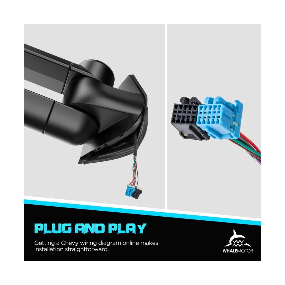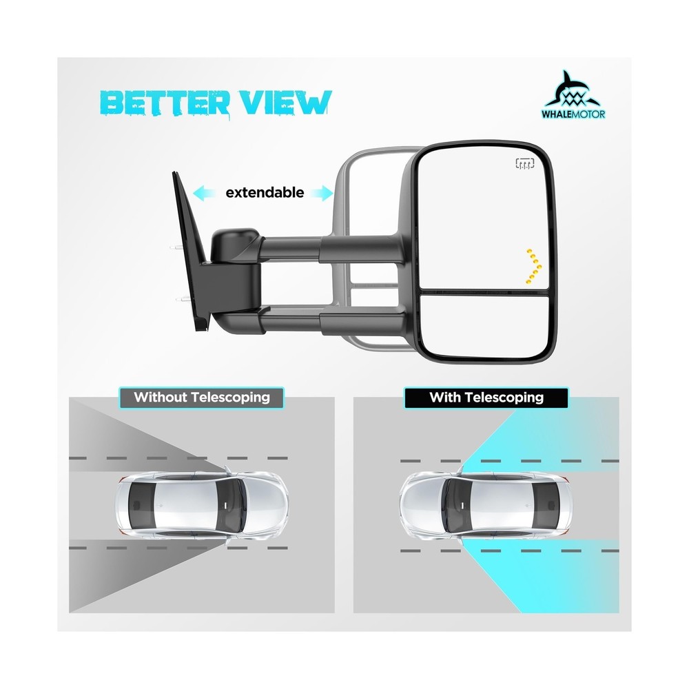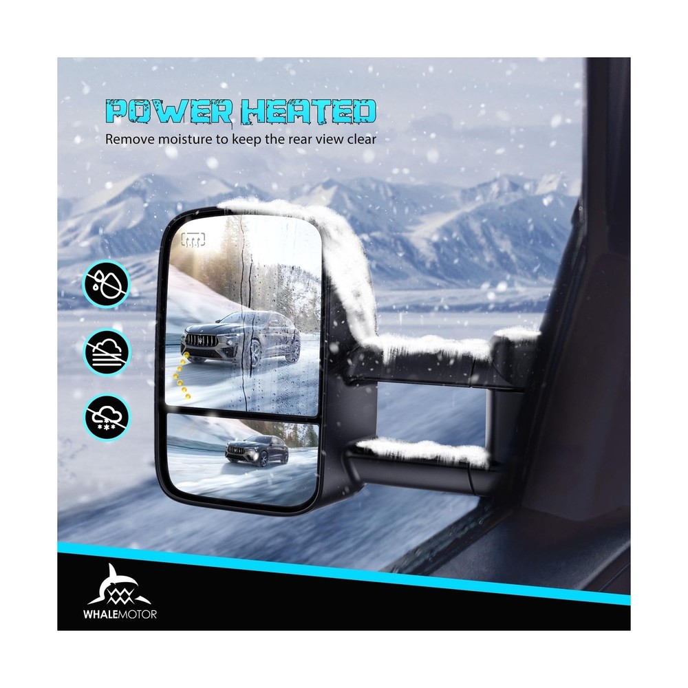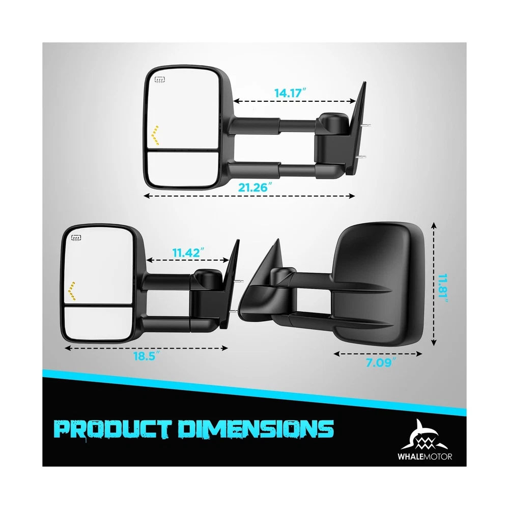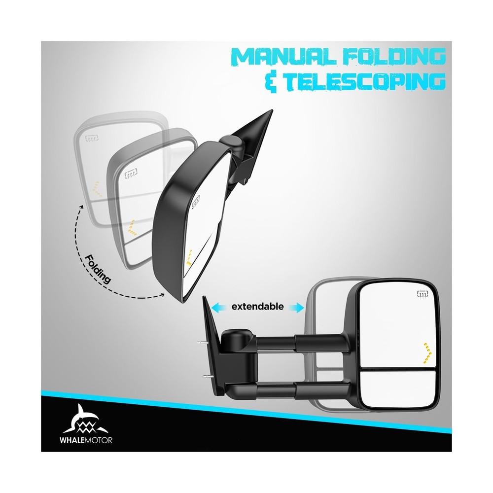 {{title} Heated Tow Mirrors Compatible with 2003-2007 Chevy Silverado GMC Sierra(2007 Classic) 1500 2500 3500, Tahoe Suburban Avalanche Yukon Escalade, Extended Trailer Towing Side Mirrors LED Turn Light Description Features: Vehicle fitment: 2003 2004 2005 2006 Chevrolet Silverado & GMC Sierra 1500 2500 3500 HD, 2007 Silverado & Sierra 1500 2500 3500 classic, 2003-2006 Chevy Tahoe & Suburban & Avalanche, 2003-2006 GMC Yukon & Yukon XL, 2003-2006 Cadillac Escalade. Eliminate blind spots: A wide angle & adjustable flat mirror provides a clear view of the traffic, a convex mirror provides broader view of the objects behind and alongside the vehicle. Extendable arms: Manual adjust the length of the arm to better suit your needs, help you see around the trailer more easily, ensure road safety. Safer Lane Changing: Built-in turn signals are more visible to other drivers when you are turning or changing lanes, especially when towing a trailer that may obstruct your rear lights. Essential in foggy conditions: The electric heating element inside the mirror glass helps to quickly defrost and clear any moisture, very important when towing in harsh weather conditions. Product Details: Auto Part Position: Front Outside Material: Acrylonitrile Butadiene Styrene (ABS), Aluminum, Glass Brand: WHALEMOTOR Vehicle Service Type: Truck Color: Black Mounting Type: Door Mount Included Components: a pair of tow mirrors, Include driver side and passenger side. Special Feature: Adjustable, Extendable, Foldable, Heated, Manual Telescoping Fit Type: Vehicle Specific Fit Shape: Rectangular Auto Part Position: Front Outside Brand: WHALEMOTOR Color: Black Mounting Type: Door Mount Included Components: a pair of tow mirrors, Include driver side and passenger side. Special Feature: Adjustable, Extendable, Foldable, Heated, Manual Telescoping Fit Type: Vehicle Specific Fit Shape: Rectangular Automotive Fit Type: Vehicle Specific Fit Manufacturer: WHALEMOTOR Lens Curvature Description: Convex Model: Compatible with 03-07 Chevy Silverado & GMC Sierra with Built-in Arrow Turning Light Item Weight: 16.37 pounds Package Dimensions: 20.9 x 14.6 x 11.6 inches Item model number: 2003-2006 Exterior: Machined Manufacturer Part Number: WMTM-0002 Special Features: Adjustable, Extendable, Foldable, Heated, Manual Telescoping Lift Type: Power Date First Available: July 16, 2023 Delivery We Do Not Ship Outside of the Continental US. Return Policy All items qualify for returns within 30 days of receipt. Buyer is responsible for return shipping on any item that is not damaged. Feedback We take our reputation seriously, we buy and sell online, so we understand the value of trust. If you are unsatisfied with your order, please contact us and we will work with you to resolve it to your satisfaction. Delivery We Do Not Ship Outside of the Continental US. Return Policy All items qualify for returns within 30 days of receipt. Buyer is responsible for return shipping on any item that is not damaged. Feedback We take our reputation seriously, we buy and sell online, so we understand the value of trust. If you are unsatisfied with your order, please contact us and we will work with you to resolve it to your satisfaction.