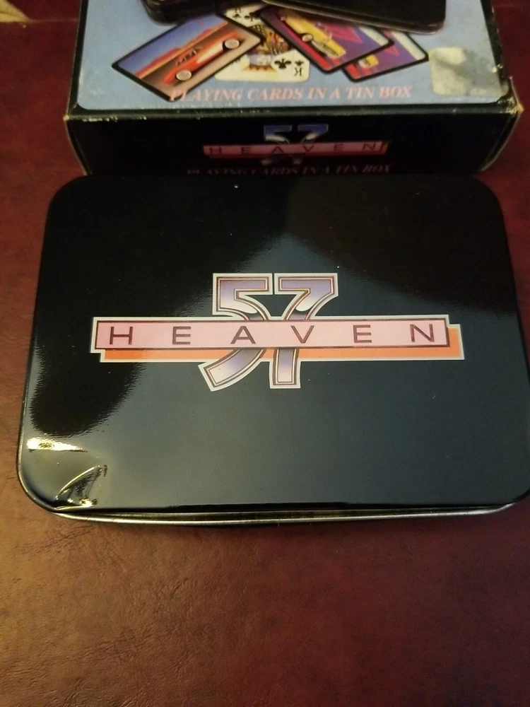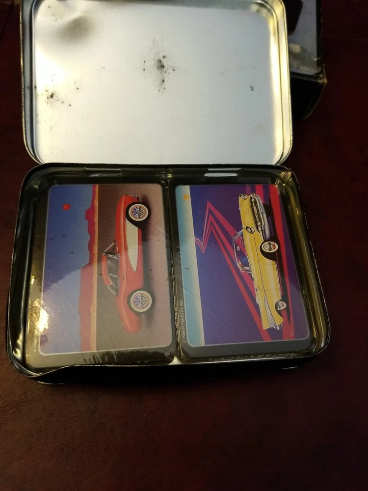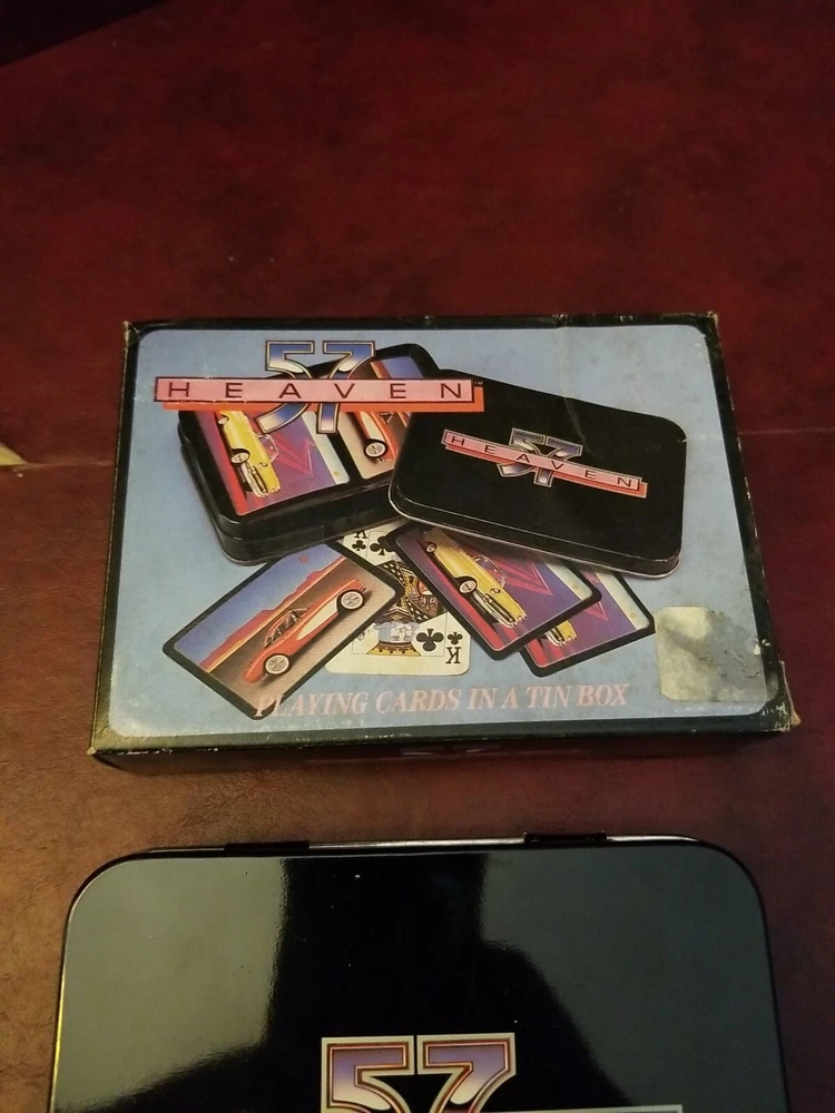 Heaven 57 Automotive Playing Cards - Two Sets in Metal Box New. There is a dent in the tin.