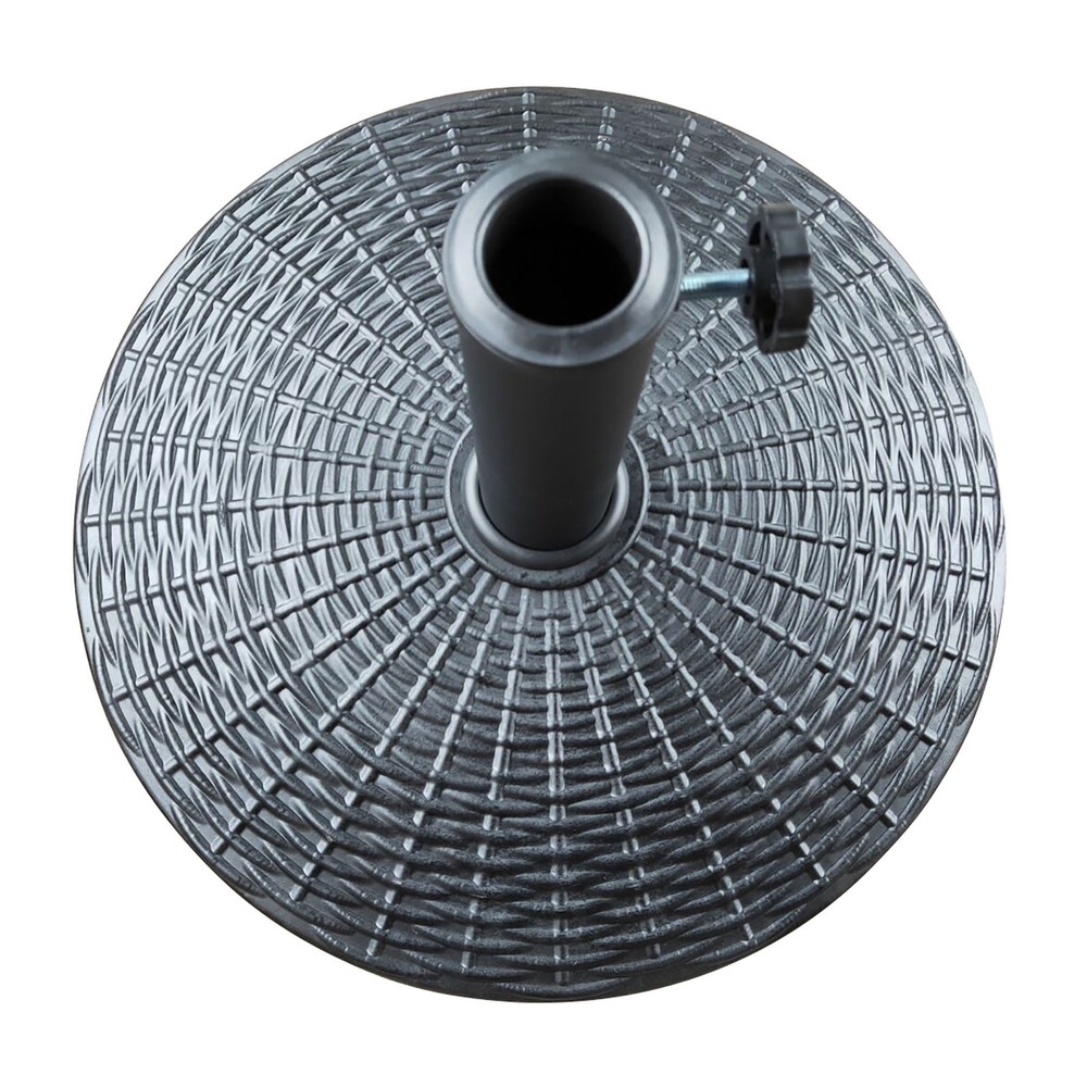 Securely hold your patio umbrella with this 22-pound base. This base is easy to assemble and provides a secure support for your patio table and chairs. It securely holds the umbrella underneath your patio table and chairs, giving you a cool and comfortable shade while dining. Thanks to its powder-coated resin, it can withstand all weather conditions and stays looking new even in inclement weather. This base is perfect for early mornings and evenings, allowing you to enjoy a cup of tea outdoors under a comfortable umbrella. It is definitely a perfect addition to your outdoor patio furniture and can be used with most umbrellas on the market or your existing patio furniture set. 22-pound powder-coated round resin patio umbrella base High-quality and durable black powder-coated resin With locking knob to the safety of the umbrella Easy to assemble Fit for commercially available umbrellas 17.51"W x 17.51"L x 13"H Applicable umbrella pole diameter: 1.5", 1.9"