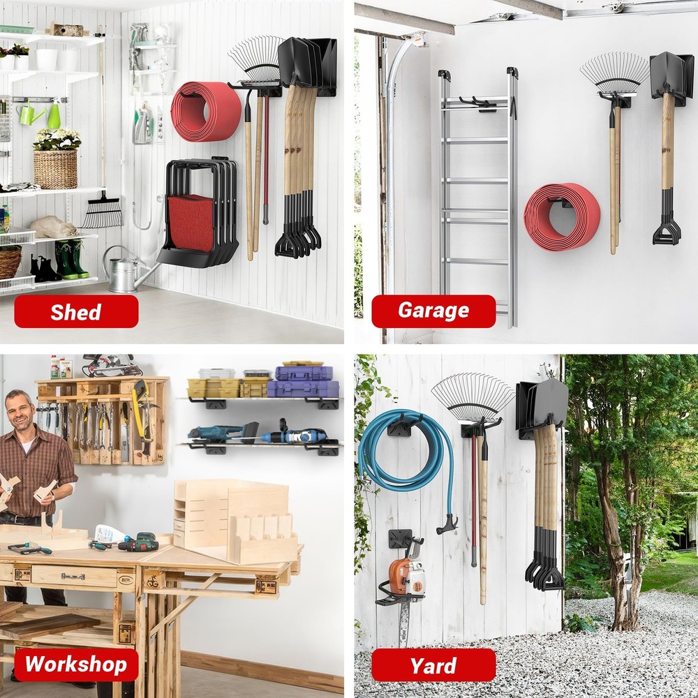 SUPER MATERIAL— Powder-coated steel for durability-resists of rusting, chipping and cracking. Rubber-coated sleeves are scratch-resistant. Steel construction epoxy finish. WIDELY USED — 12.4 inch long utility storage hooks can help you many garage tools. Garage Tool Organizer is suitable for organizing all kinds of tools,such as ski rack,tire rack, hoses, brooms, racquet, garden tools ,rain boots, rakes, shovels, chairs etc. EASY TO INSTALL — Utility Storage Hook could be installed in a few minutes. And the garage hooks are equipped with all the sturdy screws you need. SPACE SAVING — The garage hooks come in handy that they free up a lot of space by hanging things up on the wall and getting them off the floor and workbenches. Customization —If you have any questions about the installation and use of the product, you can us by e-. We will try our best to solve all your problems.