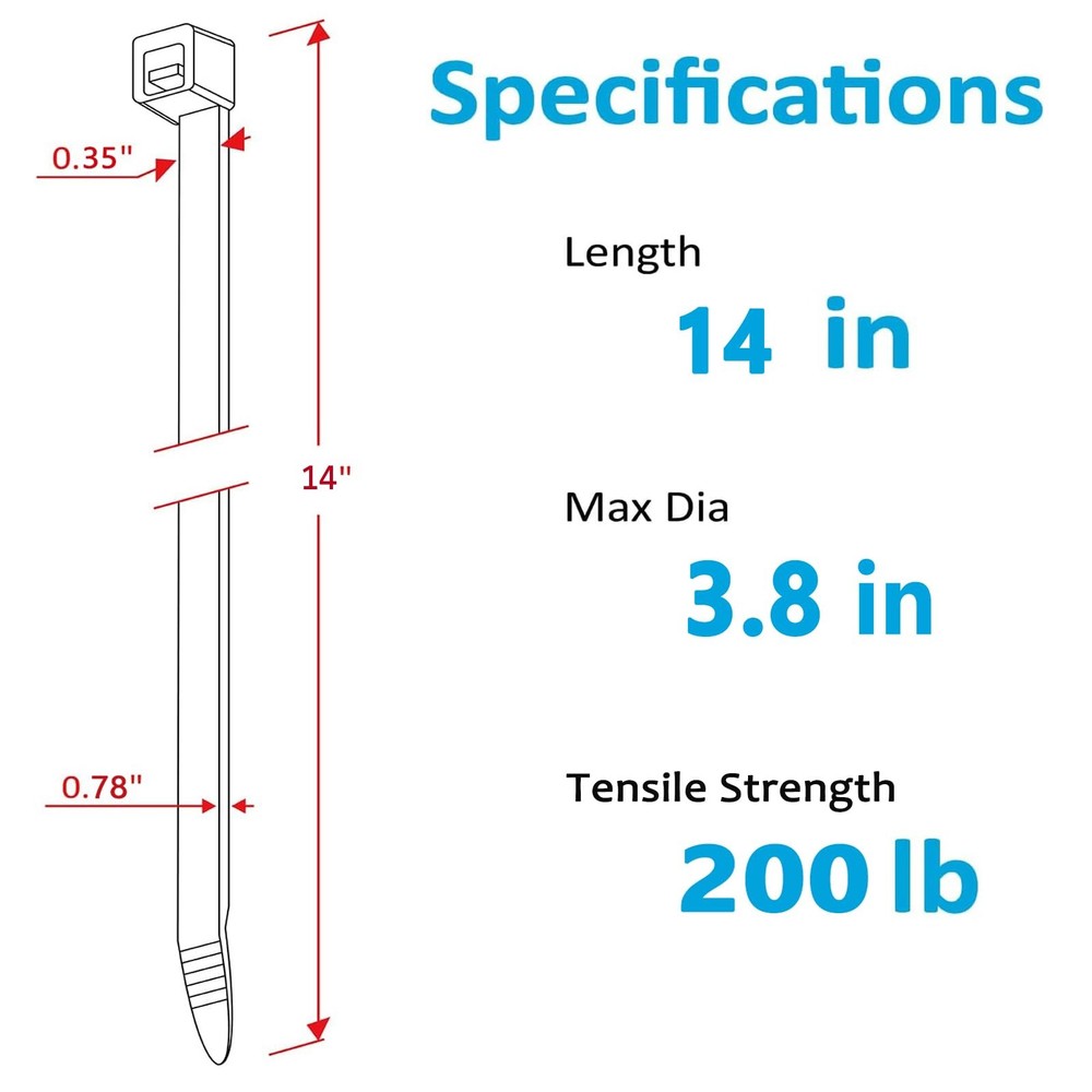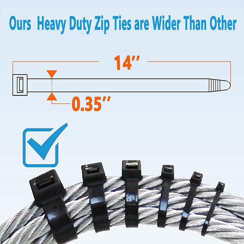 Zip Ties Heavy Duty, Large Zip Ties 14"with 200 lbs Tensile Strength,Long Zip Ties 14 inch Big Cable Ties, Black Zip Ties 50 Pack for Indoor And Outdoor Multi-Purpose Use Plastic Tie Wire Wide Thick Heavy Duty Zip Tie :The strength tensile of a zip tie depends on its width. Our Cable ties with 200 lbs are 0.35 inches / 8.8 mm wide. The wide design makes the large zip ties stronger, suitable for hanging fences, securing tubing insulation,Christmas lights ,cable management, decorations and supporting plants. Enforced Lock Design:The black zipties with a 4-tooth zip design, strong powerful lock for industrial everyday use. Great wire ties that can work for builders, household use, decorations and crafts. The reusable zip ties can be untied undo by a pin or a small nail. UV Resistant Zip Ties:The plastic tie wraps are made of halogen-free Nylon 66(UL 94V-2 Rating) which is UV resistant. Heat - Cold Resistant:Our reusable cable ties can resist heat and cold, you can use them as an insulated handle, electrical cable ties and for other household uses. Package & Guarantee:50 pcs black heavy duty zip ties 18 inch 200lbs for cable management. We guarantee that you will be satisfied with the black cable ties. Please feel free to contact us if you have any questions with the black zip ties, we'd love to help. Try it, totally risk free! Long Zip Ties Heavy Duty 14 inch 50 Pack AGAOTIAN Co.,Ltd is a professional factory of nylon cable ties. We will continue to improve the product quality, provide top grade products and the best service for our customers. Since 2008, over 8000 millon people chosen AGAOTIAN. High Quality Our zip ties heavy duty are made of UV resistant halogen free nylon 66. Operation temperature is -40℉ to 185℉with UL94V-2 flammability. Higher Tensile Strength The tensile strength of our large zip tie is 200 pounds, higher than others. Our strong zip ties width is 0.35 inch, wider than others(0.2 inch). Self-locking Design Our zip ties heavy duty can be easily locked, tightly and securely. One-piece construction for consistent performance and reliability. Multi-purpose Applications Our cable ties heavy duty can be used to tie cords and cables for electronics. Zip ties heavy duty can be used to organize electrical wires and computer cable ties. Warranty Our zipties have a 1-year warranty period. Our customer will receive a 100% refund if any quality issues under warranty period. Tips Warning: Keep this plastic bag away from baby . Warning: Used in proper temperature and tensile strength. Warning: Keep it sealed for long-term use. Package Includes 14 inch Heavy Duty Zip Ties Black 50Pack. Shipping We offer FREE shipping on all orders! We ship within Three business days of payment, usually sooner. We use a selection of shipping services such as UPS, FedEx, USPS etc. We only ship to the lower 48 states, no APO/FPO addresses or PO Boxes allowed. Local pickups and combined shipping options are not provided at this time. Return You can return a product for up to 30 days from the date you purchased it. Any product you return must be in the same condition you received it and in the original packaging. Please keep the receipt. Feedback Customer satisfaction is very important to us. If you have any problem with your order, please contact us and we will do our best to make you satisfied. Contact Us If you have any queries, please contact us via ebay. We usually respond within 24 hours on weekdays. Please visit our eBay store to check out other items for sale! Thank you for shopping at our store.