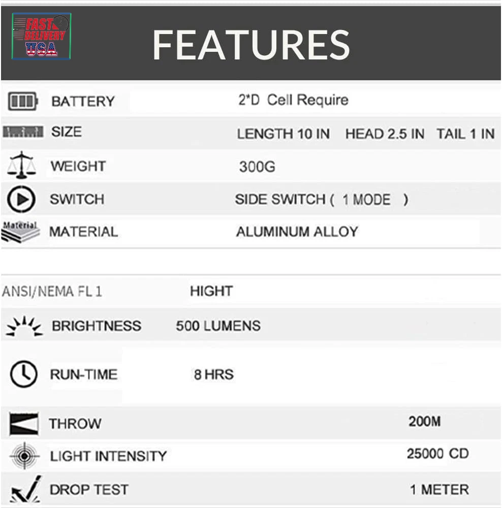 Store New Arrivals Add to Favorite View Feedback Contact Heavy Duty 2 D Cell Battery LED Big Flashlights High Lumens Single Mode Flashlight, Aluminum, Ourdoor, Emergency, Power Outage Supplies Description Item model number sdtgjpl-119 Light Source Type LED Style 2D Power Source Battery Powered Light Path Distance 300 Feet Country of Origin China Batteries Included? No Battery Description LED Unit Count 1 Batteries Required? No Product Dimensions 9.72"D x 2.12"W x 2.12"H Material Aluminum Finish Type Aluminum Included Components Large aluminum D-cell flashlight *1 Item Package Quantity 1 White Brightness 500 Lumens Brightness 500 Lumen Water Resistance Level Waterproof Item Weight 8.1 ounces Special Features Easy to use, impact resistant Runtime 10 hours Special Feature Easy to use, impact resistant Part Number sdtgjpl-119 Color Black Recommended Uses For Product outdoor, emergency, power outage supplies Finish types Aluminum Manufacturer Trade Co.Ltd. Long Battery Life: Powered by two D-cell batteries (not included), this large flaslight offers extended runtime up to 8 hours for dependable lighting for home use, emergency, power outage, camping, etc. Single-Mode Operaton: Toggle the side switch to turn on/off this big flashlight for hassle-free and consistent light output Flashlight High Lumens: Heay duty flashlight provides up to 500-lumen flood light Durable & Weather-Resistant: Built to withstand rough handling and various weather conditions, this d battery flashlight is a reliable choice for indoor and outdoor use Customer Service: Please feel free to reach out for any product problems This single-mode 2D battery flashlight is designed for those who ned reliable, straightforward illumination without any compliated setttings. With its powerful beam, this flashlight lights up your path, whether you're camping, handling emergencies, or working in low-light areas. The single-mode feature ensures a simple on-and-oof function, providing conosistent, bright light each time you need it. Powered by two D-cell batteries, this flashlight offers impressive runtime to support up to 8 hours. ABOUT US We offer the best prices around on high quality products. Our E-store includes media such as books, movies, music and games while offering electronics, toys, sporting apparel, clothing, tools, general home, garden items and more. SHIPPING We are always working hard to ensure your package arrives as soon as possible. Please understand that some factors like weather, high postal traffic, and the performance of shipping companies are outside of our control. We offer free shipping to the lower 48 states and ship within 2 business days of payment, usually sooner. We do not accept P.O. Boxes. Please provide a physical address. For shipping outside of the continental USA, we only use eBay's Global Shipping Program.The item is shipped to KY and then sent to the rest of the world. International customers are responsible for all duties and taxes. Continue to check out in order to calculate costs for shipping the item to your country. Messages regarding eBay's Global Shipping Program MUST be directed at eBay EXCLUSIVELY. RETURNS We offer a 30-Day Return Policy on items which you are not completely satisfied with. You have the option for a full-refund or an exchange of the item. No returns are available on items shipped outside of the USA. PAYMENT We accept PayPal. CONTACT US This page content is yet to come Please ad us to your favorite seller and visit again later Thank You CUSTOMER SATISFACTION We try our very best to make sure every customer is completely satisfied. If there's a problem, message us! We're happy to help. WE ACCEPT Copyright © 2021 AutoDS. | All Rights Reserved