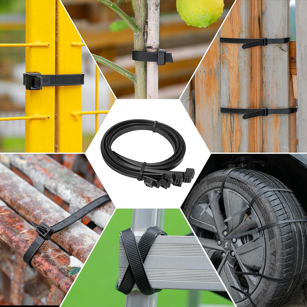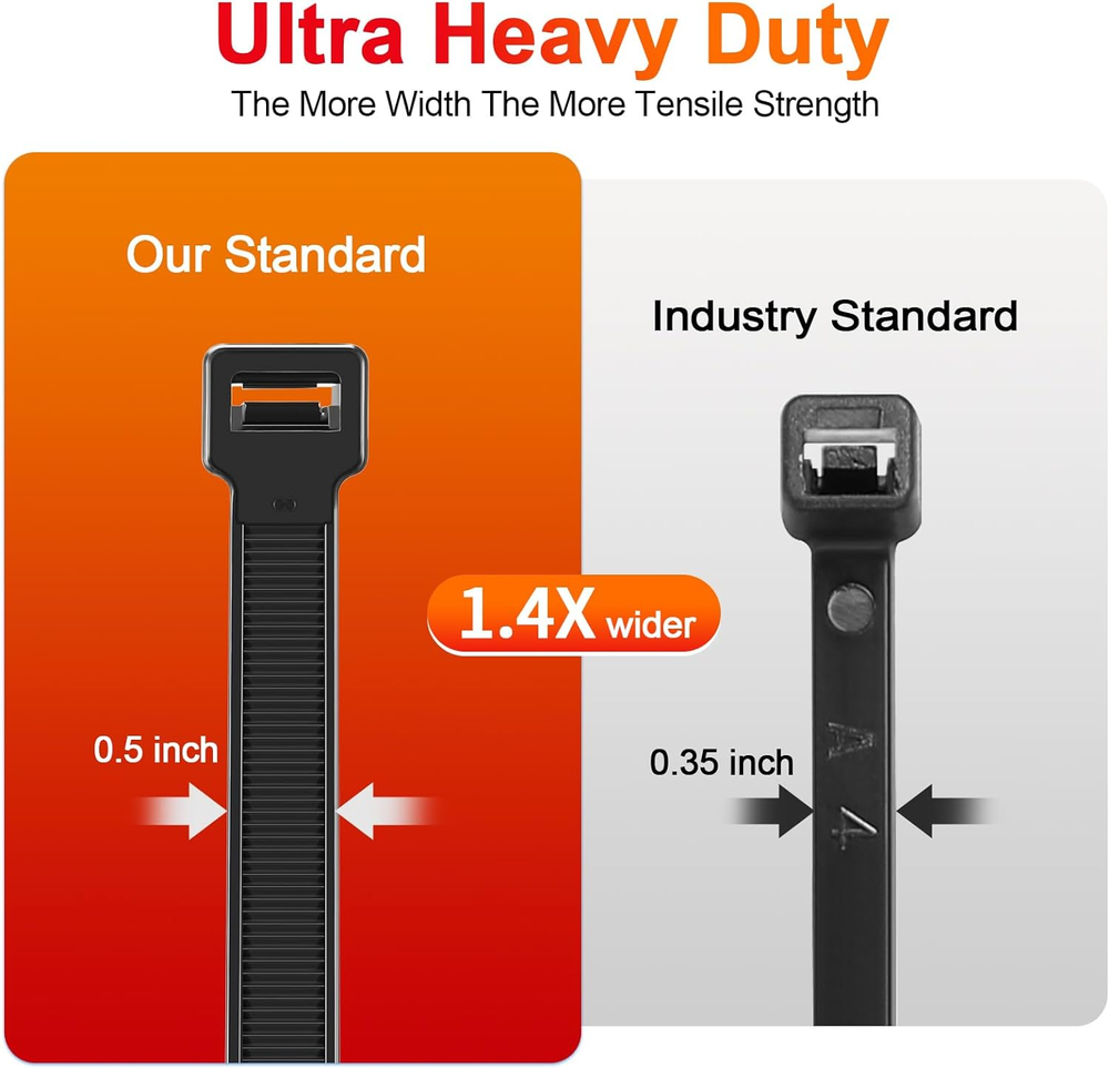 These heavy-duty zip ties are a game-changer! The extra width and thickness make them incredibly strong, holding up to 500 lbs without breaking. At 24 inches long, they easily handle large bundles, and the double-sided teeth ensure a secure grip. The pack of 100 means I always have plenty on hand for any project. Perfect for tough jobs where regular zip ties just won’t cut it!