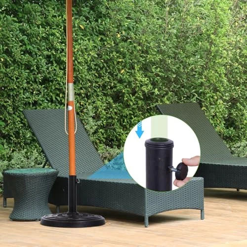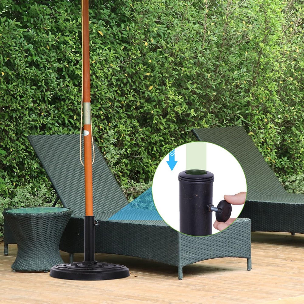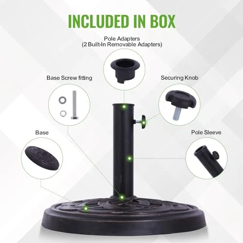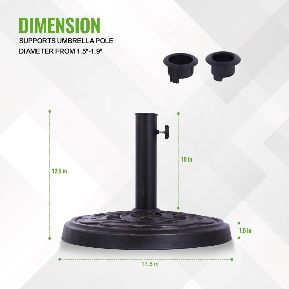 Heavy-Duty & Durable – Weighing 26.5 lbs, this base provides reliable support for your patio umbrella Elegant Design – Features a beautifully crafted bronze-tone woven pattern that enhances your outdoor décor Weather-Resistant Construction – Made from sturdy materials designed to withstand sun, rain, and wind exposure Secure & Adjustable Fit – Includes a tightening knob to accommodate different umbrella pole sizes for a snug, stable hold Compact Yet Sturdy – With a 17.5-inch diameter, this base offers strong anchoring power while maintaining a space-saving footprint