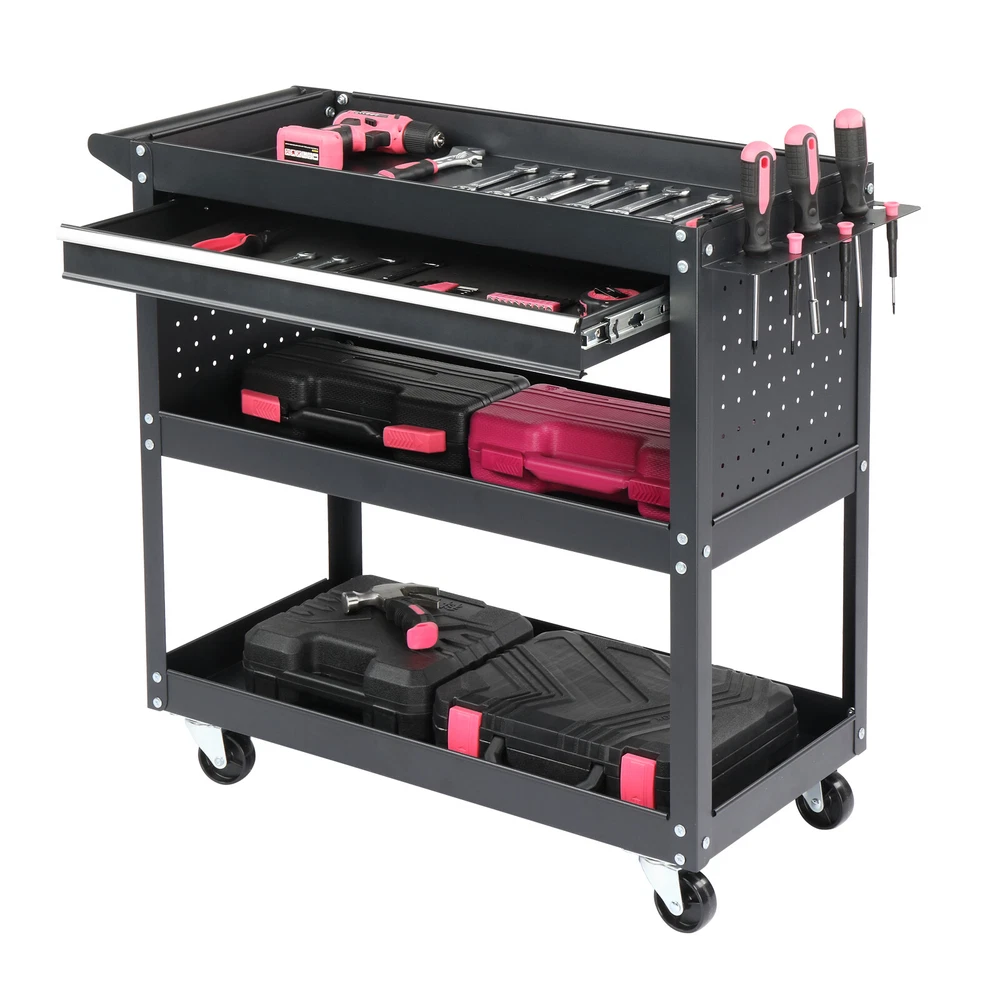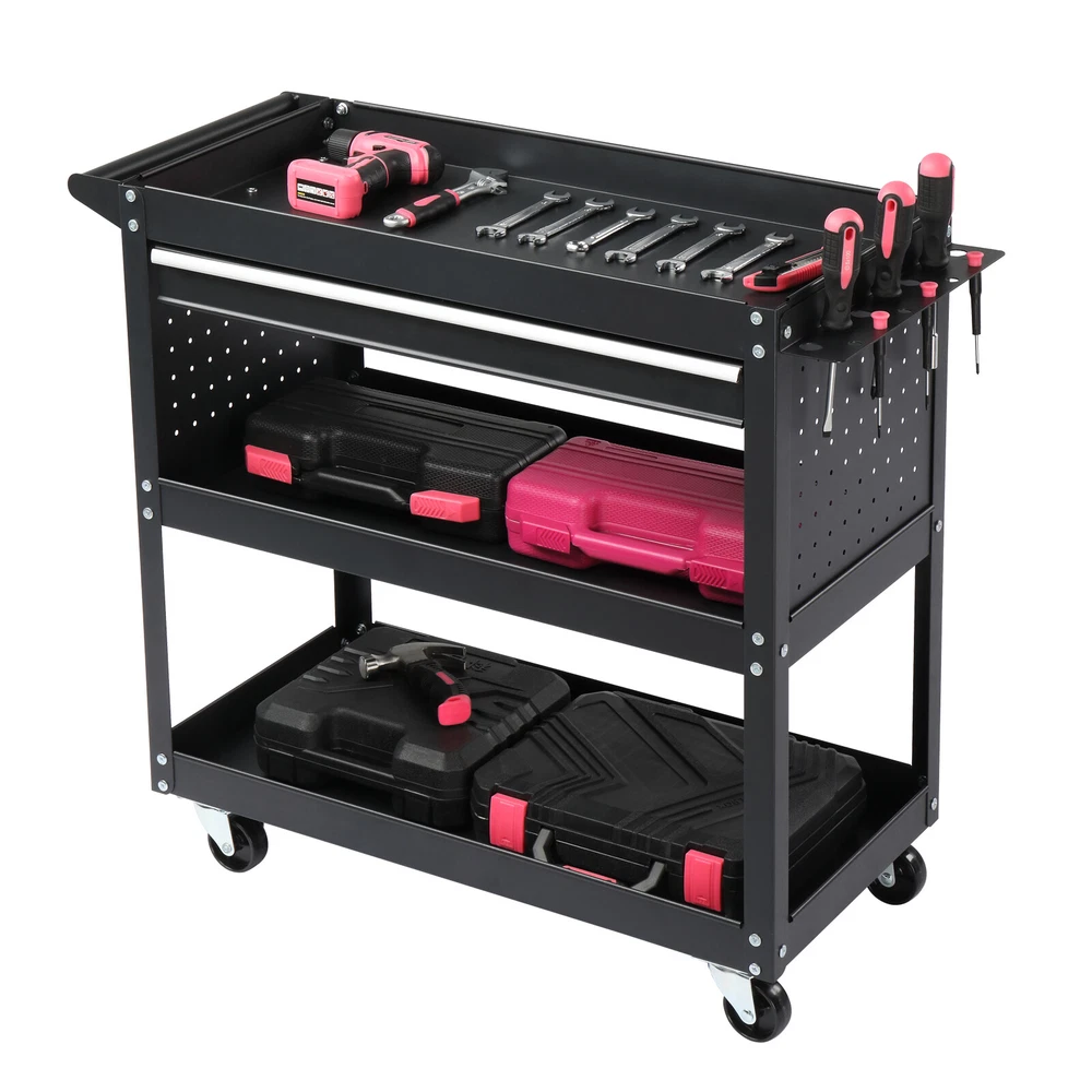 Heavy Duty 3 Tier Rolling Tool Cart Utility Storage with Pegboard Drawer Hooks