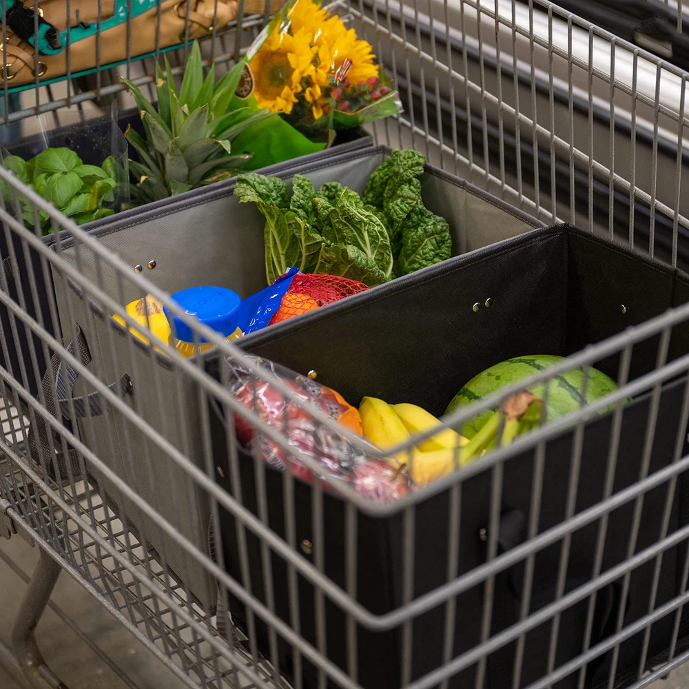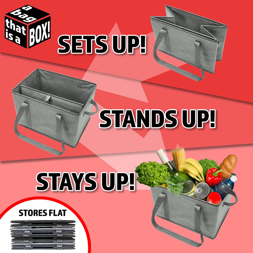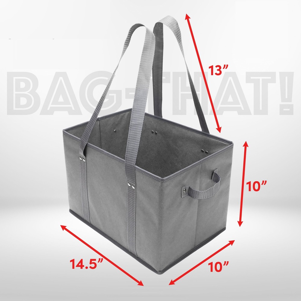 BAG-THAT! 4pk Reusable Grocery Bags Shopping Bags Tote Box Bag Large Heavy Duty Kitchen Reuse Trolly Cart Groceries Bag Long Handles Collapsible Foldable Reinforced Bottom Durable Organizer Carrier STANDS ON IT'S OWN AND STAYS OPEN - Grocery bag box, EZ load and unload, rigid sides and bottom insures they stand and stay open while you pack and unpack the tote. BAG-THAT! - Bag That is a BOX! "Does not fall over in the trunk!" MORE FLOOR SPACE - EXTRA LARGE - more bottom floor space at 14.5" L x 10" W x 10" H the reusable shopping bags were designed to load heavy items on the bottom leaving the top space for light items. HEAVY DUTY MADE TO BE USED - Stronger longer webbing carry and side handles using 25% larger rivets heavy duty insert board covered with a thicker material for these reusable grocery bags. MANY USES FOR THIS STURDY AND DURABLE - Tote utility bag kitchen reusable grocery bags organize toys arts crafts home projects cleaning supplies picnics camping trunk organizer trolley bags lotus bags FOLDABLE - EASY TO CLEAN - ECO FRIENDLY - Reusable bags collapse flat for EZ storage in your pantry or trunk. simply wipe clean with a damp cloth and allow to dry. Made with some recycled materials.