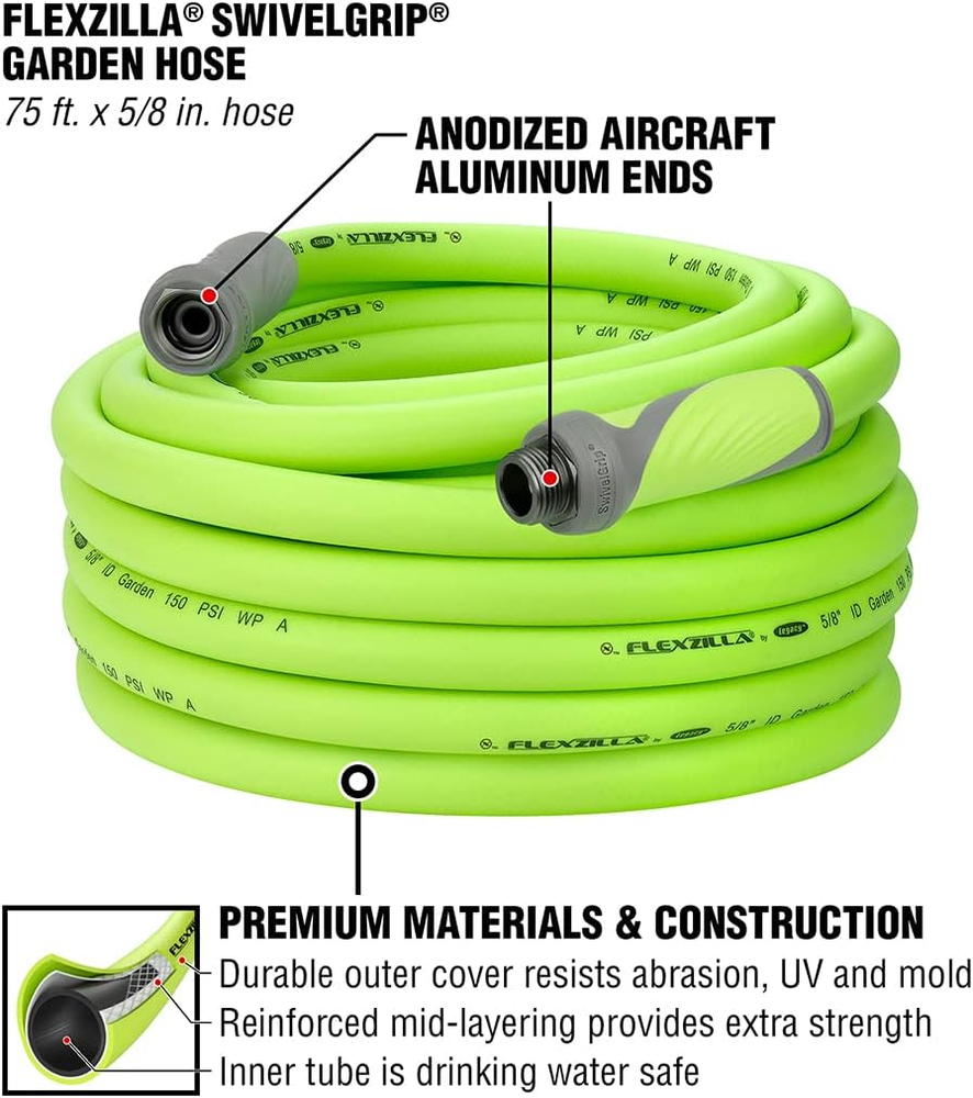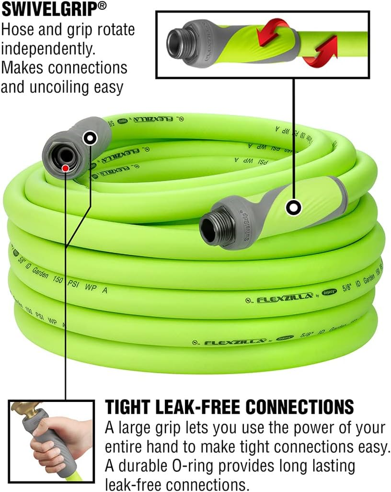 MALE & FEMALE SWIVELGRIP CONNECTIONS - Hose and grip rotate independently, makes connections and uncoiling easy, and naturally releases coils (SwivelGrip Patent Pending) EXTREMELY FLEXIBLE - All weather flexibility EXTREMELY DURABLE - Abrasion resistant outer cover and crush resistant anodized aircraft aluminum fittings HYBRID POLYMER - Won't kink under pressure, coils easily and lays flat with zero memory LIGHTWEIGHT - Lighter than traditional garden hoses making Flexzilla easier to carry and maneuver around the yard LEAK FREE CONNECTIONS AND DRINKING WATER SAFE - A durable O-ring provides long lasting leak free connections and feature an inner tube material that is drinking water safe Spray nozzle not included Color: ZillaGreen Premium Flexzilla SwivelGrip Garden Hose makes it easier to work around your home and lawn. SwivelGrip action eliminates twists that occur when uncoiling a hose. Conventional garden hose can trap coils that tighten into kinks as you move across the yard. SwivelGrip allows the hose and grip to rotate independently, releasing coils naturally, easily and effortlessly. The large, comfortable gripping surface on both ends of the hose lets you use the power of your entire hand to make tight connections easy. Flexzilla SwivelGrip Garden Hoses are engineered with a lightweight Flexible Hybrid Polymer which lays flat, eliminates kinking under pressure and is drinking water safe.