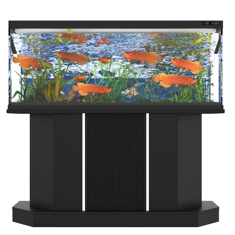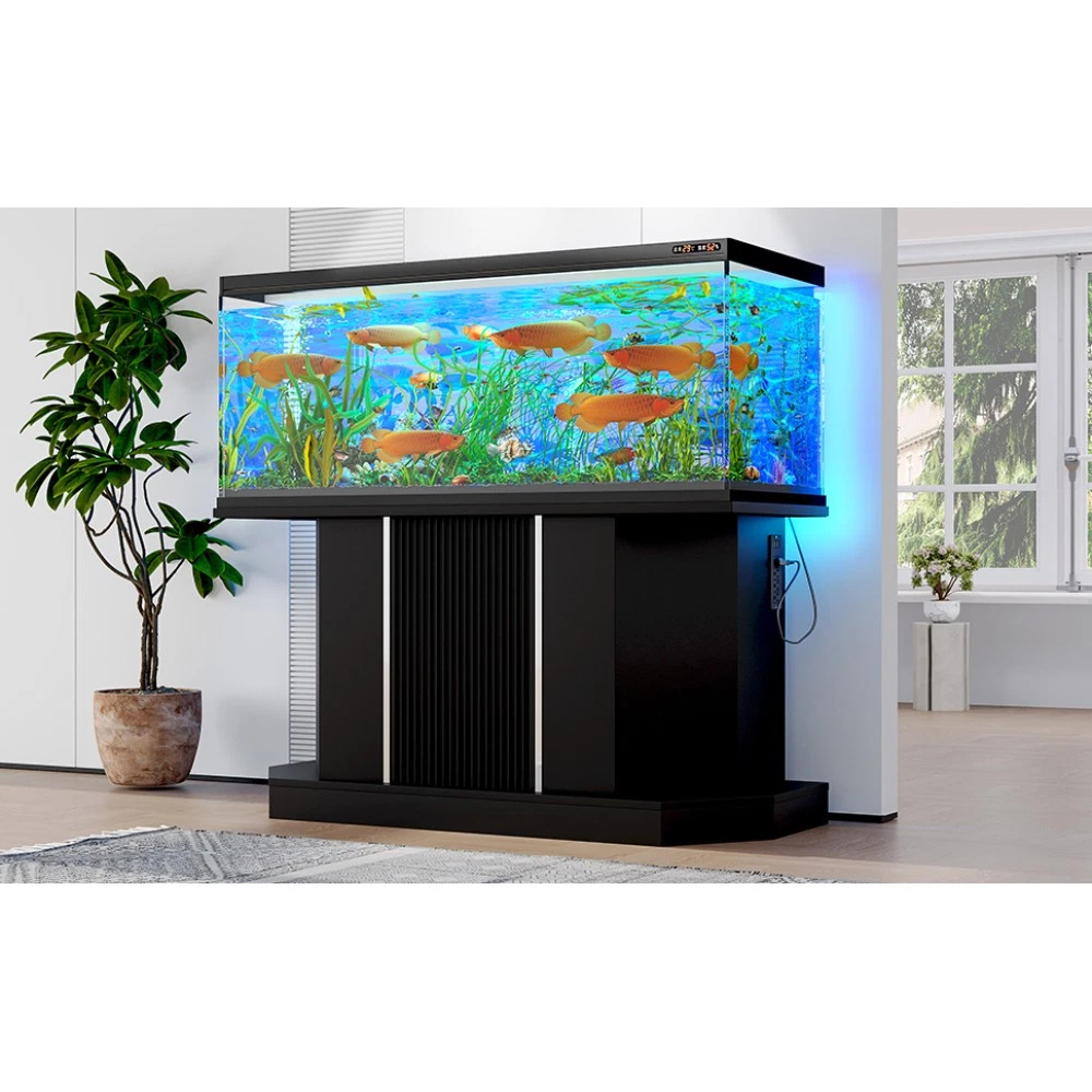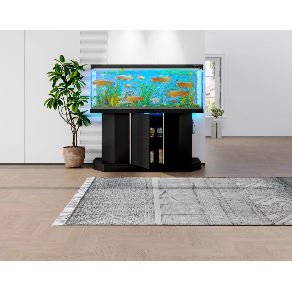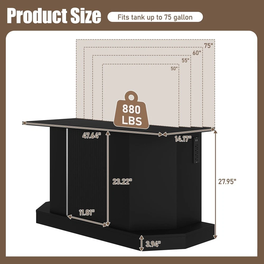 Modern 55-75 Gallon Fish Tank Stand with Power Outlet (4 AC 2 USB Ports), Heavy Duty Aquarium Stand with Cabinet Storage Upgrade your aquarium setup with this heavy-duty fish tank stand, designed to support 55-75 gallon tanks and elevate your space with both functionality and style. Perfect for fish tanks, turtle tanks, and reptile terrariums, this stand combines robust construction, convenient features, and ample storage to meet all your aquatic needs. Key Specifications Assembled Dimensions: 47.64 inches (L) × 14.17 inches (W) × 28.70 inches (H) | Assembled Weight: 57.43 lbs Packaging Dimensions: 58.19 inches (L) × 19.29 inches (W) × 6.69 inches (H) | Packaging Weight: 64.82 lbs Weight Capacity: 880 lbs | Color: Black | Material: MDF Premium Features 880LBS Heavy-Duty Support: Built to safely hold 55-75 gallon aquariums, with a sturdy MDF construction that ensures long-lasting stability. The 47.64×14.17 inch desktop provides ample space for your tank setup—please measure your tank before purchasing to ensure a perfect fit. Built-in Charging Station: Never run out of power for your aquarium equipment! Features 4 standard AC outlets and 2 USB ports, making it easy to connect heaters, filters, LED lights, and other essential devices in one convenient, organized spot. Spacious Storage Solution: Equipped with a built-in cabinet and shelf, this stand offers plenty of space to store fish food, cleaning tools, and all your aquarium supplies. Keep your setup neat, tidy, and everything within easy reach. Moisture-Resistant Finish: The sleek black laminated surface adds a modern touch to any room while protecting against moisture damage—preventing warping, swelling, or discoloration over time, so your stand stays durable and looks great for years. Hassle-Free Assembly: No complex tools or advanced skills required! Clear instructions and simple steps allow for quick and easy assembly, so you can set up your stand and enjoy your aquarium sooner. Important Notes This product includes the aquarium stand ONLY. The fish tank and any accessories shown in product images are not included. Customer Guarantee We stand behind our product with a 1-Year Quality Warranty —providing you with peace of mind against any manufacturing defects. Additionally, enjoy a 30-Day Free Return & Exchange Policy : if you’re not completely satisfied with your purchase, you can return or exchange it within 30 days, no questions asked.