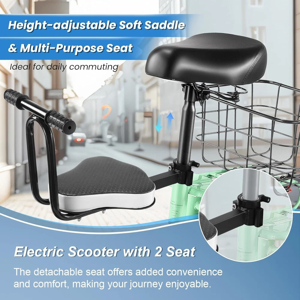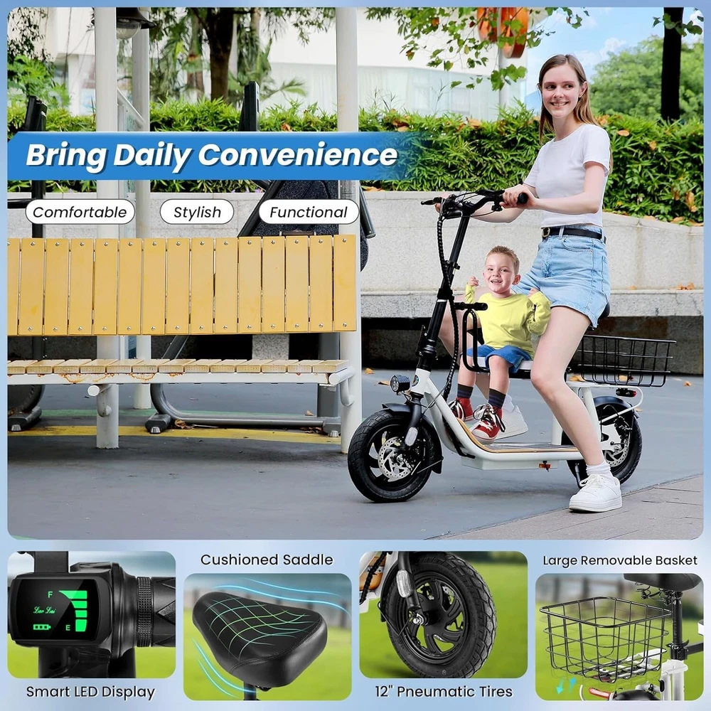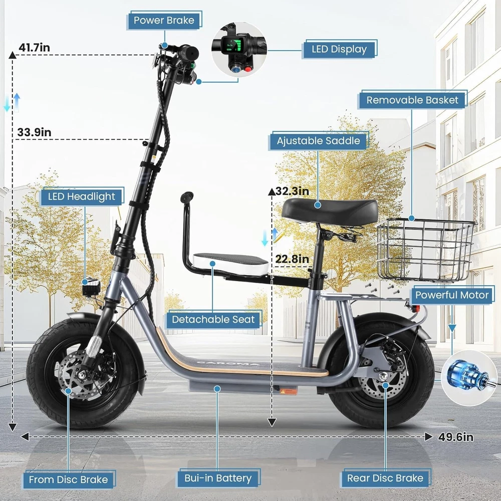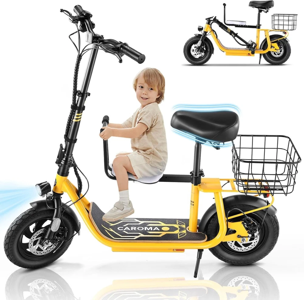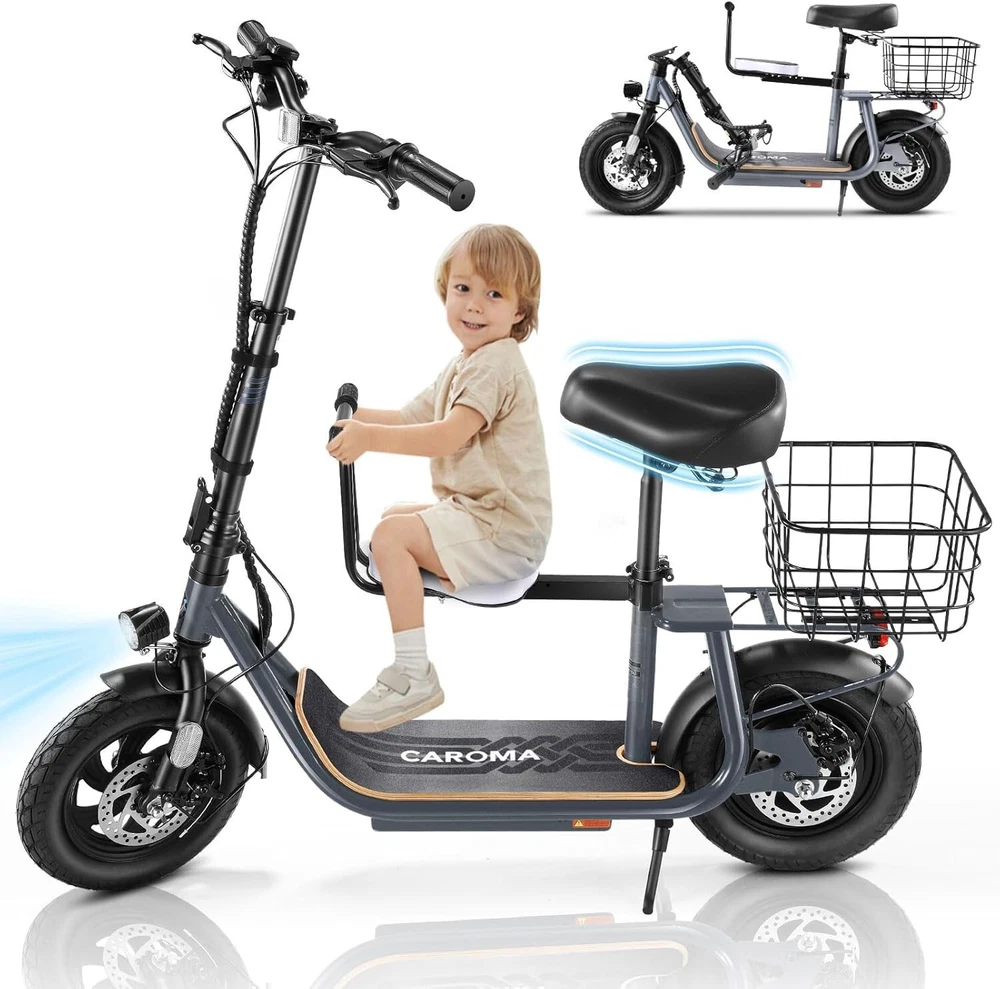 Product Description 🛴【Equipped with 2 Seats 】: Caroma Z6 Electric Scooter equipped with 2 Seats, can carry one child and one adult at the same time. Designed as an electric commuter bike for adults, you can experience ultimate comfort while riding with this e scooter. Perfect choice for parents to take their kids to and from school, for a drive or for shopping. 🛴【Peak 1200W Powerful Motor】: This electric scooter with seat is powered by a robust peak 1200W motor, reaching top speeds of 20 mph and handling 20% hill grades with ease. Perfect for commuting or leisure rides, this adult electric scooter offers unparalleled versatility and high performance. 🛴【10400mAh large-capacity battery】: The adults electric scooter is equipped with high-capacity 500Wh lithium battery, enhanced by regenerative braking, provides a remarkable range of up to 30 miles. Its 12" pneumatic tires provide excellent grip, high elasticity, and wear resistance. The extra-wide deck makes long rides enjoyable and effortless. 🛴【Portable and Durable Travel Partner】: Equipped with foldable handlebar, the e scooter can be easily stored and carried in your trunk, you can ride it anytime you like. The aluminum frame of this electric scooter is strong and durable, which can support a maximum weight of 265 pounds. The large capacity basket is prefect for shopping trips and short errands around the block. 🛴【Easy Assembly】: This electric scooter is UL 2272 certified. Only the seat and the basket attachment needed to be assembled after the 2 wheel electric scooter for adults arrives