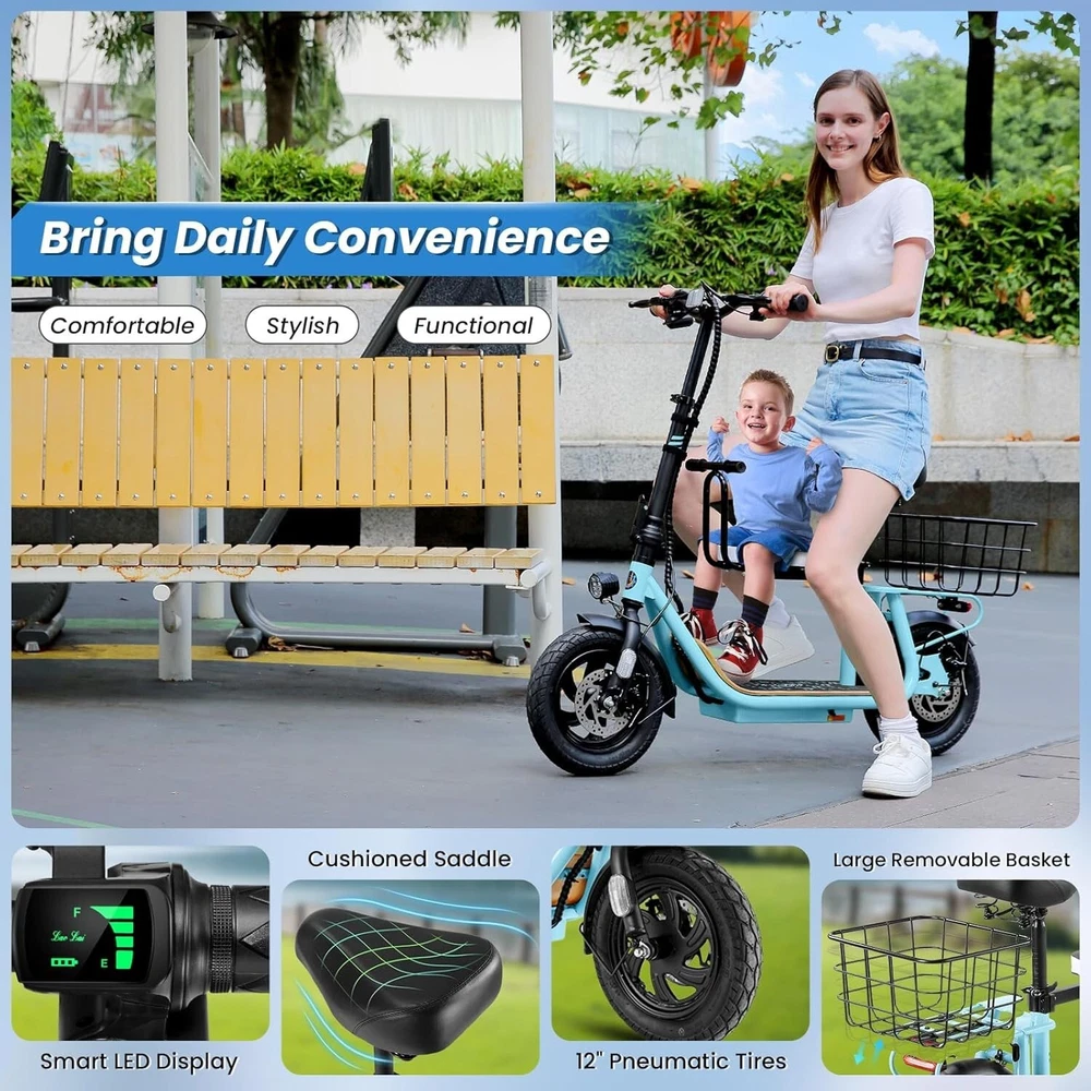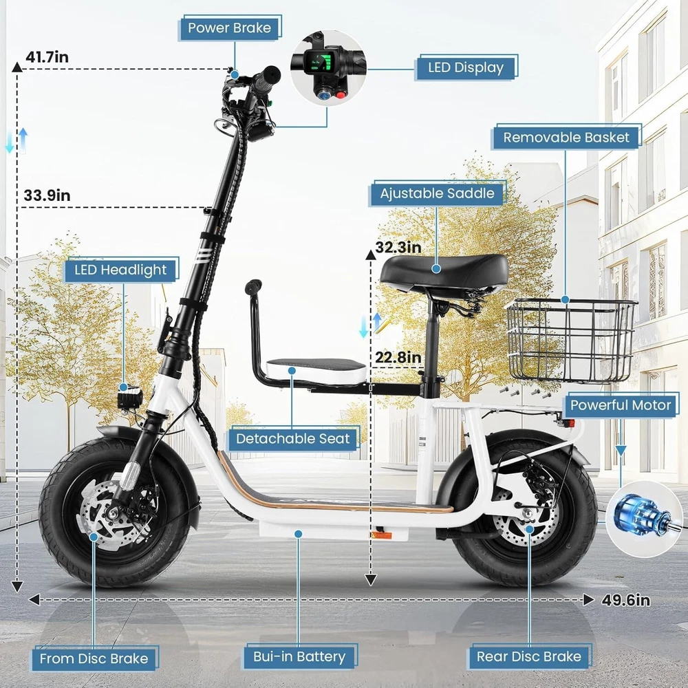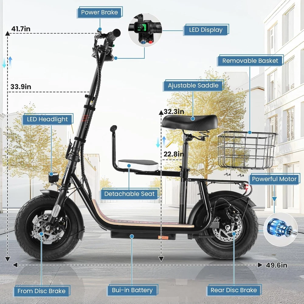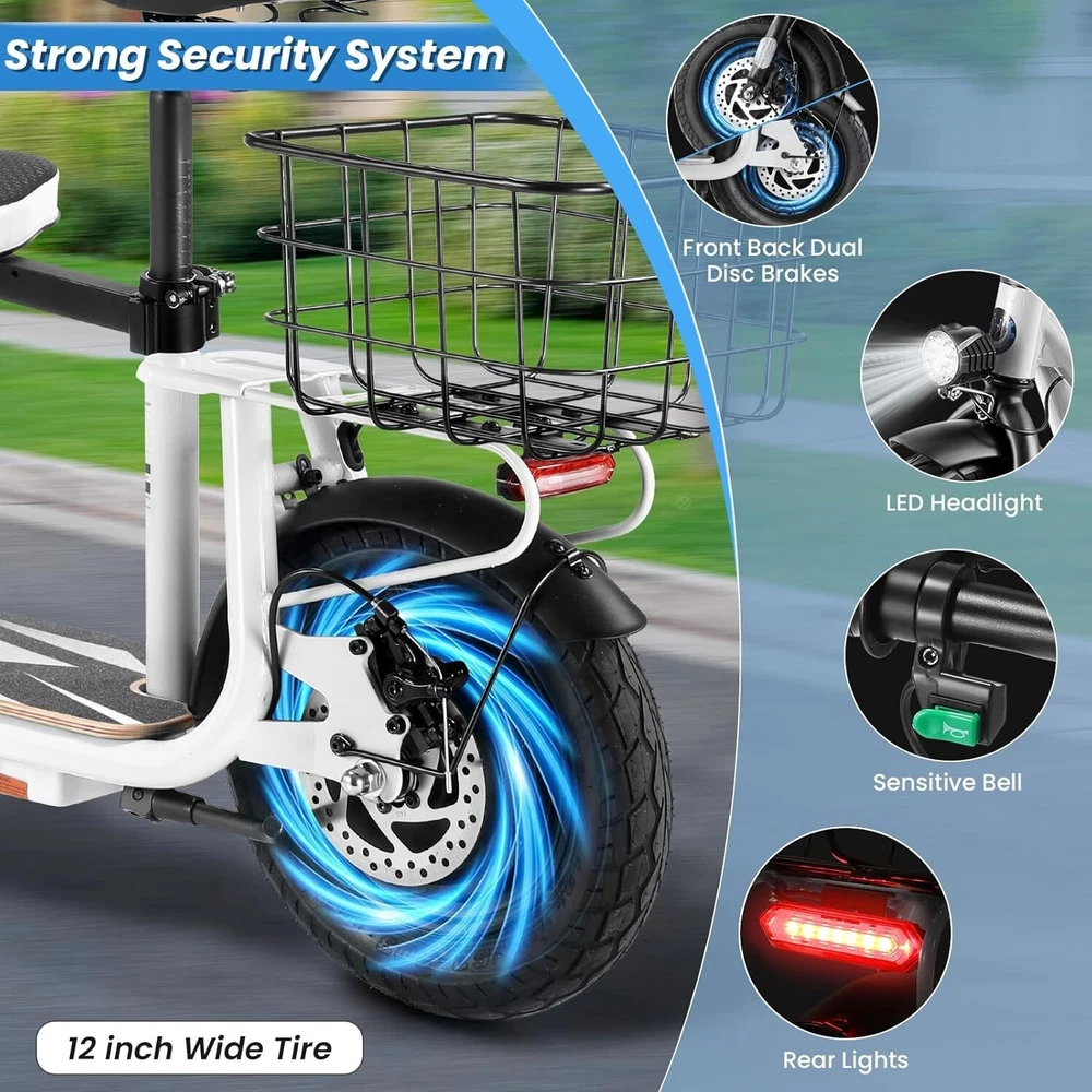 Product Description 🛴【Equipped with 2 Seats 】: Caroma Z6 Electric Scooter equipped with 2 Seats, can carry one child and one adult at the same time. Designed as an electric commuter bike for adults, you can experience ultimate comfort while riding with this e scooter. Perfect choice for parents to take their kids to and from school, for a drive or for shopping. 🛴【Peak 1200W Powerful Motor】: This electric scooter with seat is powered by a robust peak 1200W motor, reaching top speeds of 20 mph and handling 20% hill grades with ease. Perfect for commuting or leisure rides, this adult electric scooter offers unparalleled versatility and high performance. 🛴【10400mAh large-capacity battery】: The adults electric scooter is equipped with high-capacity 500Wh lithium battery, enhanced by regenerative braking, provides a remarkable range of up to 30 miles. Its 12" pneumatic tires provide excellent grip, high elasticity, and wear resistance. The extra-wide deck makes long rides enjoyable and effortless. 🛴【Portable and Durable Travel Partner】: Equipped with foldable handlebar, the e scooter can be easily stored and carried in your trunk, you can ride it anytime you like. The aluminum frame of this electric scooter is strong and durable, which can support a maximum weight of 265 pounds. The large capacity basket is prefect for shopping trips and short errands around the block. 🛴【Easy Assembly】: This electric scooter is UL 2272 certified. Only the seat and the basket attachment needed to be assembled after the 2 wheel electric scooter for adults arrives