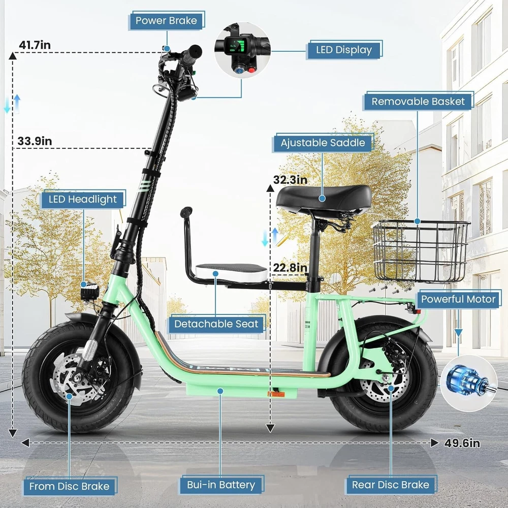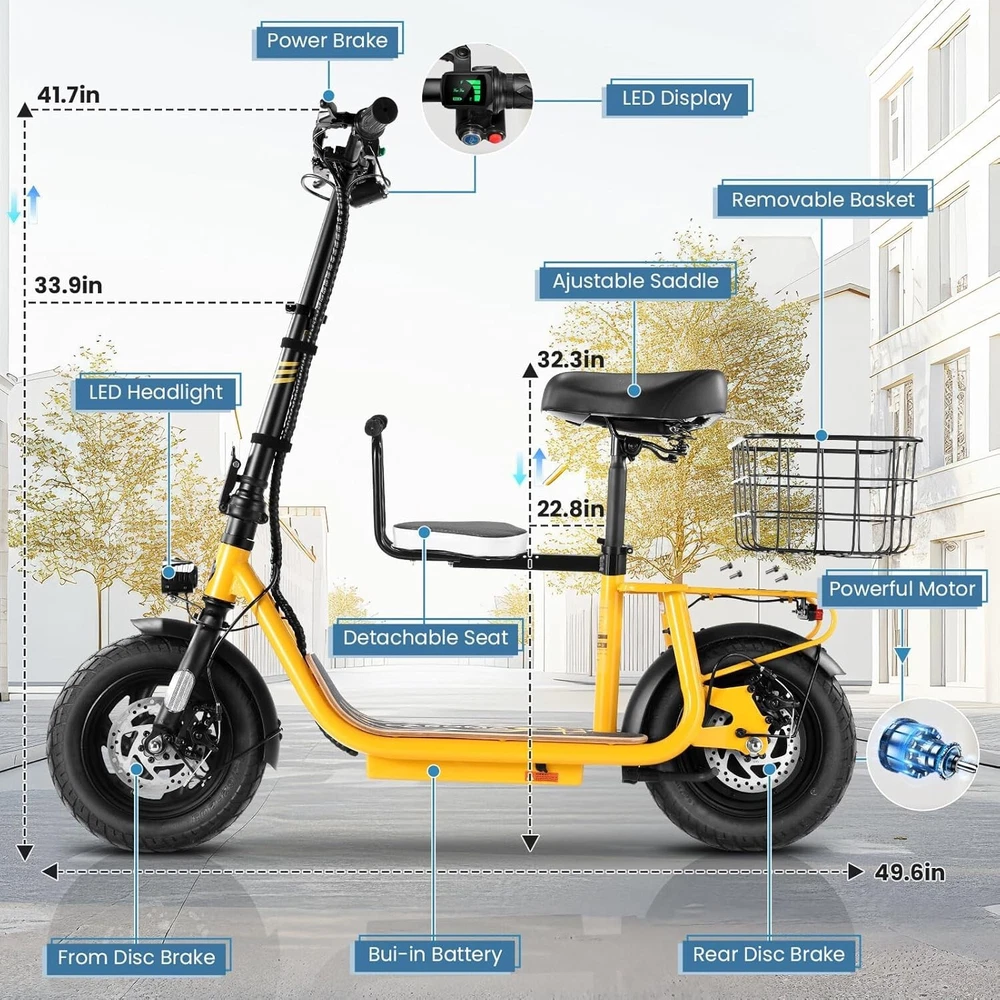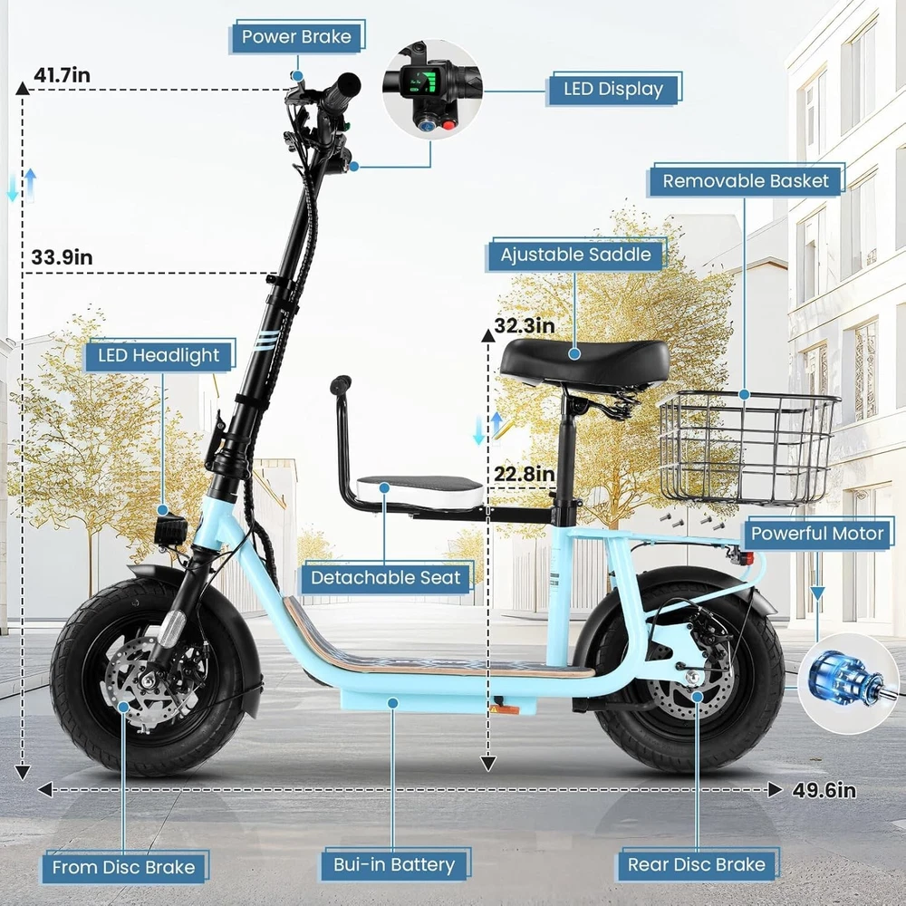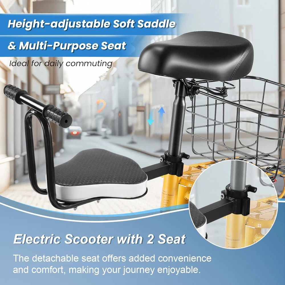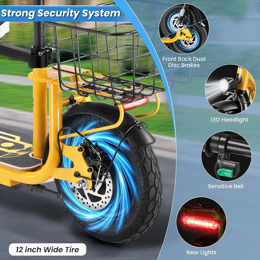 Product Description 🛴【Equipped with 2 Seats 】: Caroma Z6 Electric Scooter equipped with 2 Seats, can carry one child and one adult at the same time. Designed as an electric commuter bike for adults, you can experience ultimate comfort while riding with this e scooter. Perfect choice for parents to take their kids to and from school, for a drive or for shopping. 🛴【Peak 1200W Powerful Motor】: This electric scooter with seat is powered by a robust peak 1200W motor, reaching top speeds of 20 mph and handling 20% hill grades with ease. Perfect for commuting or leisure rides, this adult electric scooter offers unparalleled versatility and high performance. 🛴【10400mAh large-capacity battery】: The adults electric scooter is equipped with high-capacity 500Wh lithium battery, enhanced by regenerative braking, provides a remarkable range of up to 30 miles. Its 12" pneumatic tires provide excellent grip, high elasticity, and wear resistance. The extra-wide deck makes long rides enjoyable and effortless. 🛴【Portable and Durable Travel Partner】: Equipped with foldable handlebar, the e scooter can be easily stored and carried in your trunk, you can ride it anytime you like. The aluminum frame of this electric scooter is strong and durable, which can support a maximum weight of 265 pounds. The large capacity basket is prefect for shopping trips and short errands around the block. 🛴【Easy Assembly】: This electric scooter is UL 2272 certified. Only the seat and the basket attachment needed to be assembled after the 2 wheel electric scooter for adults arrives