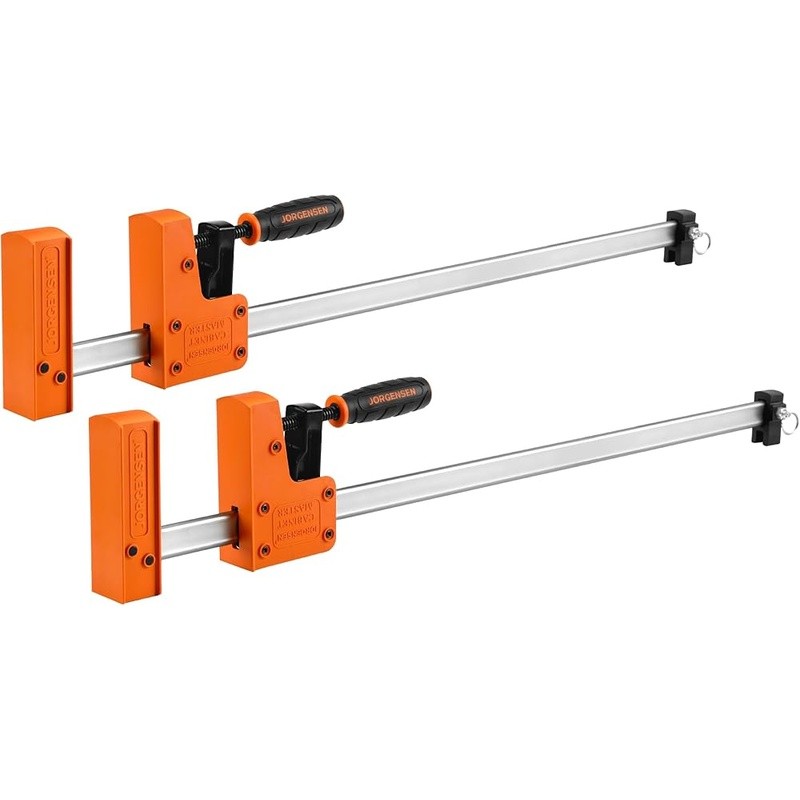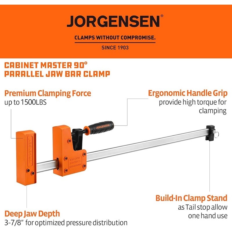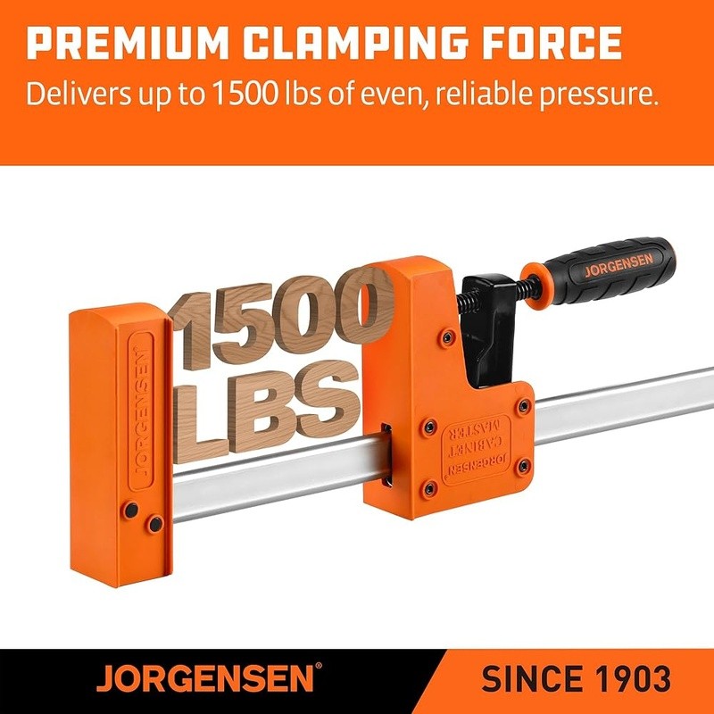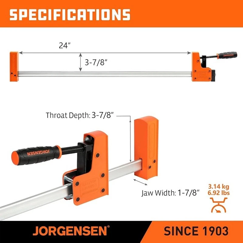 About this item Maximum opening capacity is 24 inches. Heavy-duty steel jaws and high-carbon steel bar for up to 1500 lbs. of clamping force. A reversible head enables spreader clamping and a clamp stand provides easy adjustments, while the maple handles won't wear down your hands. Reinforced steel and castings protected by orange plastic add strength to the jaws. Ideal for a wide range of woodworking such as panel glue-ups, boxes, cabinets, frames and raised panel doors. Material: Alloy Steel, Wood Brand: Item dimensions L x W x H: 33.07 x 9.25 x 2.36 inches Color: Orange Style: Bar Clamp Item Weight: 15.43 Pounds Tensile Strength: 1500 Pounds