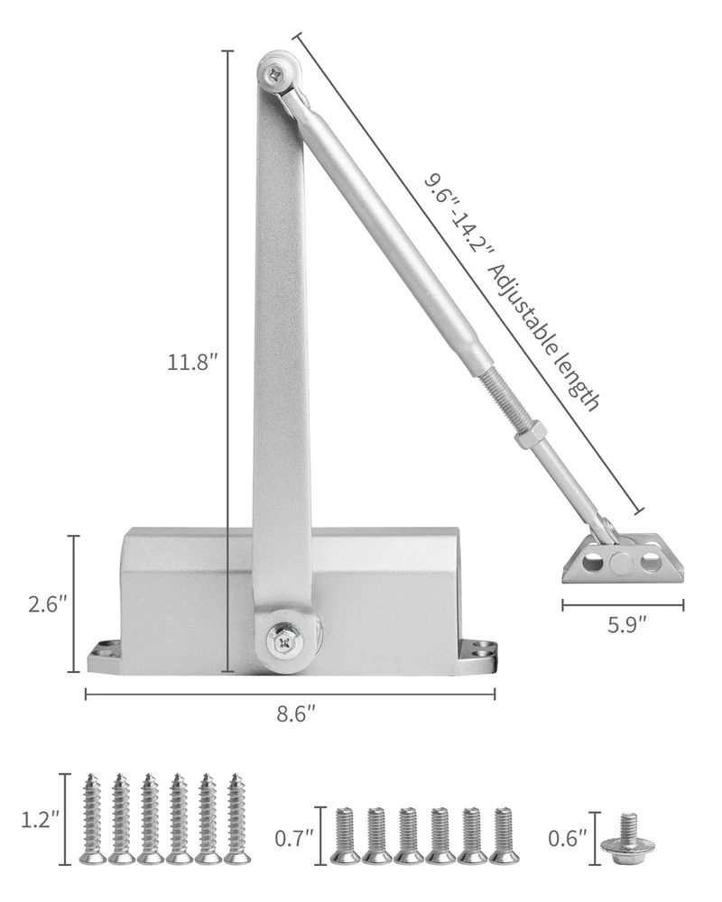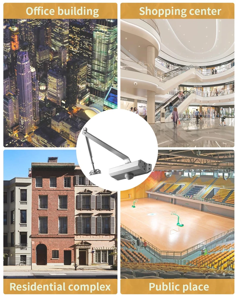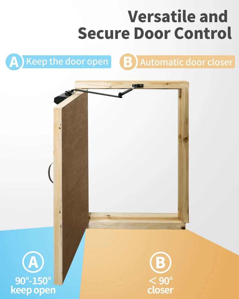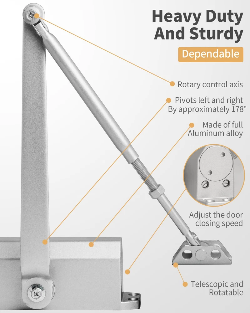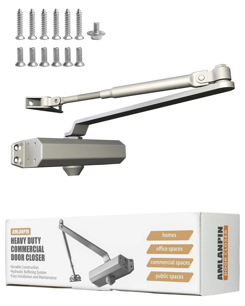 Key Feature Highlight: Door Positioning Functionality Our door closer is equipped with an innovative positioning feature that offers both convenience and versatility in managing door operations. Here's a detailed explanation of its unique capabilities: Automatic Closing at Smaller Angles: The door closer is designed to automatically close the door when it is opened to an angle less than 90 degrees, ensuring a secure and swift door closure. Positioning and Non-Positioning Modes: With the flexibility of two operational modes, you can choose between a fully automatic closing system or a positioning mode that holds the door open for ventilation purposes. Ventilation and Door Holding: The positioning feature is ideal for situations where you need to keep doors open for air circulation. It can replace the function of a door stop, offering two functionalities in one product. Adjustable Range for Holding Open: The door closer maintains its position within an angle range of 90 to 150 degrees, providing a stable and secure holding mechanism for doors that need to be propped open. This feature not only enhances the functionality of your door closer but also adds a layer of customization to suit various needs and preferences. Our door closer comes with a unique dual functionality: when the door is opened to an angle less than 90 degrees, it automatically closes the door, ensuring a secure and swift closure; whereas when the door is opened to an angle greater than 90 degrees, it stably positions the door, acting as a door stop, facilitating ventilation and keeping the door propped open. This design allows the door closer not only to automatically close the door but also to hold it open as needed, providing users with additional convenience and flexibility. Hydraulic Buffering System: Our door closer is equipped with a high-performance hydraulic buffering system that ensures smooth and controlled door closing, reducing noise and wear. Durable Construction: Crafted from high-quality aluminum alloy, the door closer is designed for longevity. Its robust build endures frequent use in both residential and commercial door applications, offering reliability and peace of mind. Fully Adjustable: With two independent valves, you can adjust both the sweep motion and the catch-closing mechanism of your door arm closer, so you can set the opening force and closing speed of your door. Easy Installation and Maintenance: Designed with user-friendliness in mind, the door closer is easy to install and maintain. Its straightforward operation and minimal maintenance requirements make it a favorite among professionals and DIY enthusiasts alike. Before installing the door closer, it is recommended to watch the installation video first. The key detail to pay attention to is to adjust the adjustment rod to be perpendicular to the door frame, then connect the connecting rod with the drive plate, and ensure that every step is carried out according to the video to guarantee the correct installation and use of the door closer.