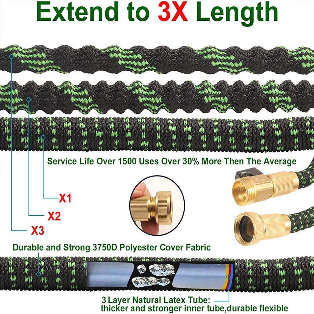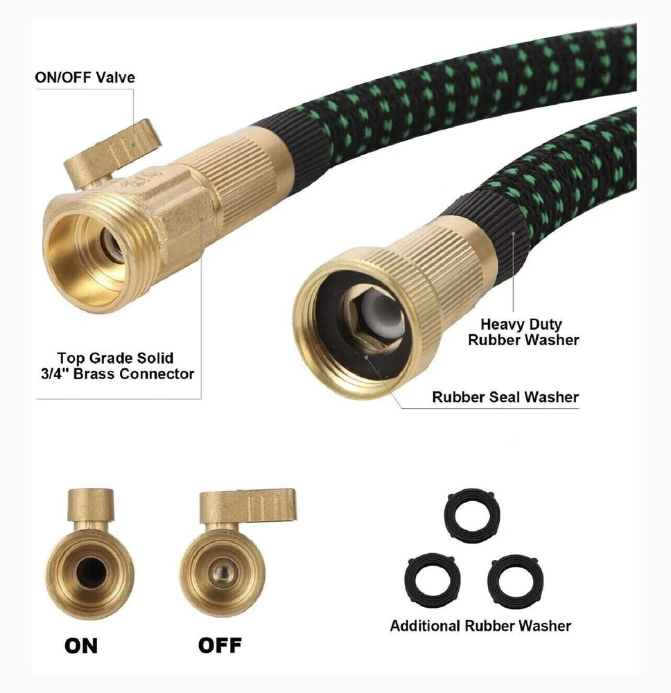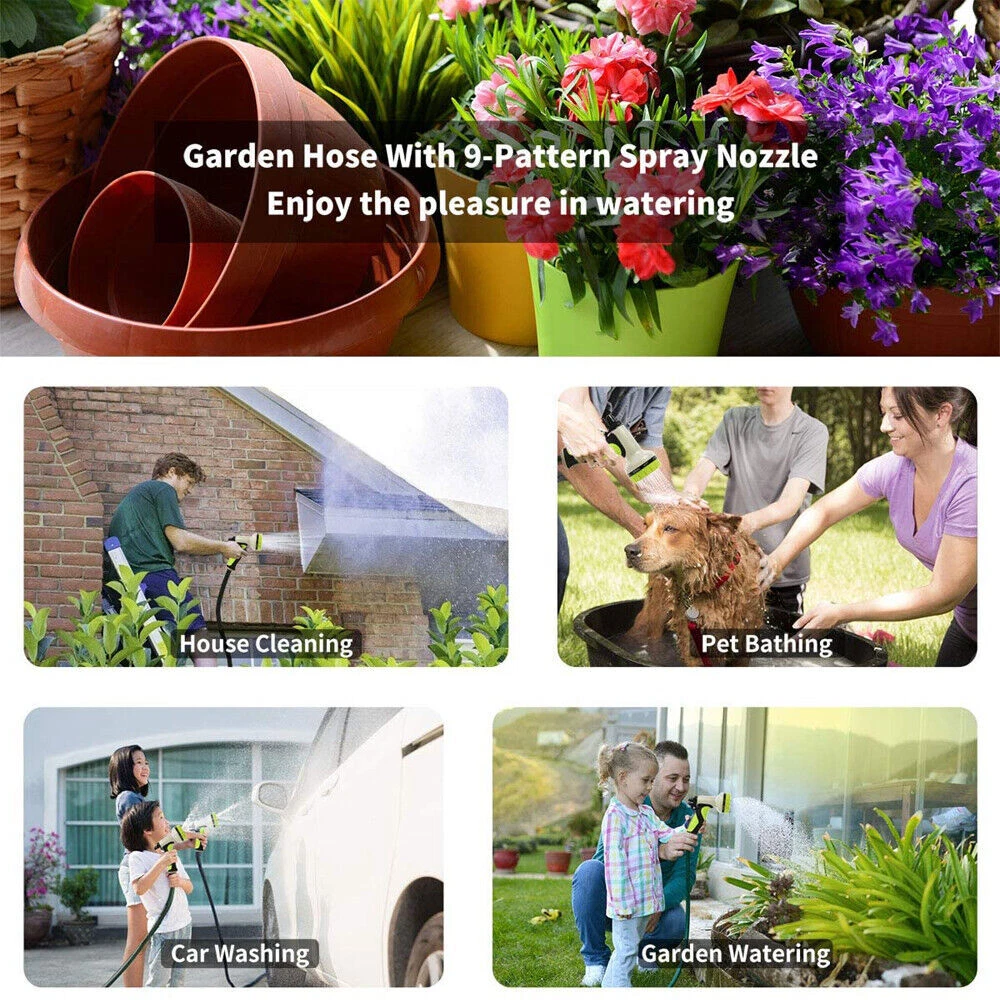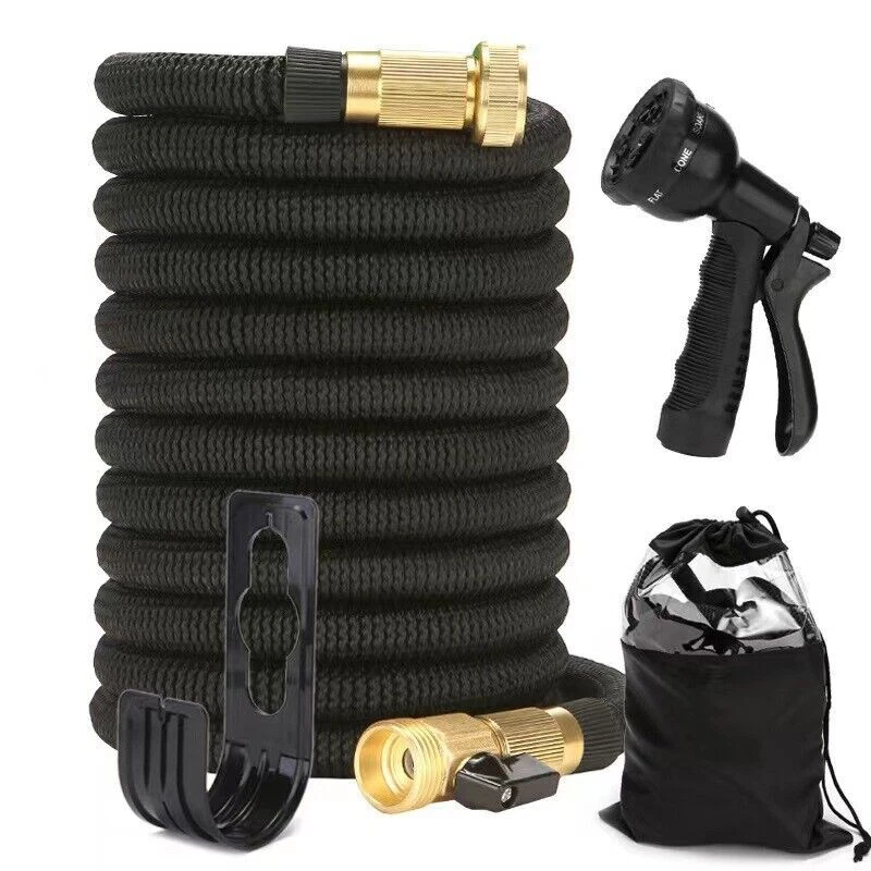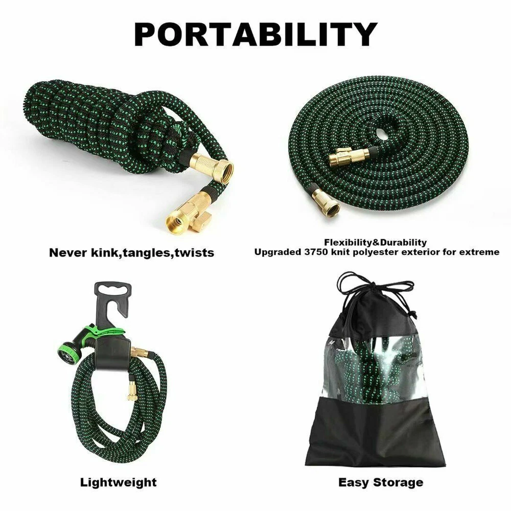 Store Categories Store Categories Other Details Features: Durable Water Hose - Expandable garden hose is made of the high-quality materials. Solid 3/4 Inches brass connectors, rubber washer, sturdy on/off valve, zinc alloy spray nozzle, extra-flexible 3750D polyester fabric cover; Stretchable designed strong expandable garden hose will withstand burst and leaks. Flexible Garden Hose - Our flexible garden hose expands 50 feet in length. When the water is turned on the hose quickly expands up to 3 times (50 ft) in length with the water pressure and recover in minutes to its original length (17ft) when the water is out. Just make sure there is enough water pressure to expand the hose. Hose with 9 Function Spray Nozzle -garden hose is designed with 9 styles hose spray, this high-pressure garden hose is universal for all kinds of garden watering jobs. Watering the garden plants and flowers, washing the car, taking a bath for your pet or cleaning outdoor windows in a simple way! Easy to Use and Store - This expandable water hose will never tangle, twist, or kink. Flexible and easy to handle the hose will roll up into storage bag in the package. Lightweight, portable, flexible water hose is esay to store and organize, makes your gardening easier. Multi-use Watering Hose - The expandable hose has wide range of applications: watering garden, cleaning the house, cleaning the floor, cleaning the yard, cleaning the pool, washing the car, bathing pets, etc. Can also be used as water toy in summer, enjoy fun and relax with your kids. 50FT-15M Extended : Unused 16ft( 5m ), Fully stretched 50ft ( 15m) 75FT-22M Extended : Unused 25ft( 7.5m ), Fully stretched 75ft ( 22.5m) 100FT-30M Extended : Normally 33ft( 10m ), Fully stretched 100ft ( 30m) Specification : - Water hose PIGE: seamless high strength braided fabric over latex expansion hose - Material. Latex tube engineering plastic high-strength woven fabric - Connector TIE-IN: Aluminum pressure connector - Product color: Black and Green - Product use: car washing, watering, cleaning Note: The length of the stretch is determined by the water pressure. If the water pressure is not enough, the maximum stretch length may not be reached. Hope you can understand. How to use the water hose? Connect the female end to the faucet. Fix the nozzle. Although it can be used without a nozzle, the hose will not expand sufficiently without the correct water pressure provided by the nozzle. Gradually open the faucet and increase the water flow until the hose is fully expanded. When watering is complete, turn off the faucet. Release any remaining water in the hose. Do not leave water on when not in use. Store out of direct sunlight and keep indoors in winter. Packaging : 1x Expandable garden hose 1x Spray gun 2x Brass fittings (3/4" and 1/2") 1x Hanger 1x Storage bag Shipping Policy Payment Method Returns Policy Shipping Policy Once your shipment has been dispatched you will receive an email with your track and trace number, which you can use to follow your shipment’s progress. Some orders are shipped in multiple packages due to their size or weight, in such cases you will receive an individual tracking number for each package. The order will be prepared for dispatch on the day the order was placed, and shipped within one business day. Payment Method 1. We accept PayPal payment only, if you want to buy more than one item from us, please contact us make a offer. 2. Payment should be completed within 4 (Four) days of auction closing. Or unpaid dispute will be filed for closing auction. 3. We will leave a positive feedback immediately after payment is received. We appreciate a positive feedback as much as you do. If for some reason there is any issue with the purchase, please contact us prior to leaving feedback, and we will be glad to work with you to have it resolved. Returns Policy We are sure you will be pleased with your purchase from our eBay Store. However, unfortunately there may be occasions when you will need to return items to us. 1. Non Receipt Of Items If you have not received your items you must let us know within 7 days from the estimated delivery date. Once we know you have not received your item we will investigate the matter fully both internally and with our carriers. Unfortunately we cannot investigate non receipt deliveries after this time has elapsed. Investigations into lost parcels can take up to 14 days. Refunds or replacements will not be issued until the investigation is complete. Orders sent by Royal Mail: We do advise that the majority of orders are received within 1-3 working days of dispatch. However, for Royal Mail to class the order as lost in the post we have to allow them 15 working days to deliver before we can arrange a replacement or a refund [this is a Royal Mail rule]. Unfortunately, once the order has been dispatched it is then the responsibility of Royal Mail to deliver your item, and as much as we would like to resolve this for you today we do have to allow them this timescale to deliver. If you still haven't received it by the 15th working day, please contact us via eBay & we will investigate the matter for you. 2. Product purchased for USE outside the UK All our products are warrantied and designed for use within the UK. E.g. UK 3 Pin plug and 240v Supplies where applicable. Product warranties are also only valid in the UK and if there a fault with your product this must be sent back to our UK head office for refund or replacement. 3. Returns from outside the UK If you purchase an item from our UK store then the return process is slightly different as we are based in the UK and you are taking the option to purchase from our UK Store. With this in mind any return to would be at the cost of the buyer under all circumstances. 4. Items Damaged in Transit If your item is damaged in transit, we ask that you report it to us within 3 working days (24 hours for our business customers). If the items are visibly damaged on receipt, please 