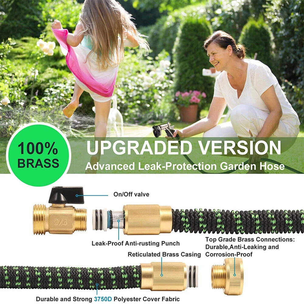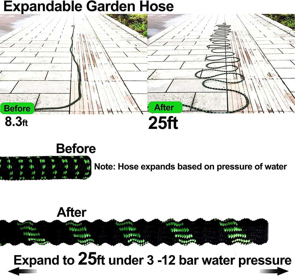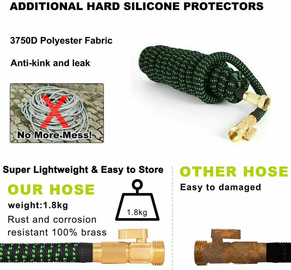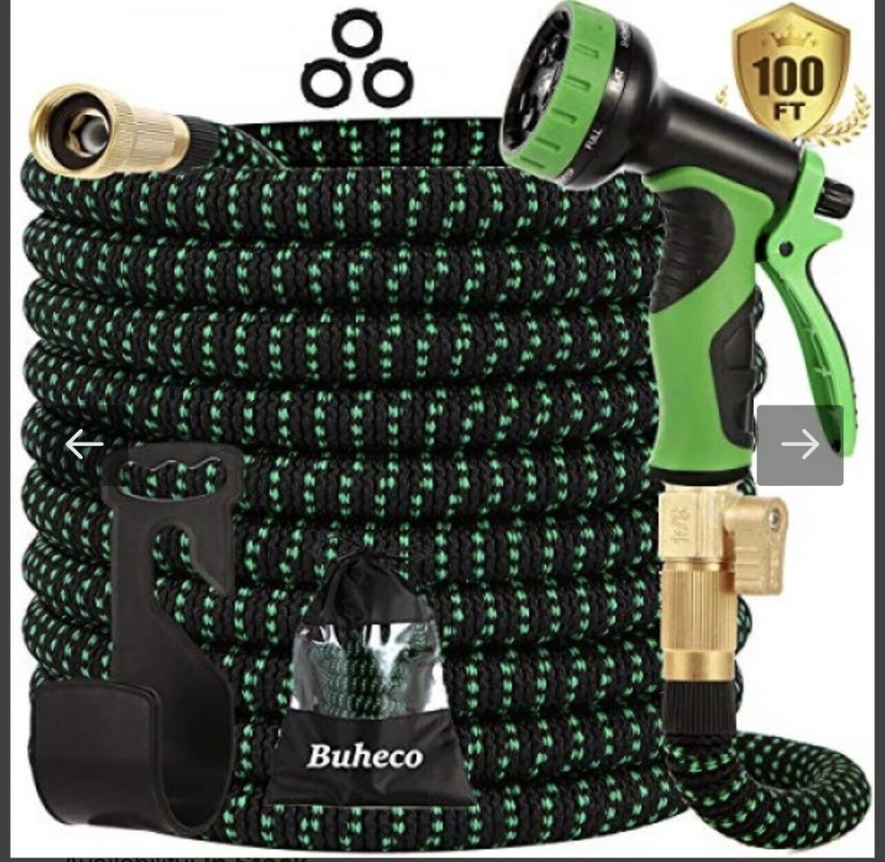 Store Categories Store Categories Other Details Features: Durable Water Hose - Expandable garden hose is made of the high-quality materials. Solid 3/4 Inches brass connectors, rubber washer, sturdy on/off valve, zinc alloy spray nozzle, extra-flexible 3750D polyester fabric cover; Stretchable designed strong expandable garden hose will withstand burst and leaks. Flexible Garden Hose - Our flexible garden hose expands 50 feet in length. When the water is turned on the hose quickly expands up to 3 times (50 ft) in length with the water pressure and recover in minutes to its original length (17ft) when the water is out. Just make sure there is enough water pressure to expand the hose. Hose with 9 Function Spray Nozzle -garden hose is designed with 9 styles hose spray, this high-pressure garden hose is universal for all kinds of garden watering jobs. Watering the garden plants and flowers, washing the car, taking a bath for your pet or cleaning outdoor windows in a simple way! Easy to Use and Store - This expandable water hose will never tangle, twist, or kink. Flexible and easy to handle the hose will roll up into storage bag in the package. Lightweight, portable, flexible water hose is esay to store and organize, makes your gardening easier. Multi-use Watering Hose - The expandable hose has wide range of applications: watering garden, cleaning the house, cleaning the floor, cleaning the yard, cleaning the pool, washing the car, bathing pets, etc. Can also be used as water toy in summer, enjoy fun and relax with your kids. 50FT-15M Extended : Unused 16ft( 5m ), Fully stretched 50ft ( 15m) 75FT-22M Extended : Unused 25ft( 7.5m ), Fully stretched 75ft ( 22.5m) 100FT-30M Extended : Normally 33ft( 10m ), Fully stretched 100ft ( 30m) Specification : - Water hose PIGE: seamless high strength braided fabric over latex expansion hose - Material. Latex tube engineering plastic high-strength woven fabric - Connector TIE-IN: Aluminum pressure connector - Product color: Black and Green - Product use: car washing, watering, cleaning Note: The length of the stretch is determined by the water pressure. If the water pressure is not enough, the maximum stretch length may not be reached. Hope you can understand. How to use the water hose? Connect the female end to the faucet. Fix the nozzle. Although it can be used without a nozzle, the hose will not expand sufficiently without the correct water pressure provided by the nozzle. Gradually open the faucet and increase the water flow until the hose is fully expanded. When watering is complete, turn off the faucet. Release any remaining water in the hose. Do not leave water on when not in use. Store out of direct sunlight and keep indoors in winter. Packaging : 1x Expandable garden hose 1x Spray gun 2x Brass fittings (3/4" and 1/2") 1x Hanger 1x Storage bag Shipping Policy Payment Method Returns Policy Shipping Policy Once your shipment has been dispatched you will receive an email with your track and trace number, which you can use to follow your shipment’s progress. Some orders are shipped in multiple packages due to their size or weight, in such cases you will receive an individual tracking number for each package. The order will be prepared for dispatch on the day the order was placed, and shipped within one business day. Payment Method 1. We accept PayPal payment only, if you want to buy more than one item from us, please contact us make a offer. 2. Payment should be completed within 4 (Four) days of auction closing. Or unpaid dispute will be filed for closing auction. 3. We will leave a positive feedback immediately after payment is received. We appreciate a positive feedback as much as you do. If for some reason there is any issue with the purchase, please contact us prior to leaving feedback, and we will be glad to work with you to have it resolved. Returns Policy We are sure you will be pleased with your purchase from our eBay Store. However, unfortunately there may be occasions when you will need to return items to us. 1. Non Receipt Of Items If you have not received your items you must let us know within 7 days from the estimated delivery date. Once we know you have not received your item we will investigate the matter fully both internally and with our carriers. Unfortunately we cannot investigate non receipt deliveries after this time has elapsed. Investigations into lost parcels can take up to 14 days. Refunds or replacements will not be issued until the investigation is complete. Orders sent by Royal Mail: We do advise that the majority of orders are received within 1-3 working days of dispatch. However, for Royal Mail to class the order as lost in the post we have to allow them 15 working days to deliver before we can arrange a replacement or a refund [this is a Royal Mail rule]. Unfortunately, once the order has been dispatched it is then the responsibility of Royal Mail to deliver your item, and as much as we would like to resolve this for you today we do have to allow them this timescale to deliver. If you still haven't received it by the 15th working day, please contact us via eBay & we will investigate the matter for you. 2. Product purchased for USE outside the UK All our products are warrantied and designed for use within the UK. E.g. UK 3 Pin plug and 240v Supplies where applicable. Product warranties are also only valid in the UK and if there a fault with your product this must be sent back to our UK head office for refund or replacement. 3. Returns from outside the UK If you purchase an item from our UK store then the return process is slightly different as we are based in the UK and you are taking the option to purchase from our UK Store. With this in mind any return to would be at the cost of the buyer under all circumstances. 4. Items Damaged in Transit If your item is damaged in transit, we ask that you report it to us within 3 working days (24 hours for our business customers). If the items are visibly damaged on receipt, please 