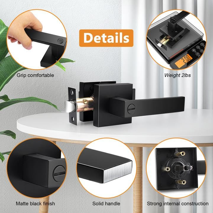 【Improve Your Home】: These square door lock meant to create an elegant effect to give your home the perfect finishing touch. Upgrade handle with provides a comfortable grip but a decorations to be used to enhance the beauty of your home. In contrast to other metal door handles, these handles provide a comfortable touch, which more suitable for colder or wetter conditions 【Upgrade Version】: Compared with other door locks, this privacy door handle help you to open and close your doors with less effort and freed your hands for other tasks. Upgraded internal structure not only strengthens the stability, but also prolongs the service life of the door handles 【Keyless Privacy Feature】: Privacy door Lever without keys could be locked and opened by a thumb-turn button from inside and a coin or slotted screwdriver could be a emergency tool to open and lock it from outside. This privacy door lever is best used for the room of privacy function needs, like bedroom, bathroom, guest room or office meeting room, where the easy locking & opening needs from inside is needed 【Easy to Install】: This interior privacy door Knobs come with all accessories to help you complete installation and upgrade existing interior in less time with only a screwdriver and no need for professional door fitters. It fits both right and left handed doors, which help you to make a simple installation without reversible the hand levers 【Adjustable Latch】: This privacy door locks comes with an adjustable latch 2-3/8" or 2-3/4"(60mm or 70mm) to fit all standard doors from 1-3/8" to 1-3/4" (35mm-45mm) thick. Lever Length: 4.88" (124mm), Rosette Diameter: 2.56" (65mm). The latch plate is square, and can't be removable
