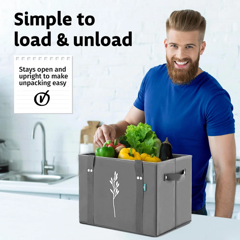 HEAVY DUTY - Our grocery bags are strong & durable, made from non-woven fabric, and able to hold up to 65 lbs! The handles are extra strong and long to easily carry around your shoulder, making any grocery or shopping trip a breeze! STURDY - Tired of your shopping bag not stay upright when you are packing it or storing it in the car? We're here to help. The sides of our reusable grocery bags heavy duty stay stiff and have a reinforced bottom to ensure nothing spills over. REUSABLE - Sick of having plastic bags lying around the kitchen? Us too. Our foldable tote bag are large enough to store all your shopping needs and each bag replaces 6 plastic bags and 4 paper bags! EASY TO CLEAN - We understand that things can get messy sometimes. Whatever the mess, these water resistant large reusable shopping bags can be easily hand washed to scrub it up! SHOP WITH EASE - Love to shop? These reusable bags can be great for any shopping trip. Whether it's to the grocery store, mall, or your local shop, our multi-use tote will be ready!