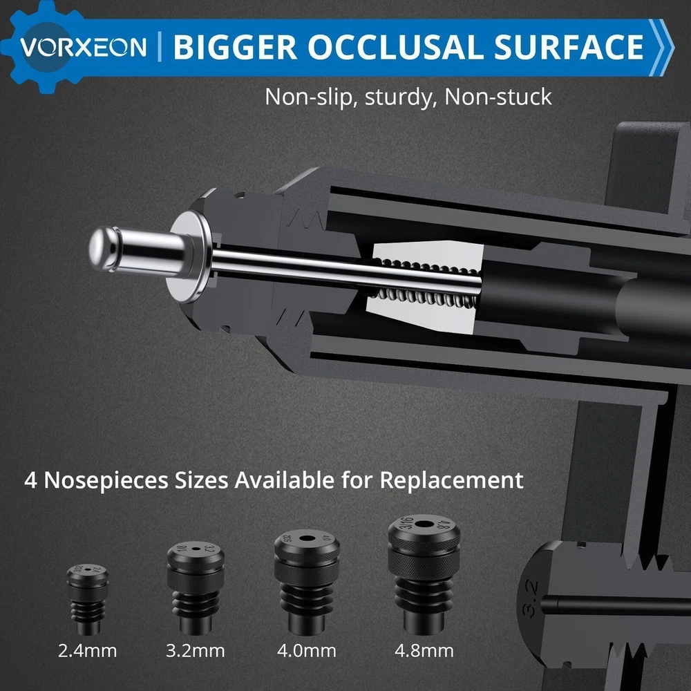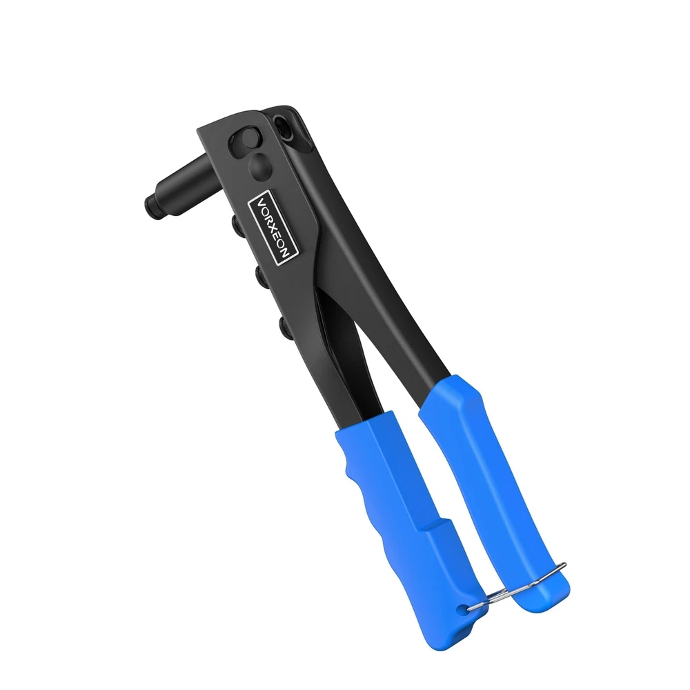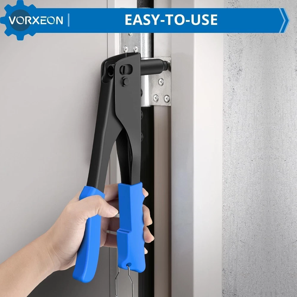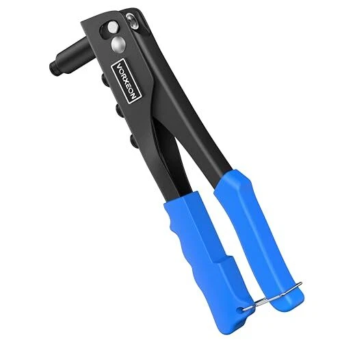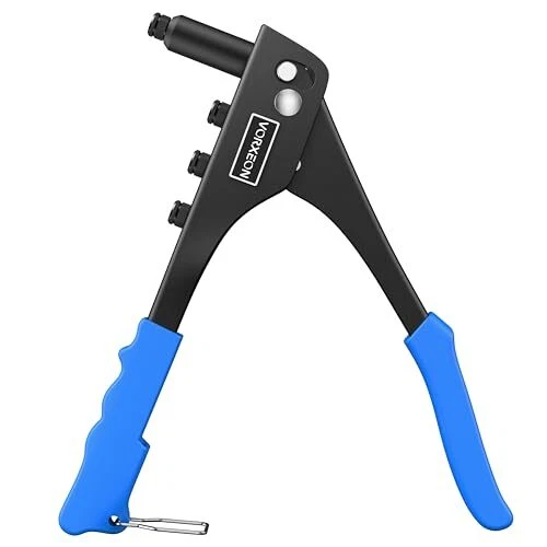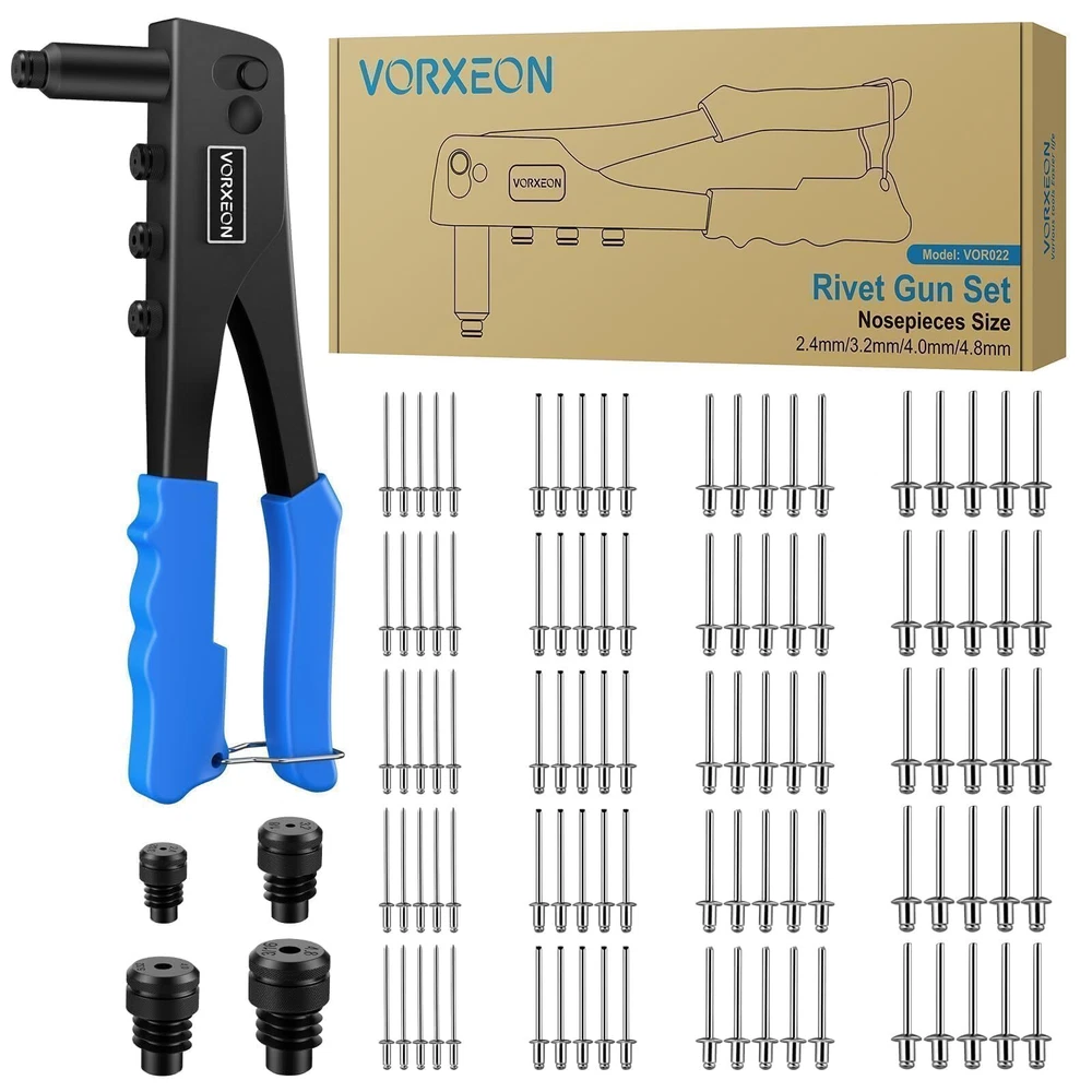 【Sturdy】The Rivet Gun is made of high-quality steel, with high hardness and rust resistance after heat treatment, ensuring a long lifespan. The jaws that grip the rivets are made of Cr-Mo steel, providing enhanced gripping power 【4 Sizes Mandrels】The Rivet Gun is compatible with four different sizes of rivets: 3/32" (2.4mm), 1/8" (3.2mm), 5/32" (4.0mm), and 3/16" (4.8mm). No additional tools are required; you can easily replace the different-sized Rivet Nozzles by hand. The kit also includes 100 pieces of rivets, providing you with a more convenient work experience 【Non-slip Handle】The handle of the heavy duty rivet tool is made of PVC, which is non-slip and easy to grip, making it perfect for repetitive work. With increased power and less vibration during operation and easy operation, our heavy duty hand riveter saves time and energy, and it doesn't fatigue our hands 【Easy Storage】At the bottom of the hand rivet tool, there is a stainless steel buckle. When we are not using the nut tool, you can snap on this safety lock to save space 【Wide Use】rivet insert tool kit is suitable for repair work on cars, boats, furniture and machines, perfect for DIY enthusiasts
