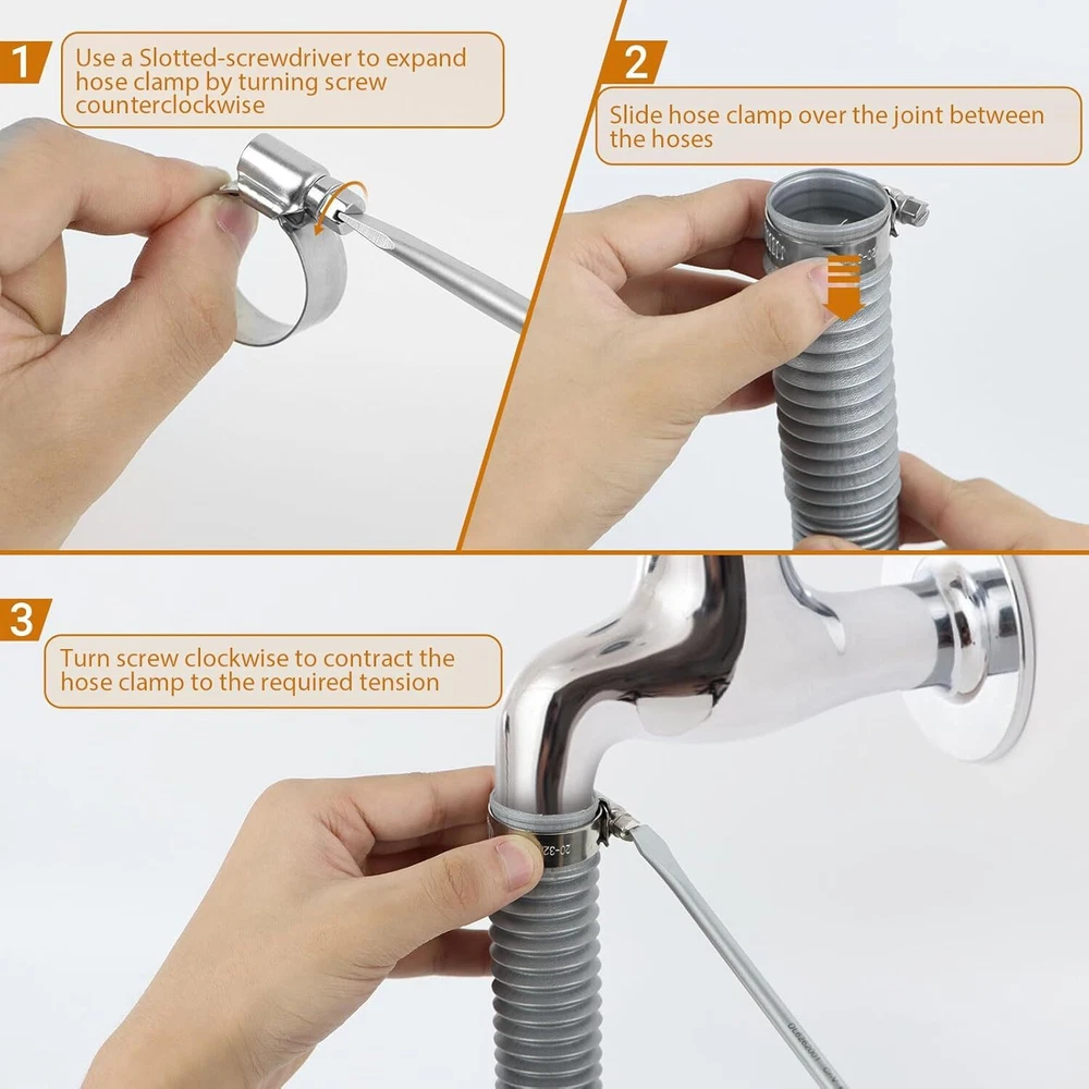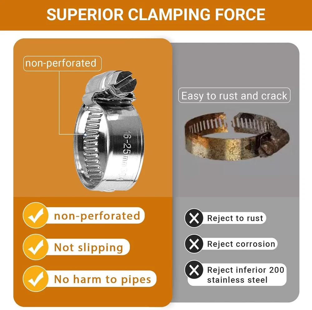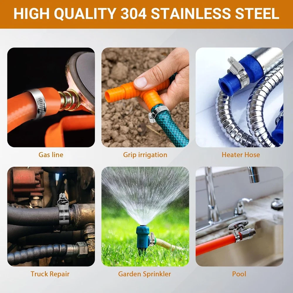 Heavy Duty Hose Clamp Kit - 44PCS,1/4''- 44 Pcs Kit, Silver Product Details Manufacturer: SMLCON Part Number: DSHG Item Weight: 1.37 pounds Product Dimensions: 7.6 x 5.3 x 1.45 inches Item model number: DSHGFT Size: 44 Pcs Hose Clamp Kit Color: Silver Style: Modern Material: Stainless Steel Included Components: hose clamps Batteries Required?: No Material: Stainless Steel Brand: SMLCON Item dimensions L x W x H: 7.6 x 5.3 x 1.45 inches Color: Silver Style: Modern Manufacturer: SMLCON 1. Upgraded Design - Compared to traditional perforated bands, our stainless steel band features a hole-free design, thick and wide, which is hardly affected by over-tightening, deformation, and peeling. This is due to its thicker metal and embossed strap, which can protect the hose from shearing or crushing. Our hose clamp screw is big with deep thread. and the welded worm gear housing can increase the breaking torque by 65%. These hose clamps are high-pressure, providing excellent clamping force and secure sealing. 2. Adjustable Size - The slotted screw is equipped with a hex head. It can be quickly tightened using a screwdriver or a nut driver.The non-perforated hose clamp is flexible and extensible, with adjustable width, and the size range is from 1/4''- 1-1/8''. 3. High Quality Material - Our tubing clamps are made of high quality 304 stainless steel, including the housing, screws, and band. They are compatible with SAE J 1508 standards and ideal for 3/4 silicone heater hose, garden sprinkler, and more. The neutral salt spray(NSS) test is 120 hours, and our SS 304 screws are plated for smooth tightening, enhancing corrosion protection level and meeting the marine grade hose clamps requirement. 4. Hose Protection - Our worm gear hose clamps are designed with a rolled band edge to prevent damage to soft silicone, PVC, or rubber hoses. The non-perforated band prevents extrusion through the band notches, ensuring reliable performance for garden water line tubing, heater pipes, and automotive repairs. 5. Versatile Use - Our clamps are perfect for securing hoses, pipes, cables, tubes, fuel lines, and more. They can be used in automotive, industrial, boat/marine, shield, household, and outdoor settings. Introducing the SMLCON Premium 304 Stainless Steel Hose Clamp Assortment Kit - the ultimate solution for enhancing your tool collection. Crafted from heavy-duty 304 stainless steel band, housing, and screw, our hose clamps offer unparalleled quality and exceptional resistance to corrosion. Featuring a flexible and ductile design, our fuel line hose clamps boast a wide adjustable size range. The worm gear mechanism enables precise adjustment of the clamp’s diameter, ensuring a tight and secure seal. Designed specifically for use in confined spaces, our hose clamps are the ideal choice for preventing flow leakage. With their easy-to-use tightening and loosening mechanism, installation becomes a breeze. Whether for industrial, automotive, electronic, or home applications, SMLCON hose clamps is a secure fitting for hoses, pipes, cables, tubes, fuel lines, and more - even in water salt environments. Package includes: 8-12mm (or 5/16 - 1/2 inch) ---10pcs 10-16mm (or 3/8 - 5/8 inch) ---10pcs 12-20mm (or 1/2 - 3/4 inch) ---6pcs 16-25mm (or 5/8 - 1 inch)---6pcs 16-27mm (or 5/8 - 1-1/16inch) ---6pcs 20-32mm (or 3/4 - 1-1/4 inch) ---6pcs