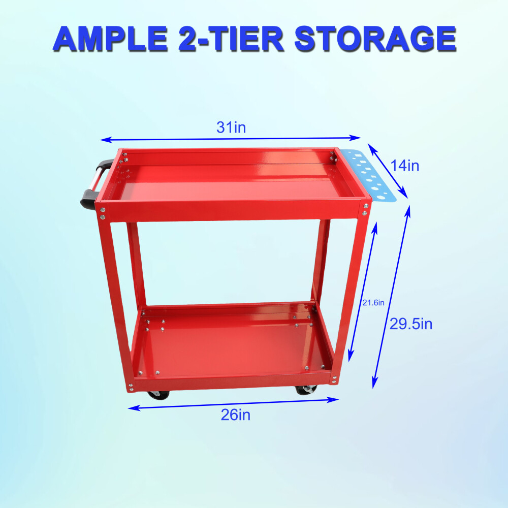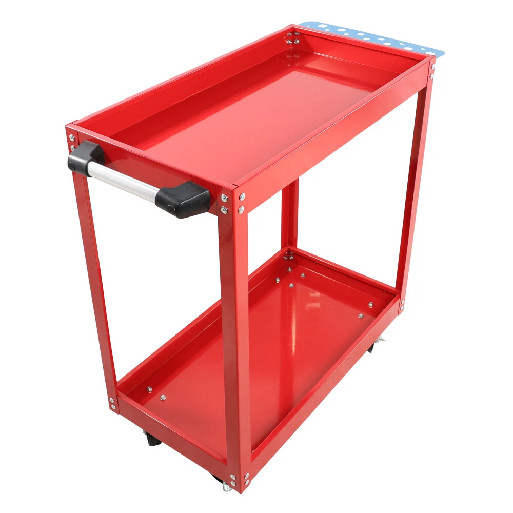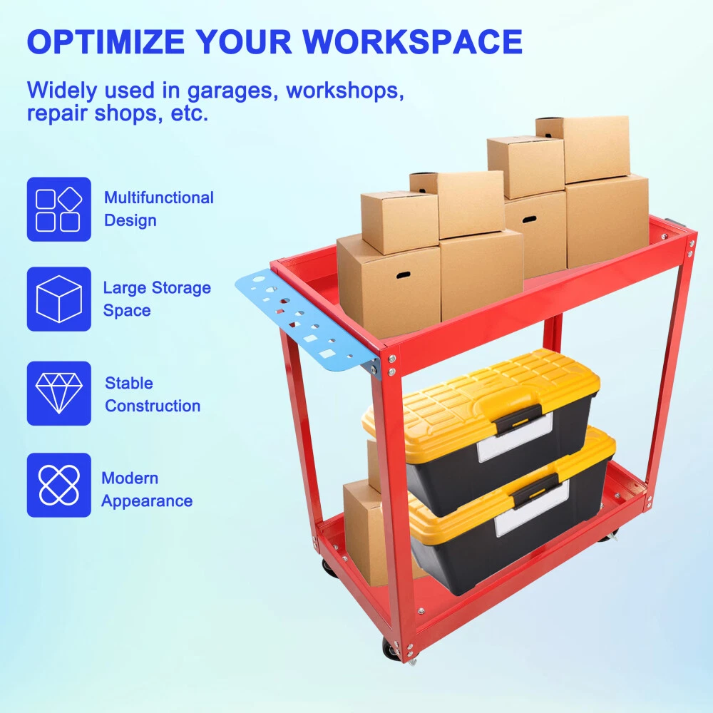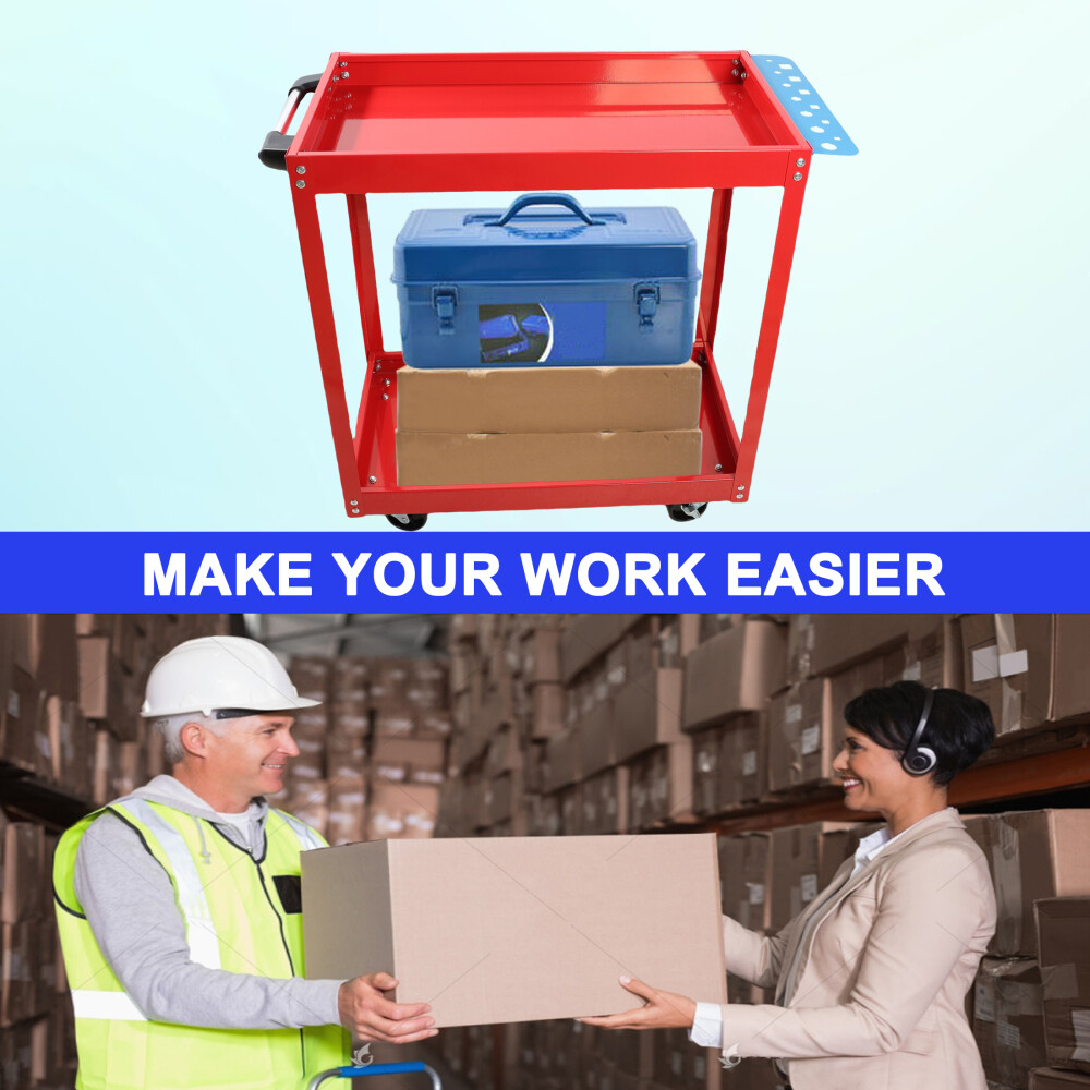 Product Features Built with heavy-duty steel, our tool cart is completed with a powder coating finish for superior resistance to rust and corrosion, and is easy to clean. portable toolboxes, helmets, power tools, and more. 400LBS WEIGHT CAPACITY: Made of quality steel, the rolling tool cart can support up to 400lbs. And with powder coating finish, its surface is smooth, which makes it easy to clean. This service tool cart is equipped with 4 lockable 360-degree swivel casters and an ergonomic handle, you can move the heavy-duty steel utility cart to any place without effort. And the brake system makes it convenient for you to stop the rolling tool cart as needed. EASY TO ASSEMBLE: The 2-shelf tool cart is simple in structure and comes with detailed instructions. Assembly of the cart can be done in a breeze. This mechanic cart is suitable for various occasions, such as home, office, restaurant, workshop, garage, warehouses and more. In addition, the heavy-duty tool cart with compact size is perfect for small apartments with limited space, and you can use this metal utility cart to store books, tools, etc. Description
