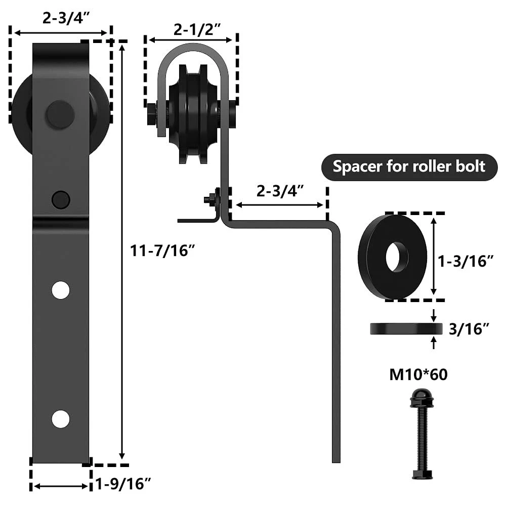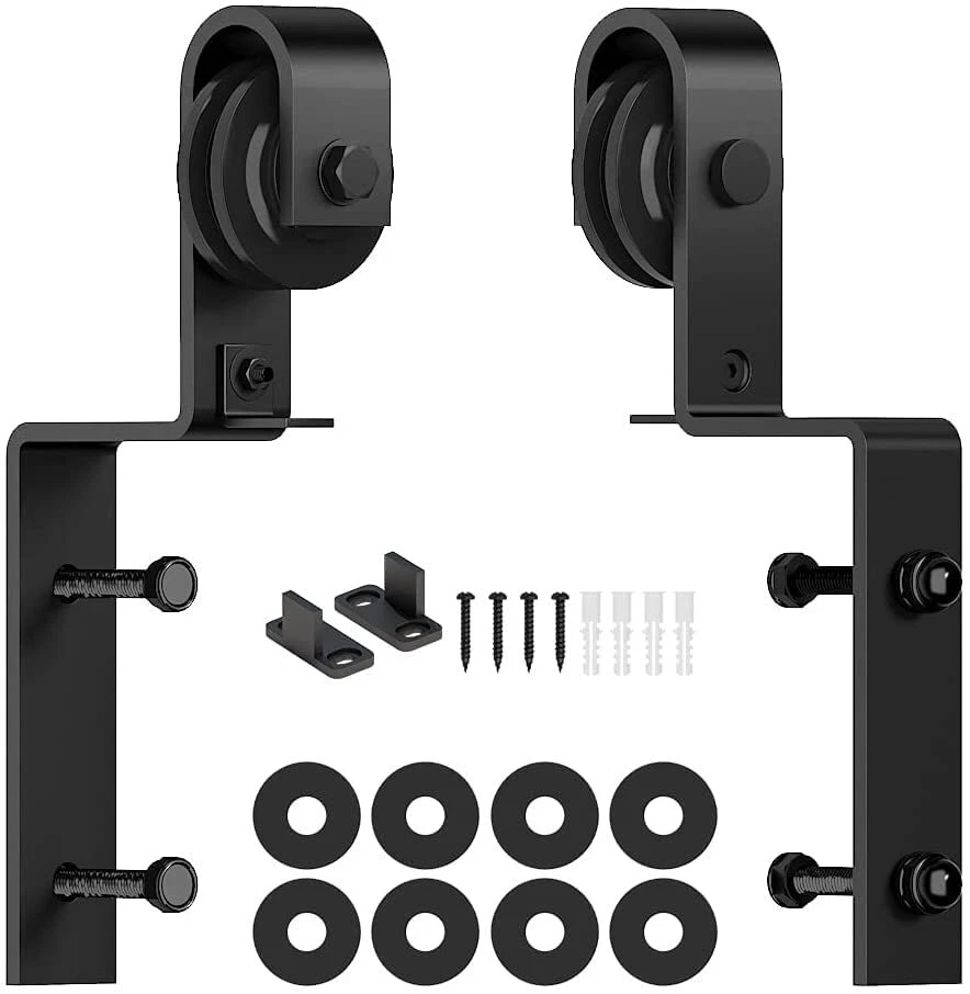 barn door roller ✅ Barn Door Roller - Material: Carbon Steel, Surface: Black Coated . ✅ Package Included: 2 x Right Angle Roller, 2 x anti-jump kit, 1 x Floor Guide,8 x Spacer (for hanger bolts if your barn door is thin) ✅ Door weight capacity: 265 lbs, Door Thickness: 1-3/8" and 1-3/4". ✅ Barn door hanger will fit for barn door track in thickess of 1/4" maximum , ✅ "Only the barn door roller for sale ,barn doors are not including."All the hardware have been inspection in factory before delivery,Passed 150,000 times opening and closing test