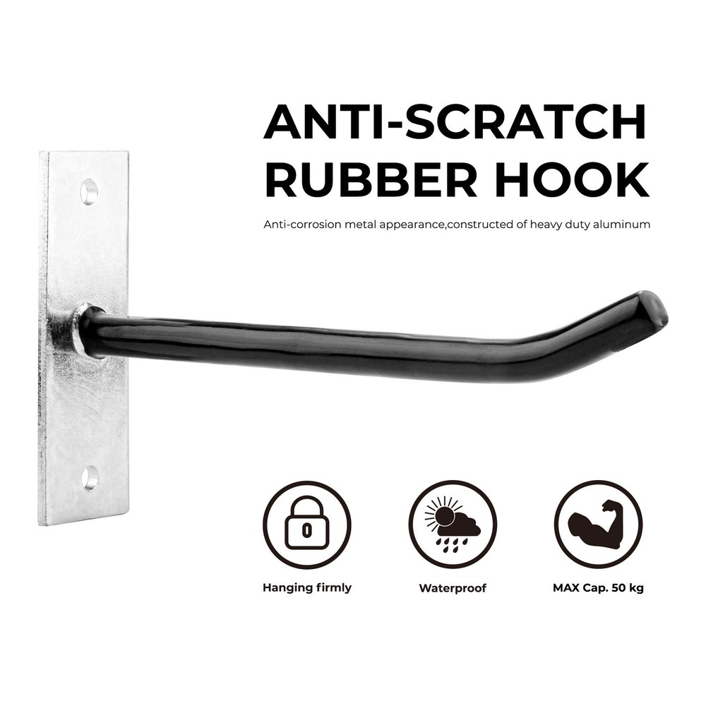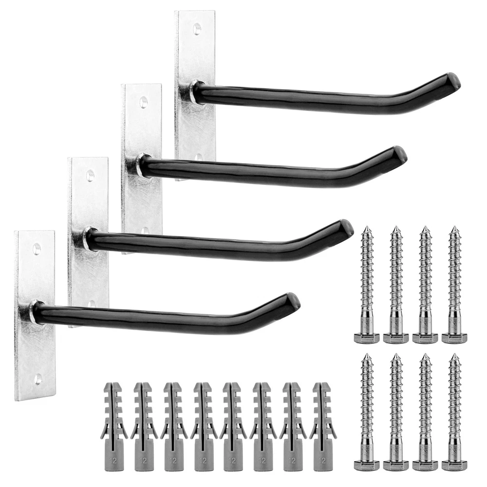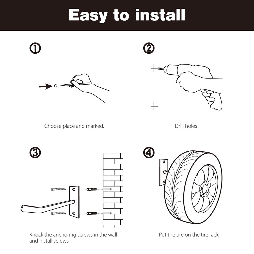 Heavy Duty Steel Garage Wall Mount Tire Wheel Storage Rack Made of heavy duty Steel. Powder coated, rust resistant construction Each tire hook safely hold 110 lbs, perfect for hanging tire. Sturdy utility garage hooks, perfect for hanging yard tools, ladder, leaf, blower, etc Easy to mount garage or shed wall, block or brick with screws included L 9.8" x H 4.7", set of 4