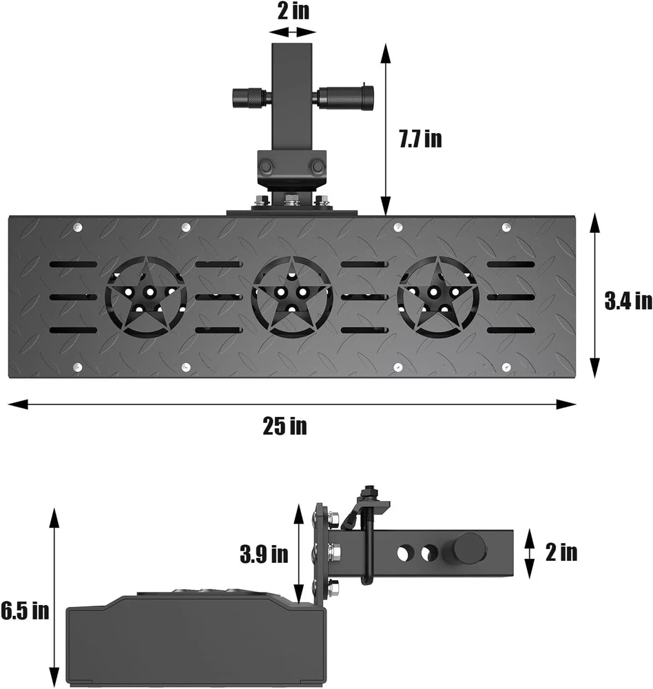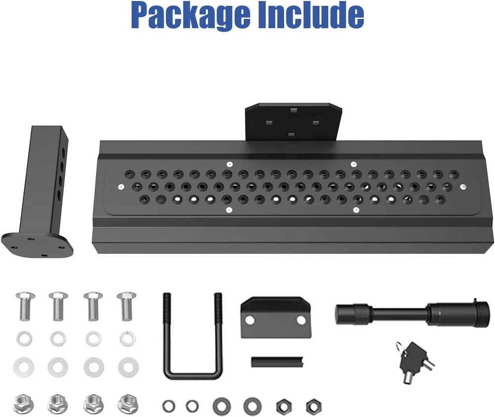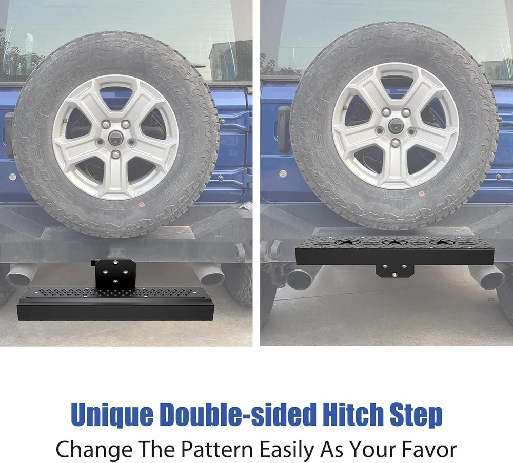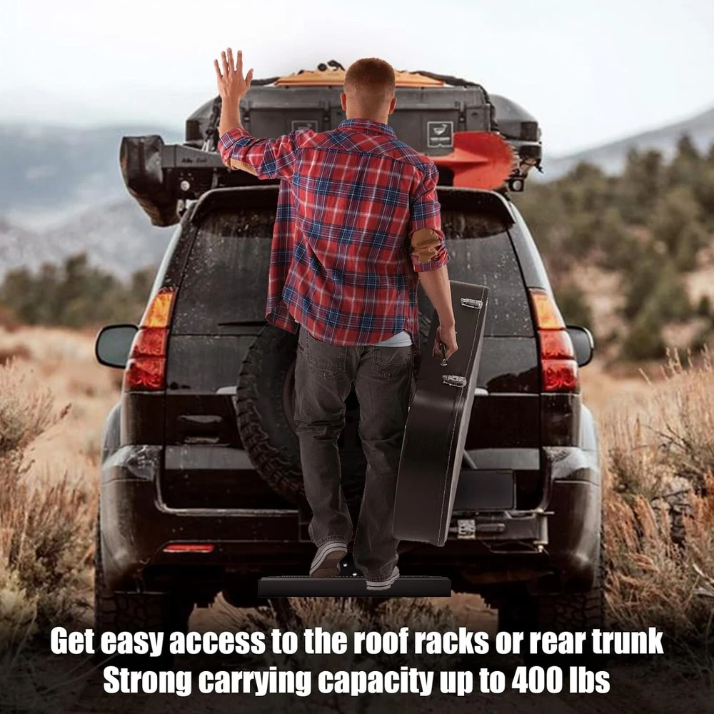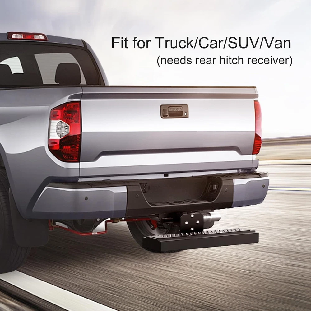 About this item 【Universal Fitment】 Compatible with 2-inch rear hitch receiver, install fast with no drilling or removing(Including safety locks and stabilizers) 【Heavy Duty Hitch Step】 Size for Length: 25". Width: 4". Height: 6.5". Made of 0.12 inch wall thickness tubes with black powder coated finish, durable durability and rust resistance, carrying capacity up to 800 lbs. 【Unique Double Sides Design】 Change the pattern easily as your favor, both side has non-slip design, the height of the pedal can adjusted 4 inch(via converting two sides) 【Helps in Daily Life】 Easy access to roof rack, truck compartment, rear cargo area, has drain holes design no worry with outdoor using, strong and beefy body can reduce the rear end collision. 【Buy With Confidence】 Generally fit for pickup truck/suv/van/Jeep/Ford. We have absolute confidence in the quality of our product, and provide free replacement if you have any issue during your use.