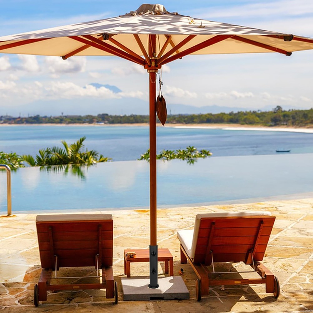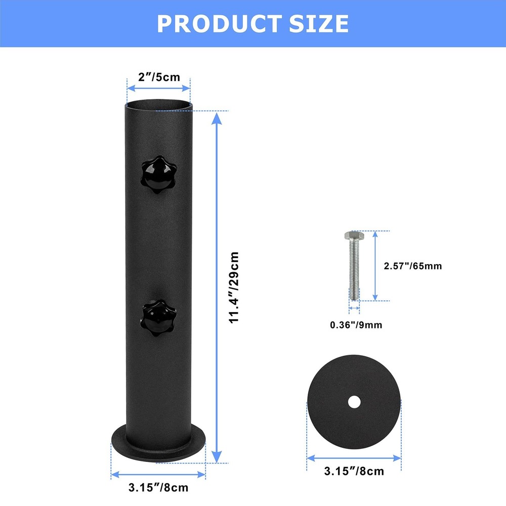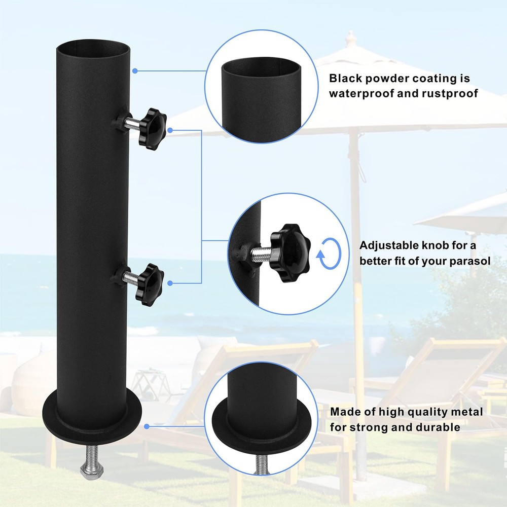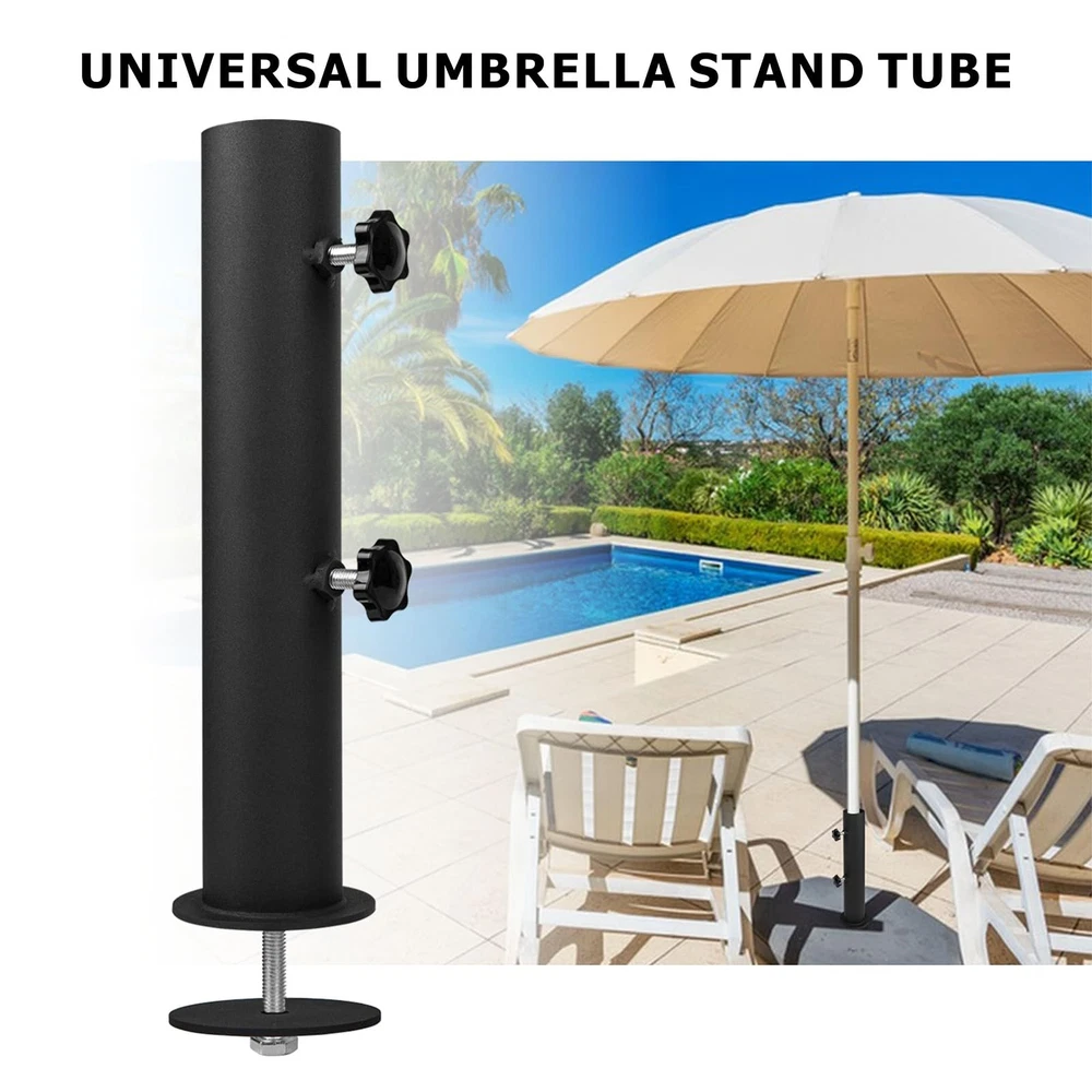 Heavy Duty Universal Granite Umbrella Stand Tube Outdoor, Stone Umbrella Tube Base for Outside, Marble Flag Pole Stake Holder, Table Umbrella Tube Bracket, DIY Patio Umbrella Holder Parts Heavy metal: This granite umbrella holder is made of solid steel, strong and durable, high hardness, not easy to bend or break. The black powder-coated surface is both visually appealing and acts as a protective layer, enhancing resistance to outdoor elements. Adjustable knob: Umbrella holder suitable for 1.5-2 inch umbrella, the knob on the patio umbrella stand is fixed according to the diameter of the umbrella rod, providing a safe and stable installation solution, so that even on windy days no longer shake! Sturdy and reliable: The of the pole of the umbrella holder stand can firmly fix the umbrella on the plane, ensuring that the umbrella will not tilt and fall when the wind is blowing, so that you can enjoy the outdoor leisure time freely. Multifunctional installation: Our umbrella pole mount stand parts set have a screw hole at the bottom and can be attached to a variety of surfaces such as granite, iron, wood, stone and marble. It can be used on the beach, swimming pools, courtyard, etc., providing a variety of placement options. Easy to install: There is a 10mm screw hole at the bottom of the umbrella stand. Now make a 10mm hole on the rock and align the gasket with the screw hole. Put the attached bolt through the screw hole at the bottom of the umbrella tube bracket and the granite slab, and then tighten the screw.