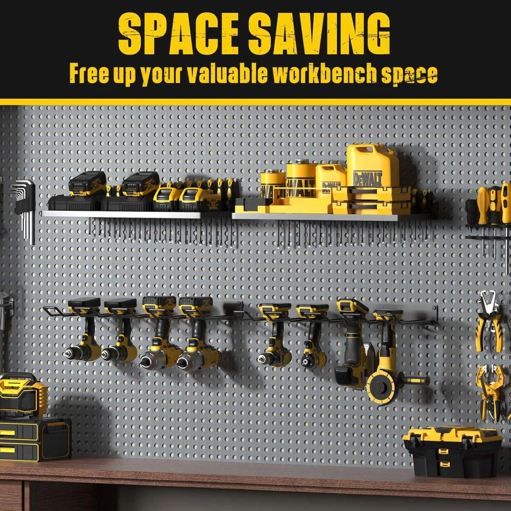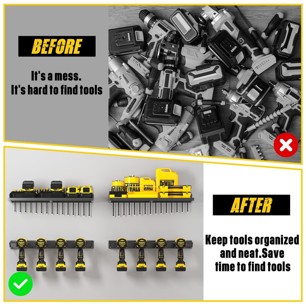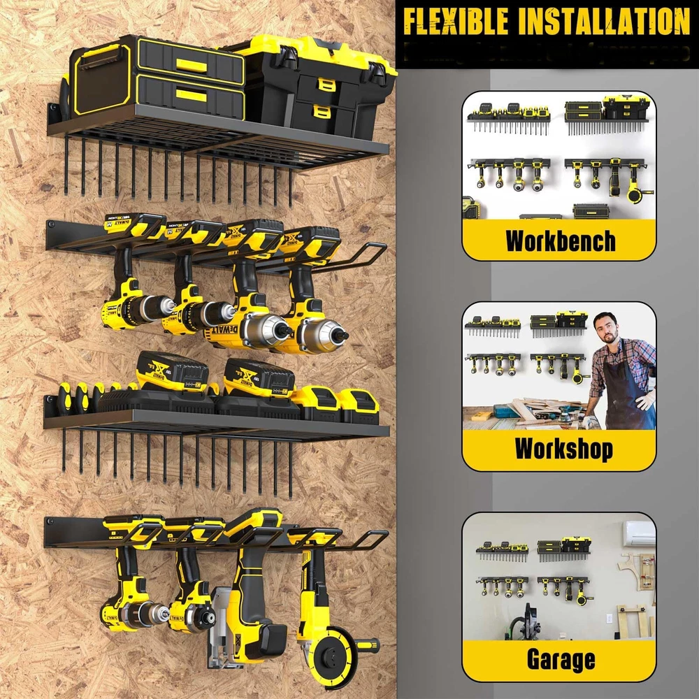 Power Tool Organizer Wall Mount, Heavy Duty Tool Organizers and Storage, Cordless Drill Holder and Battery Shelf, Metal Storage Rack for Garage Organization (Drill 2 racks & 2 shelves) Product Details Size: Drill 2 racks & 2 shelves Brand: MOOMSINE MPN: DH UPC: Does not apply EAN: Does not apply Material: Metal Color: Yellow Special Feature: Rust Resistant Product Dimensions: 8"D x 16.5"W x 1.8"H Shelf Type: Bracket Shelf Material: Metal Color: Yellow Special Feature: Rust Resistant Product Dimensions: 8"D x 16.5"W x 1.8"H Shelf Type: Bracket Shelf Number of Shelves: 2 Room Type: Garage Finish Type: Metal,Polished Finish,Steel Assembly Required: Yes Mounting Type: Wall Mount Recommended Uses For Product: Tools Included Components: Hardware Item Weight: 7 Pounds Brand: MOOMSINE Style: tool Manufacturer: MOOMSINE Part Number: DH Item Weight: 7 pounds Country of Origin: China Item model number: DH Size: Drill 2 racks & 2 shelves Finish: Metal,Polished Finish,Steel Special Features: Rust Resistant Batteries Included?: No Batteries Required?: No Date First Available: October 19, 2022 8 Drill Holder Slots & 2 shelves:Transform wasted wall space into a compact and efficient storage and display area for power and hand tools.This power tool organizer helps you keep all your frequently used project tools organized, save space and control clutter HEAVY DUTY:This cordless tool holder is made of heavy compact steel metal, and the joint of the shelf uses a reinforced design. With plenty of load-bearing testing, our storage rack can hold your power tools of any weight EASY TO INSTALL: No assembly required! Mounting hardware is included DURABLE CRAFTSMANSHIP: With high temperature matte spray paint and polished finish, our power tool holder are resistant to rust and corrosion, scratch-resistant, durable and smooth, which has a lifespan of usage decades EXCELLENT CUSTOMER SERVICE:If you are not satisfied with your purchase, please contact us at any time. The customer service team will reply and resolve your issue within 12 hours