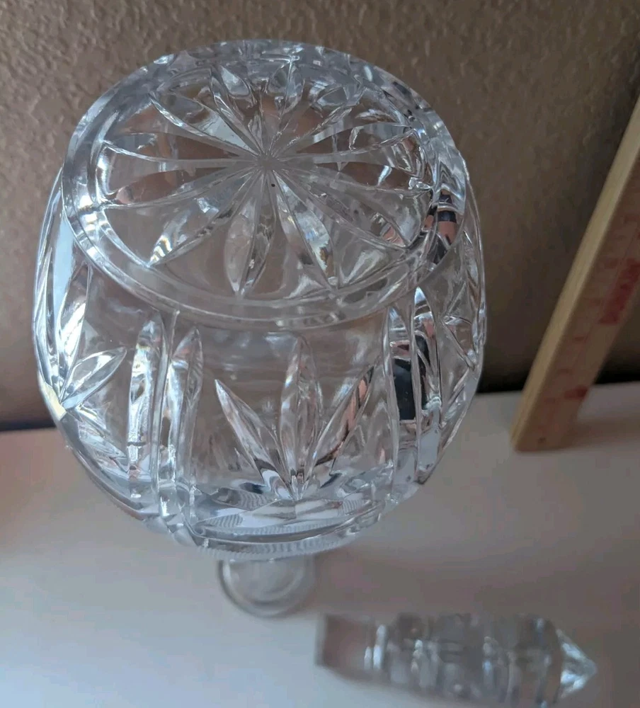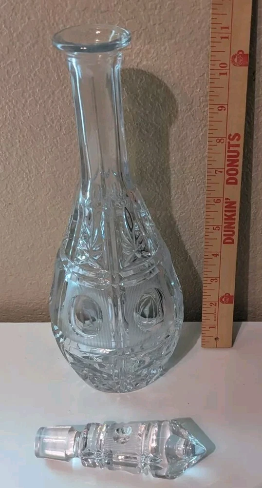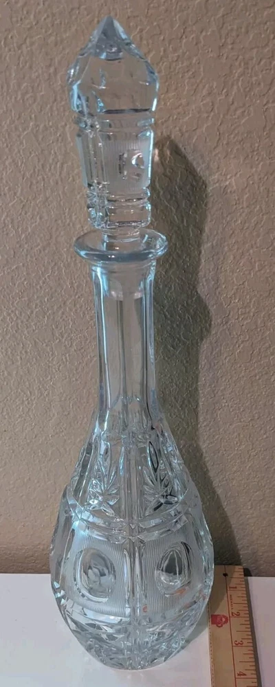 This elegant vintage crystal decanter with stopper is a stunning addition to any barware collection. It stands at approximately 14 inches tall and comes with a lid/stopper. It weighs approximately 3 lbs 14oz and is perfect for storing your favorite liquor or beverage. This decanter is a must-have for any collector or lover of vintage barware. Its sleek and stylish design will make a great addition to any home bar or display case. Personal SKU: KK901242