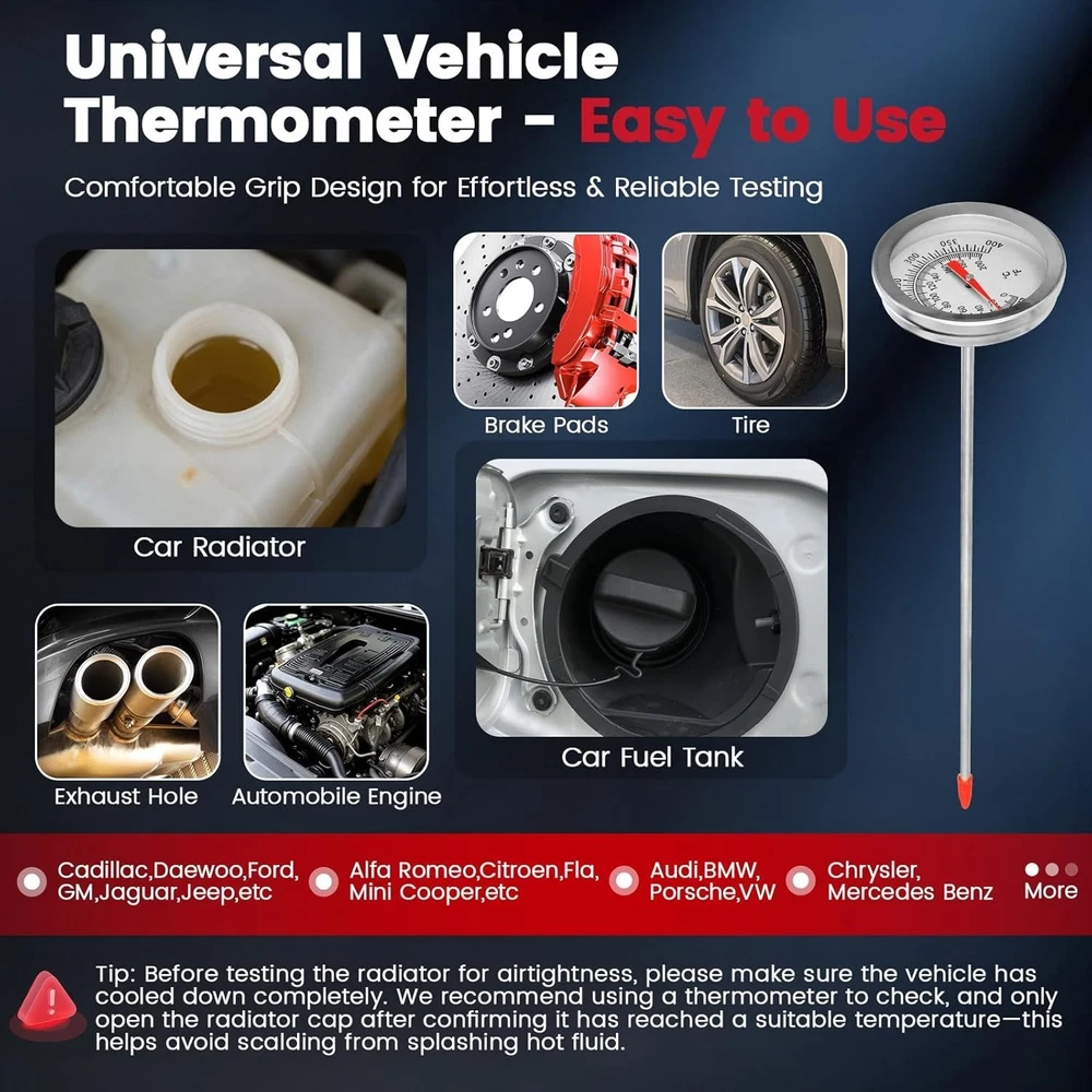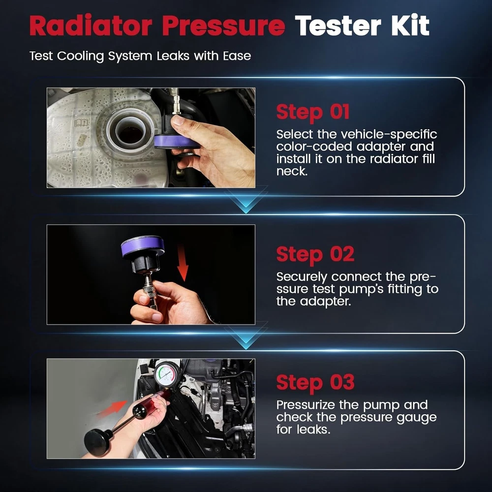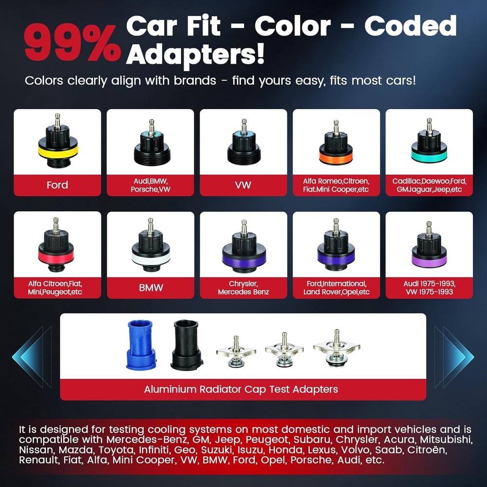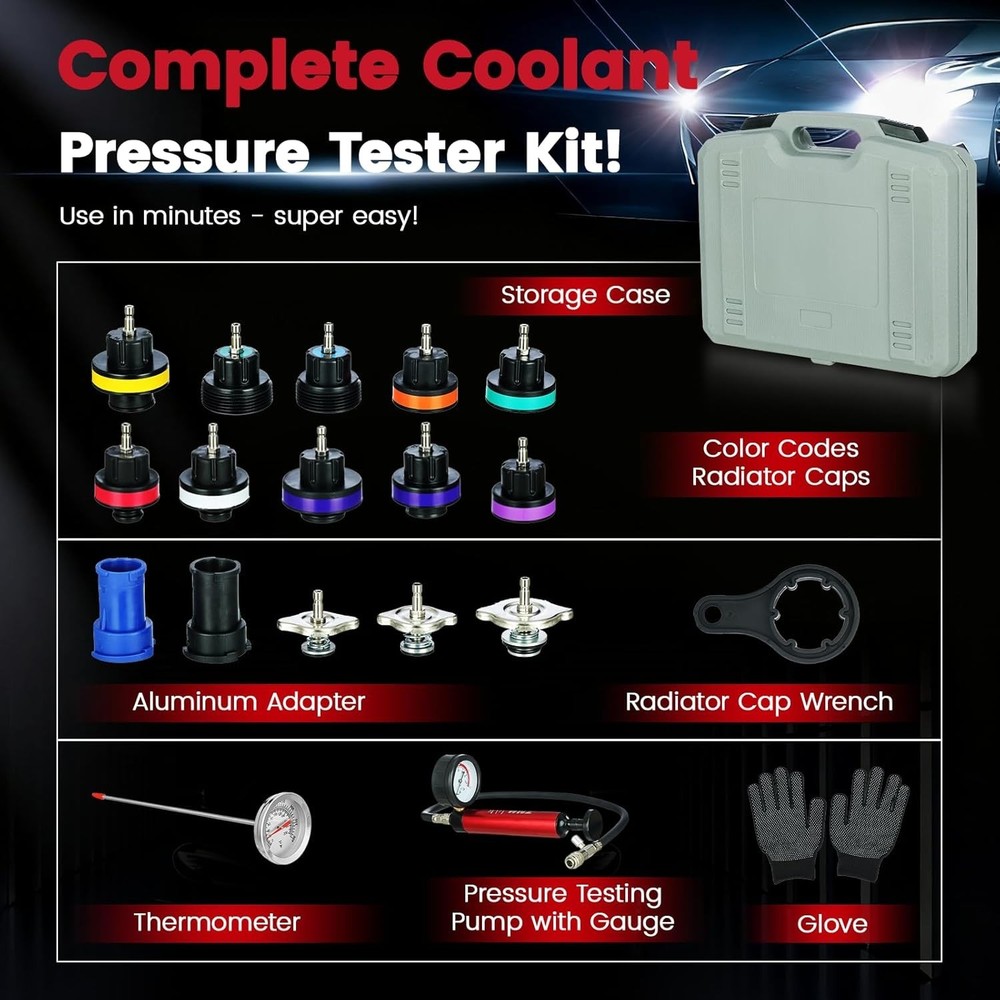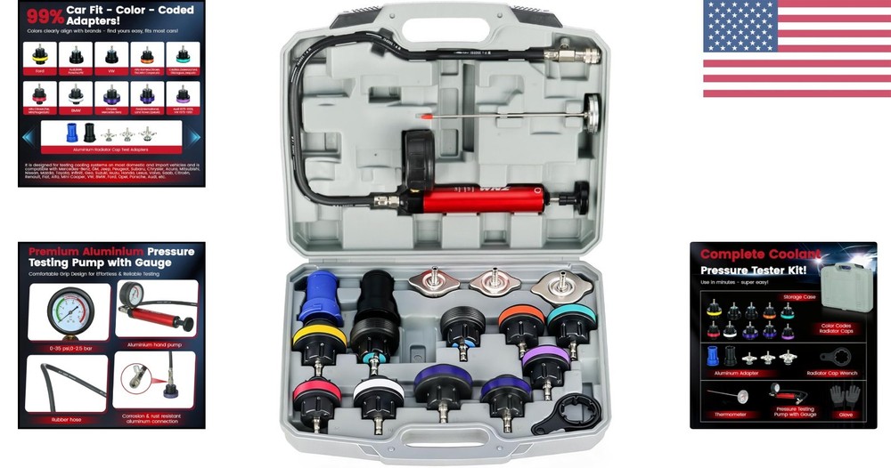 Heavy-Duty 18PC Cooling System Pressure Tester Kit - Durable & Portable Solution ‹ › ‹ › ‹ › ‹ › ‹ › ‹ › ‹ › ‹ › ‹ › Heavy-Duty 18PC Cooling System Pressure Tester Kit Your durable and portable solution for all cooling system needs. Key Features: Multi-Function: Quickly detects leaks in radiators and cooling systems while removing air bubbles to prevent overheating. Perfect for both DIY enthusiasts and professionals. Heavy-Duty Quality: Built to resist wear, corrosion, and high pressure, ensuring reliable vacuum effects and lasting performance. Outlasts cheaper plastic alternatives, ideal for frequent use on cars, trucks, and SUVs. 18PC Complete Set: Includes 13 universal caps compatible with 99%+ of U.S., Japanese, and European vehicle makes/models, along with a manual pressure pump, thermometer, universal caps wrench, and 2 universal cap adapters. Easy Storage & Portable Design: Packaged in a thick, impact-resistant blow-molded toolbox with custom slots for each component, keeping your tools organized and protected. Lightweight with sturdy handles for easy transport. Intuitive Operation: No professional experience required! Features clear indicators and a straightforward manual pump design—simply attach the correct cap, pump to pressure, and identify leaks in seconds. Why Choose Our 18PC Cooling System Pressure Tester Kit? Whether you're a car enthusiast or a professional mechanic, this kit simplifies radiator and cooling system diagnostics. With its robust design and comprehensive accessories, you can trust this tool for reliable results and efficient repairs. Don't let leaks lead to costly repairs—get your Heavy-Duty Cooling System Pressure Tester Kit today and ensure your vehicle's cooling system operates flawlessly! Shipping Free & Fast Shipping - We offer free shipping to most of the USA with a normal delivery time of 3-7 days. However, due to the current situation, additional delivery time (up to 3 weeks) may be required for some items. Alternative Carriers - We may use alternative carriers (e.g. USPS, FedEx, UPS, etc.) to ensure your package arrives safely and on time. Due to the use of multiple carriers, we are unable to provide a tracking number automatically. Handling Time - Orders are processed and shipped within 1-2 business days of receiving cleared payment. Shipping Restrictions - Shipping to Alaska, Hawaii, Puerto Rico, Guam, and other US territories may incur shipping charges or delivery restrictions. Please contact us before ordering, or your order can be refunded/cancelled. State Restrictions - There may be restrictions based on your state of purchase. For example, certain items may not be shipped to California due to state regulations. Contact for Tracking Updates - If you require tracking updates or have any concerns about the delivery of your order, please feel free to contact us, and we will be happy to assist you. Return 30-Day Hassle-Free Returns - We want you to be completely satisfied with your purchase. If you are not, you can return the item within 30 days of receiving it for a full refund or exchange. Easy Return Process - To start a return, simply contact us and we will provide you with a prepaid return shipping label and detailed instructions. Restocking Fee - There are no restocking fees for returns. However, the buyer is responsible for return shipping costs if the return is not due to a seller's error. Refund Processing Time - Refunds will be processed within 5 business days of receiving the returned item in its condition. Payment We accept all major credit cards, PayPal, and Apple Pay for your convenience. Your payment information is secure and encrypted to ensure a safe and seamless transaction. Please complete your payment within 3 days of purchase to avoid any delays in shipping. Feedback Your feedback is extremely important to us. We strive to provide the best products and customer service possible. If you are satisfied with your purchase, please take a moment to leave us a positive review. If you have any concerns or issues with your order, please contact us before leaving negative feedback. We are committed to resolving any problems and ensuring your satisfaction. Contact Us If you have any questions or concerns, please feel free to out to our customer support team. You can contact us through the eBay messaging system. We are available Monday to Friday, 9:00 am to 5:00 pm EST, and we will do our best to respond to your inquiry within 24 hours. Buy it now and enjoy a pleasant shopping experience! Manufacturer Part Number: Coolant Pressure Tester Kit Unit Quantity: 6.49 OBD Interface: Coolant Pressure Tester Kit Supported System: Coolant Pressure Tester Kit Type: Coolant Pressure Tester Kit : Coolant Pressure Tester Kit