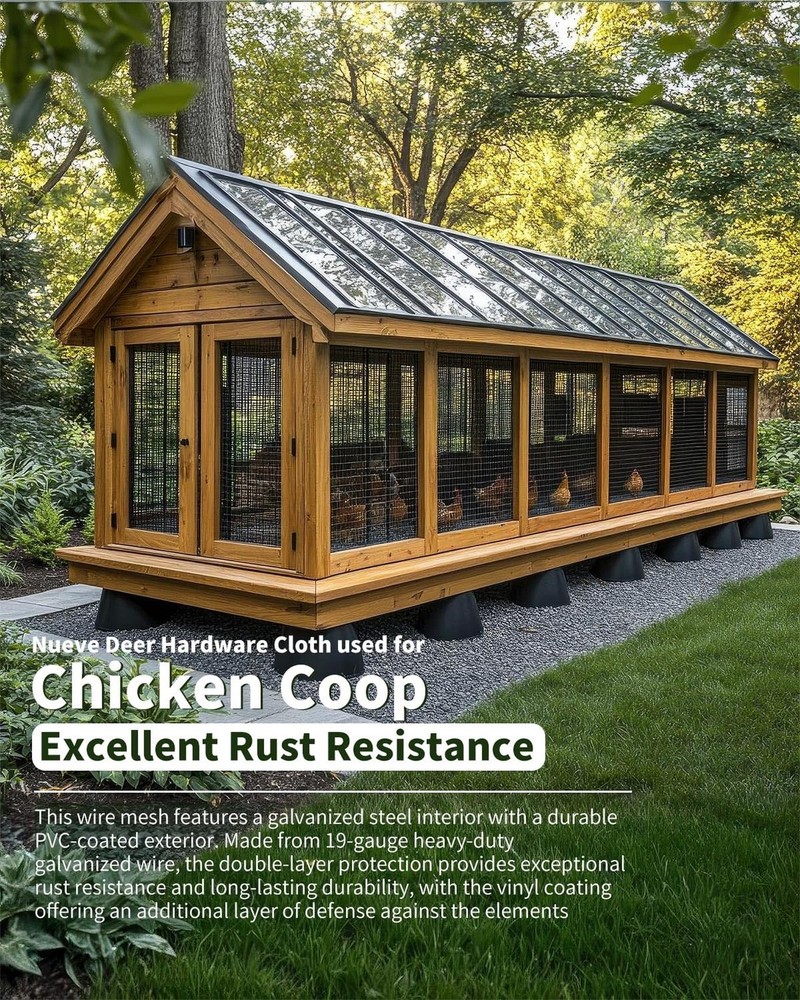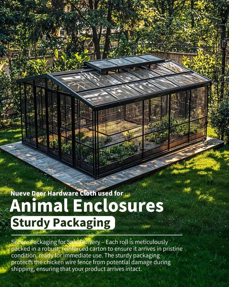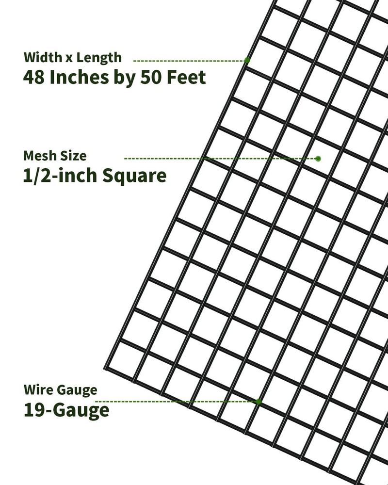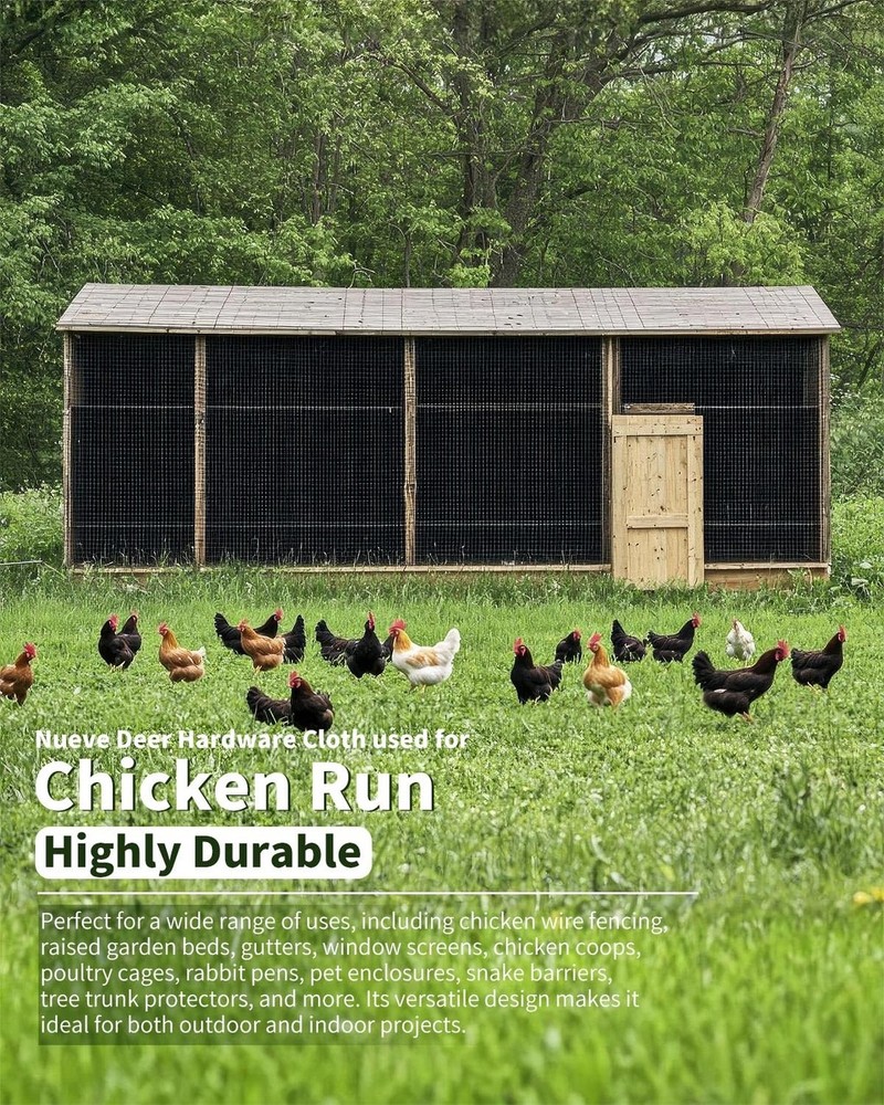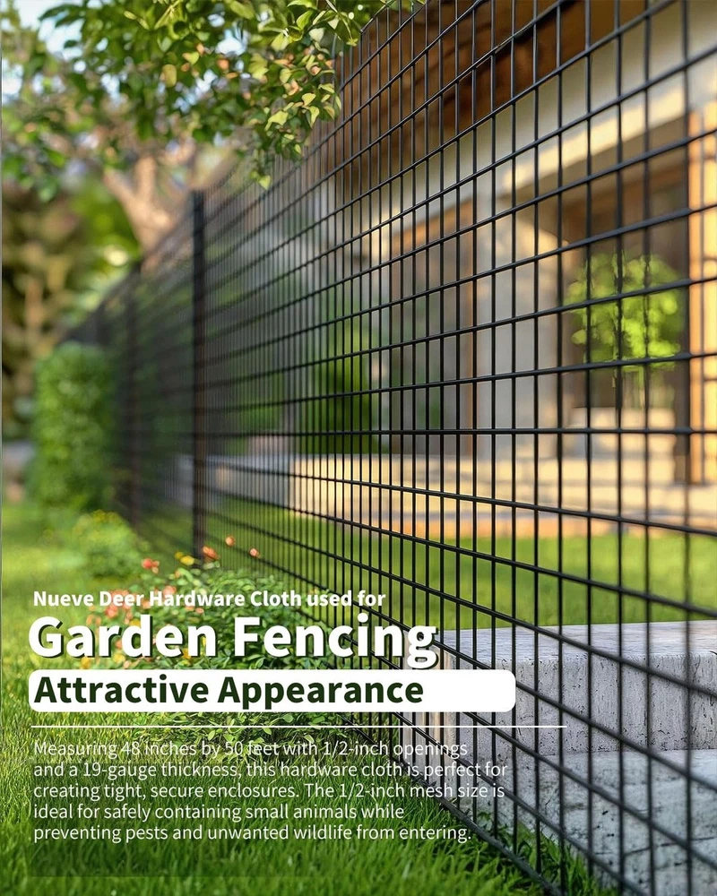 Hardware Cloth 1/2 inch 48'' x 50' 19 Gauge, Chicken Wire Fence Roll, Chicken Wire Mesh, Garden Fencing, Wire Fencing, Hardware Mesh, Cage Wire, Vinyl Fencing, Tree Fence Product Details Size Name: 1/2inch 48''x50' Brand: Nueve Deer MPN: B19G-HC-48x50 UPC: Does not apply EAN: Does not apply Manufacturer: Nueve Deer Item Weight: 24.4 pounds Package Dimensions: 48.3 x 8 x 7.3 inches Item model number: B19G-HC-48x50 Size: 1/2inch 48''x50' Color: Black Material: Iron Included Components: Hardware Cloth Roll x 1 Batteries Included?: No Batteries Required?: No Date First Available: March 16, 2022 Durable Construction with Double Coating This wire mesh features a galvanized steel interior with a durable PVC-coated exterior. Made from 19-gauge heavy-duty galvanized wire, the double-layer protection provides exceptional rust resistance and long-lasting durability, with the vinyl coating offering an additional layer of defense against the elements Versatile for Various Applications Perfect for a wide range of uses, including chicken wire fencing, raised garden beds, gutters, window screens, chicken coops, poultry cages, rabbit pens, pet enclosures, snake barriers, tree trunk protectors, and more. Its versatile design makes it ideal for both outdoor and indoor projects Secure Packaging for Safe Delivery Each roll is meticulously packed in a robust, reinforced carton to ensure it arrives in pristine condition, ready for immediate use. The sturdy packaging protects the chicken wire fence from potential damage during shipping, ensuring that your product arrives intact Optimal Size and Strong Mesh Measuring 48 inches by 50 feet with 1/2-inch openings and a 19-gauge thickness, this hardware cloth is perfect for creating tight, secure enclosures. The 1/2-inch mesh size is ideal for safely containing small animals while preventing pests and unwanted wildlife from entering