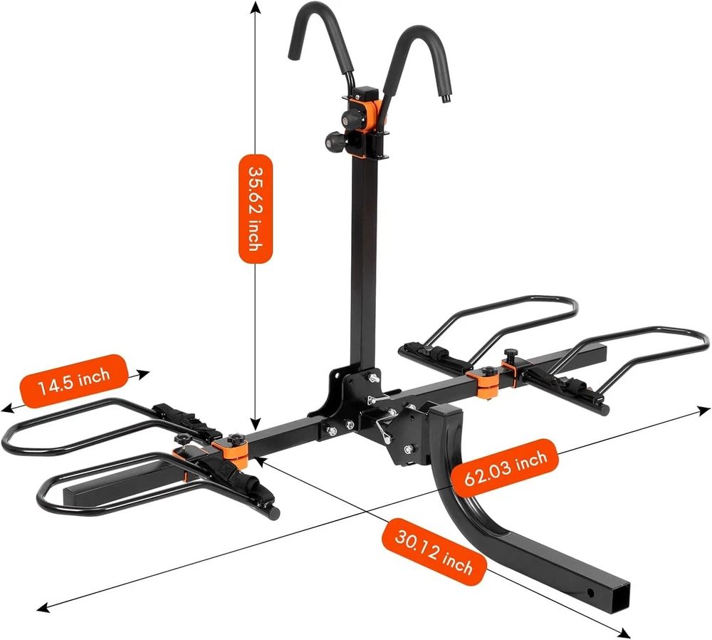 Brand Soarify Item dimensions L x W x H 30.12 x 62.03 x 35.62 inches Load Capacity 140 POUNDS Mounting Type HITCH MOUNT Manufacturer SOARIFY Vehicle Service Type Car Material Alloy Steel Item Weight 34 Pounds Is Foldable Yes About this item đ´ăHEAVY-DUTY CONSTURCTIONă: Built with high-strength alloy steel to support up to 140 lbs, accommodating two bikes of various sizes and types, including eBikes, mountain bikes, and road bikes. đ´ăEASY ASSEMBLY & INSTALLATIONă: Simple assembly with minimal tools required. The rack can be installed and removed quickly and effortlessly. Compatible with standard 2-inch hitch receivers, fitting most cars, SUVs, and trucks. đ´ăTILT-DOWN FEATUREă: Convenient tilt-down mechanism allows for easy access to the rear of the vehicle without removing the bikes. đ´ăANTI-THEFT ROATATION LOCKă: Features a robust anti-theft rotation lock system that prevents unauthorized removal and enhances security. đ´ăFOLDABLE DESIGNă: When not in use, the rack folds up neatly against the vehicle to save space and avoid interference.