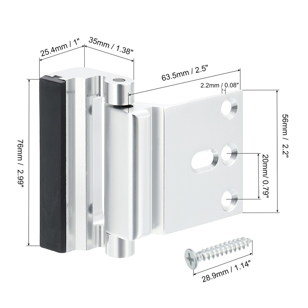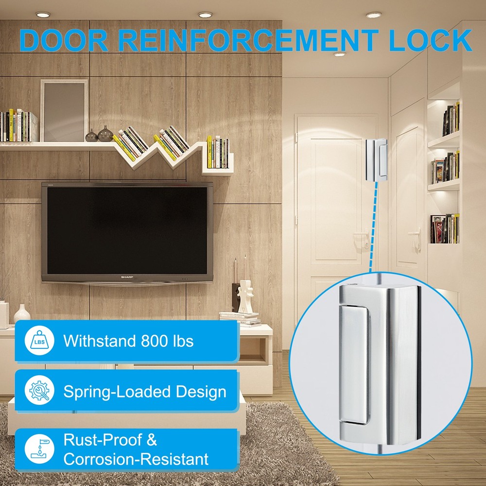 Document The high-security door reinforcement locks help prevent doors from being knocked away, enhancing your home security and keeping you and your family safe! Make sure none of the doors can be opened from the outside.SpecificationColor: SilverMaterial: aluminum AlloyMaximum Withstand Capacity: 800 LbsMounting Plate Size: 63.5 x 56 x 1.95 mm/ 2.5 x 2.2 x 0.08 inch (L*W*Thickness)Lock Part Size: 76 x 25.4 x 35 mm/ 2.99 x 1 x 1.38 inch (L*W*H)Screw Mounting Distance: 20mm/ 0.79 inchScrew Length: 28.9mm/ 1.14 inchPacking List: 1 x Door Reinforcement Lock with 4 ScrewsAdvantage1. The security door lock is made of aluminum alloy with electroplating technology on the surface, which is rust-proof, moisture-proof, corrosion-resistant, comfortable to touch, durable, and has a long service life.2. The home anti-theft door lock is a tamper-resistant, child-safe lock that prevents unauthorized entry through lock bumping. Designed to withstand up to 800 pounds of force when opening an interior door, it enhances home security and prevents doors from being knocked away, keeping your family safe.InstructionEquipped with 4 pieces of 28.9mm(1.13") screws and operation manual to help ensure an easy and quick installation.To unlock, pinch the top and bottom of the door lock. Then slide the lock sideways along the door towards the hinge direction until it can be pulled outward.NOTE: Please measure the door plate thickness before ordering. Home Security Door Lock Aluminum Reinforcement Lock Withstand 800Lbs Silver The high-security door reinforcement locks help prevent doors from being knocked away, enhancing your home security and keeping you and your family safe! Make sure none of the doors can be opened from the outside. Specification Color: Silver Material: aluminum Alloy Maximum Withstand Capacity: 800 Lbs Mounting Plate Size: 63.5 x 56 x 1.95 mm/ 2.5 x 2.2 x 0.08 inch (L*W*Thickness) Lock Part Size: 76 x 25.4 x 35 mm/ 2.99 x 1 x 1.38 inch (L*W*H) Screw Mounting Distance: 20mm/ 0.79 inch Screw Length: 28.9mm/ 1.14 inch Packing List: 1 x Door Reinforcement Lock with 4 Screws Advantage 1. The security door lock is made of aluminum alloy with electroplating technology on the surface, which is rust-proof, moisture-proof, corrosion-resistant, comfortable to touch, durable, and has a long service life. 2. The home anti-theft door lock is a tamper-resistant, child-safe lock that prevents unauthorized entry through lock bumping. Designed to withstand up to 800 pounds of force when opening an interior door, it enhances home security and prevents doors from being knocked away, keeping your family safe. Instruction Equipped with 4 pieces of 28.9mm(1.13") screws and operation manual to help ensure an easy and quick installation. To unlock, pinch the top and bottom of the door lock. Then slide the lock sideways along the door towards the hinge direction until it can be pulled outward. NOTE: Please measure the door plate thickness before ordering. Hot Item Payment 1.We accept eBay payment . 2.Payment must be received within 7 business days of auction closing. Shipping 1.We ship to your eBay or Paypal address. Please make sure your eBay and Paypal address is correct before you pay. 2.Items will be shipped within 1-3 business day when we received payment. 3.Delivery time depends on destination and other factors. Description Policy Home Security Door Lock Aluminum Reinforcement Lock Withstand 800Lbs Silver The high-security door reinforcement locks help prevent doors from being knocked away, enhancing your home security and keeping you and your family safe! Make sure none of the doors can be opened from the outside. Specification Color: Silver Material: aluminum Alloy Maximum Withstand Capacity: 800 Lbs Mounting Plate Size: 63.5 x 56 x 1.95 mm/ 2.5 x 2.2 x 0.08 inch (L*W*Thickness) Lock Part Size: 76 x 25.4 x 35 mm/ 2.99 x 1 x 1.38 inch (L*W*H) Screw Mounting Distance: 20mm/ 0.79 inch Screw Length: 28.9mm/ 1.14 inch Packing List: 1 x Door Reinforcement Lock with 4 Screws Advantage 1. The security door lock is made of aluminum alloy with electroplating technology on the surface, which is rust-proof, moisture-proof, corrosion-resistant, comfortable to touch, durable, and has a long service life. 2. The home anti-theft door lock is a tamper-resistant, child-safe lock that prevents unauthorized entry through lock bumping. Designed to withstand up to 800 pounds of force when opening an interior door, it enhances home security and prevents doors from being knocked away, keeping your family safe. Instruction Equipped with 4 pieces of 28.9mm(1.13") screws and operation manual to help ensure an easy and quick installation. To unlock, pinch the top and bottom of the door lock. Then slide the lock sideways along the door towards the hinge direction until it can be pulled outward. NOTE: Please measure the door plate thickness before ordering. Hot Item Payment 1.We accept eBay payment . 2.Payment must be received within 7 business days of auction closing. Shipping 1.We ship to your eBay or Paypal address. Please make sure your eBay and Paypal address is correct before you pay. 2.Items will be shipped within 1-3 business day when we received payment. 3.Delivery time depends on destination and other factors.