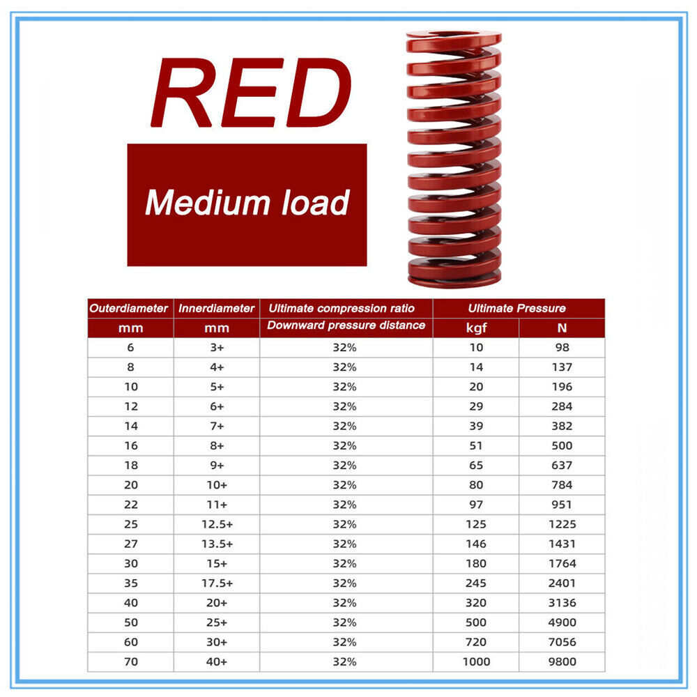 Product description Specifications: Features - Rectangular die springs have the following characteristics: Rectangular die springs have the characteristics of small size, good elasticity, high stiffness, high precision, rectangular material, surface color separation spraying (electroplating) to distinguish different loads, and beautiful appearance. Applications - Die springs are widely used in stamping dies, metal die-casting molds, plastic molds and other elastic motion of precision machinery and equipment, automobiles and other fields. Yellow and blue are mainly used for plastic mold assembly, and red, green and brown are mainly used for hardware assembly. Color:Red Outside diameter:8 - 50mm Inner diameter:4 - 25mm Length (height):15 - 300mm