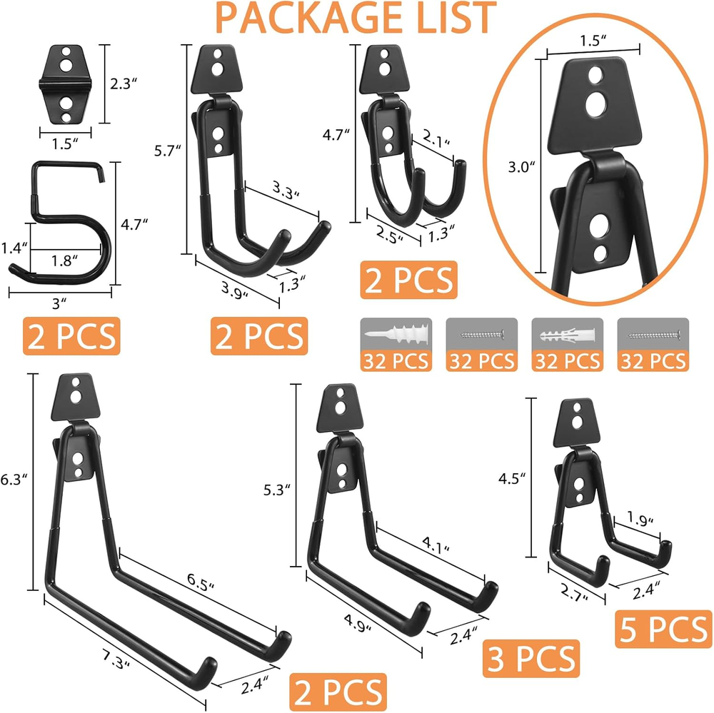 Store New Arrivals Add to Favorite View Feedback Contact Garage Hooks for Hanging Heavy Duty, Embedded Welded Utility Hooks, 16 Pack Assorted Wall Racks, Storage Organizer Brackets for Shed Yard Tool Ladder Bike Hose Broom Mounting, with Screws and Anchors Description Item model number CC-GH-A01 Part Number CC-GH-A01 Item dimensions L x W x H 9.64 x 6.89 x 3.74 inches Finish Pvc,Steel Mounting Type Wall Mount Item Package Quantity 1 Special Feature Heavy Duty Material Steel, PVC Batteries Required? No Maximum Weight Recommendation 77 Pounds Item Weight 4.77 pounds Number of Hooks 16 Batteries Included? No Recommended Uses For Product Utility, Garage, Heavy Duty, Outdoor Surface Recommendation Plaster, Wood, Concrete, Brick Special Features Heavy Duty Finish Type Pvc,Steel Product Dimensions 9.64 x 6.89 x 3.74 inches Sturdy Storage Hooks: The tubular double hooks of 5.9mm steel with PVC coating include multiple sizes - Large L hook x 2, Medium L hook x 3, Small L hook x 5, Medium J hook x 2, Small J hook x 2, S hook x 2. Come with all the necessary hardware for mounting. Updated Construction: These wall hooks securely welded behind the mounting piece get structural integrity, protect hangers under external forces, and avoid accidental disconnection. Reliable for heavy-duty applications. Installation: These wall hangers work for plaster / wooden / concrete / brick walls. 33lbs for plaster wall, 66lbs for wooden wall, 77lbs for concrete and brick walls. You can use them on garages, sheds, basements, garden fences, pillars, and doors for indoor or outdoor tool organization. Solution for Big Heavy Items: These utility hangers are a must-have for your garage to save floor space. The assortment of hooks helps your hanging up different stuff on the wall, like bicycles, strollers, fishing rods, shovels, folding chairs, extension cords, hoses, power tools, and garden / sports equipment. Freely Wall Storage: Installation of hooks is independent so that you can design the distance between each other according to various sizes of objects and convenience attempts. LIGHT DUST provides different options for your multiple needs. Product Description Hooks for Hanging Heavy Duty Wall Hangers Bike Rack Garage Organization Tool Storage The garage ladder hooks create efficient storage space. Compared to single hooks, our wall hook has two holes that can easily hold weight and hang most items. These garage storage system hooks can be used as a garden lawn tool, ladder, hose storage rack organizer, and more. Flat Garage Wall Hooks Heavy Duty Garage Accessories Garage Tool Organizer Black Shelving Assortment Large L Hook Length of the short side: 6.5 inches Length of the long side: 7.3 inches Height: 6.3 inches Medium L Hook Length of the short side: 4.1 inches Length of the long side: 4.9 inches Height: 5.3 inches Small L Hook Length of the short side: 1.9 inches Length of the long side: 2.7 inches Height: 4.5 inches Curved Garage Hooks Ladder Hanger Tool Hook for Garage Wall Heavy Duty Garage Hooks for Hanging Medium J Hook Length of the short side: 3.3 inches Length of the long side: 3.9 inches Height: 5.7 inches Small J Hook Length of the short side: 2.1 inches Length of the long side: 2.5 inches Height: 4.7 inches S Hook Length of S Hook: 3.0 inches Height of S Hook: 4.7 inches Tool Organizers and Storage Utility Garage Wall Mount Hooks for Hanging Bike, Ladder and Garden Tools These utility hooks are a must-have for saving floor space in your garage. The garage hooks assortment helps you hang different things on the wall such as bikes, fishing rods, shovels, folding chairs, extension cords, hoses, power tools, ladders, lawn trimmers, gardening equipment, and garden/sports equipment. The garage wall hooks can be used anywhere you need them, such as garages, shops, sheds, gardens, warehouses, basements, and more. The LIGHT DUST garage hanging hooks keep everything organized and clear at a glance. ABOUT US We offer the best prices around on high quality products. Our E-store includes media such as books, movies, music and games while offering electronics, toys, sporting apparel, clothing, tools, general home, garden items and more. SHIPPING We are always working hard to ensure your package arrives as soon as possible. Please understand that some factors like weather, high postal traffic, and the performance of shipping companies are outside of our control. We offer free shipping to the lower 48 states and ship within 2 business days of payment, usually sooner. We do not accept P.O. Boxes. Please provide a physical address. For shipping outside of the continental USA, we only use eBay's Global Shipping Program.The item is shipped to KY and then sent to the rest of the world. International customers are responsible for all duties and taxes. Continue to check out in order to calculate costs for shipping the item to your country. Messages regarding eBay's Global Shipping Program MUST be directed at eBay EXCLUSIVELY. RETURNS We offer a 30-Day Return Policy on items which you are not completely satisfied with. You have the option for a full-refund or an exchange of the item. No returns are available on items shipped outside of the USA. PAYMENT We accept PayPal. CONTACT US This page content is yet to come Please ad us to your favorite seller and visit again later Thank You CUSTOMER SATISFACTION We try our very best to make sure every customer is completely satisfied. If there's a problem, message us! We're happy to help. WE ACCEPT Copyright © 2021 AutoDS. | All Rights Reserved