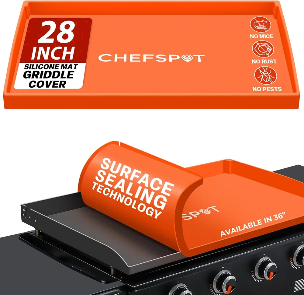 Heavy-duty food-grade silicone; durable and resilient, withstands extreme temperatures and resists wear and tear Protects your griddle; silicone cover prevents rust and extends lifespan by fully enveloping the side walls for thorough protection Protects your griddle; silicone cover prevents rust and extends lifespan by fully enveloping the side walls for thorough protection. Please, ensure you never leave the mat on when firing up the Blackstone griddle. Reusable and easy to clean; simply wash with soap and water or place in the dishwasher for hassle-free maintenance Keeps griddle clean and dry between uses; ensure griddle is clean and moisture-free before covering for next use Product Description CHEFSPOT Silicone Griddle Mat Protective Cover for 28" Blackstone Griddle Ever worry about rust or dust shortening the life of your favorite griddle? The 28" CHEFSPOT Silicone Griddle Mat Cover is your solution. This durable silicone griddle cover shields your griddle from the elements, extending its lifespan and making it a must-have Blackstone griddle accessory. Full Coverage Protection for your 28 Inch Blackstone Griddle Our silicone griddle cover offers complete wall-to-wall protection. Say goodbye to rust, dust, and water damage. Easy cleaning - just remove the mat and wipe down your griddle for a pristine surface every time. This Blackstone griddle accessory is a must-have for any grilling enthusiast! A Must Have Blackstone Griddle Accessory! Stop worrying about rusting and corrosion of your griddle, because we have the perfect accessory designed with precise dimensions to cover the entire surface of your griddle. Our griddle cover extends its coverage to the side walls, offering a complete shield, ensuring comprehensive protection Precise Fit & Quality Materials Crafted from premium food-grade silicone, our griddle mat is built to last. Its high-strength yet soft and flexible material not only protects your griddle but also promotes its longevity. Say goodbye to worries about rusting and corrosion – our griddle mat has got you covered. The Ultimate Protection for your Blackstone Griddle Full Coverage Protection Experience complete protection with our griddle mat cover, safeguarding your 28 Inch Blackstone Griddle from rust, corrosion, water, dust, and pests Effortless Cleaning Cleaning has never been easier! Our griddle mat cover can be effortlessly wiped clean or even placed in the dishwasher for hassle-free maintenance Compact Convenience Effortlessly store our griddle mat cover thanks to its foldable design. Compact and convenient, it's perfect for any space, anytime Durable Silicone Construction Our griddle mat cover boasts durable silicone construction, ensuring longevity and reliability for your cooking adventures Protect your Blackstone Long Term Transform your Blackstone griddling adventures with our CHEFSPOT Griddle Mat Cover. From full coverage protection to effortless cleaning, our durable silicone construction ensures longevity while the compatible cutout seamlessly integrates with Blackstone's hard cover 1 2 3 Is the silicone cover compatible with Blackstone griddles? Yes, it's an exact fit for the original Omnivore griddle plate. It also fits the updated version, though not perfectly due to higher side walls—but it still protects the cooking surface effectively. We're working on a new model for a perfect fit! Can you use the griddle mat cover with the Blackstone hood cover? Yes, our silicone griddle cover is designed to work with most Blackstone hood covers. It fits underneath to provide a seal without interfering with the hood. Can you cook on top of griddle cover? No, the silicone cover is not meant for cooking. It's designed to protect your griddle surface when not in use, not to withstand direct flames or high cooking temps. Does the silicone mat help prevent rust? Yes, it creates a moisture-resistant barrier that helps protect your griddle surface from rust, dust, rodents and bugs when not in use. How do I clean the silicone griddle cover? Just rinse with warm soapy water or place it in the dishwasher. The non-stick silicone surface makes cleaning quick and easy.